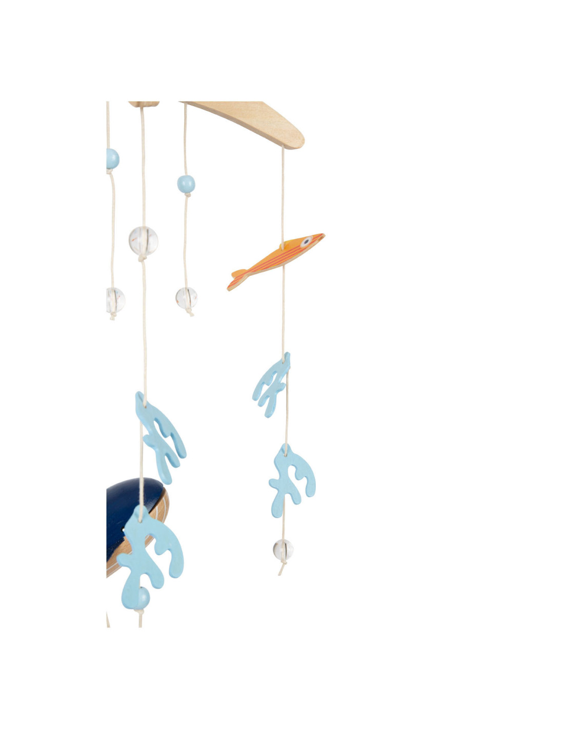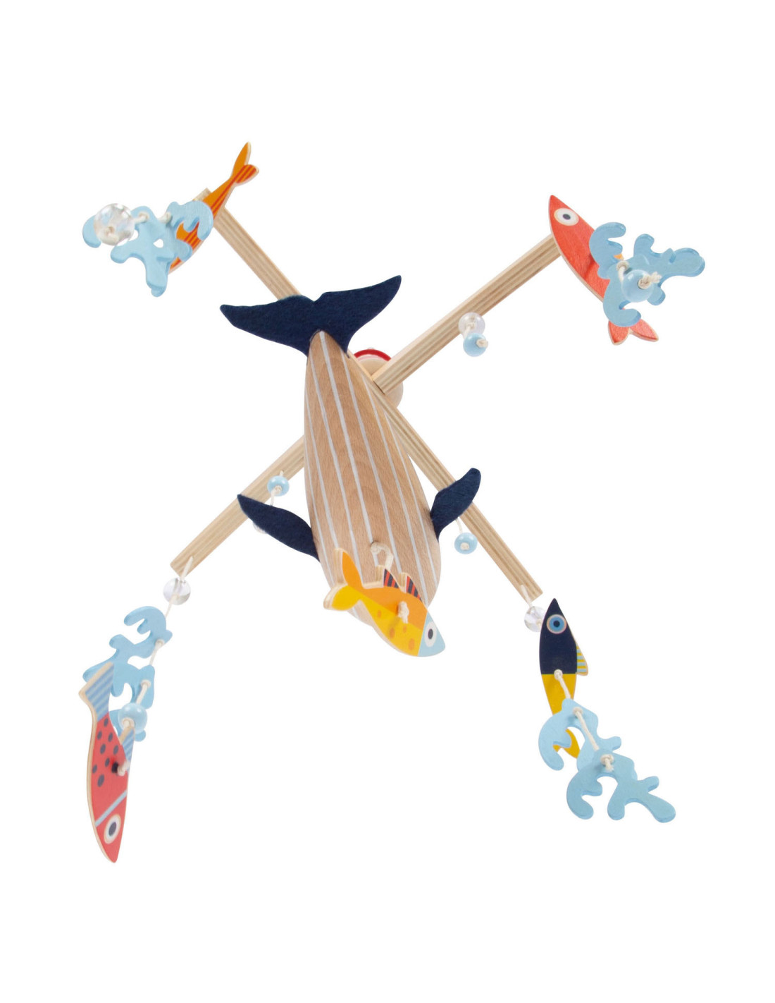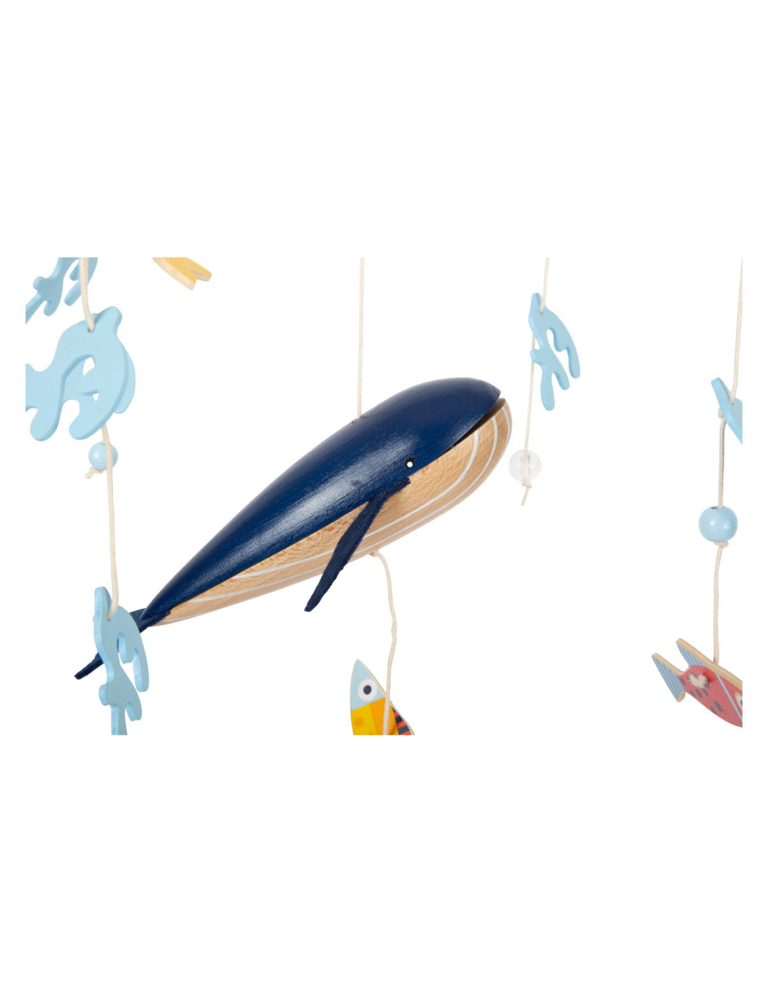 Een houten 3D-mobiel in zeethema, waarmee kinderen kunnen duiken in de spannende onderwaterwereld van de blauwe vinvis! Tussen de algen en luchtbellen zwemmen vissen in felle kleuren rond. De grote walvis zwemt rustig in het midden van de mobiel met zijn vilten vinnen en trekt de aandacht van iedereen. Wanneer het boven het babybed of de commode wordt gemonteerd, moedigt het baby's aan om verwonderd te kijken en weg te dromen!