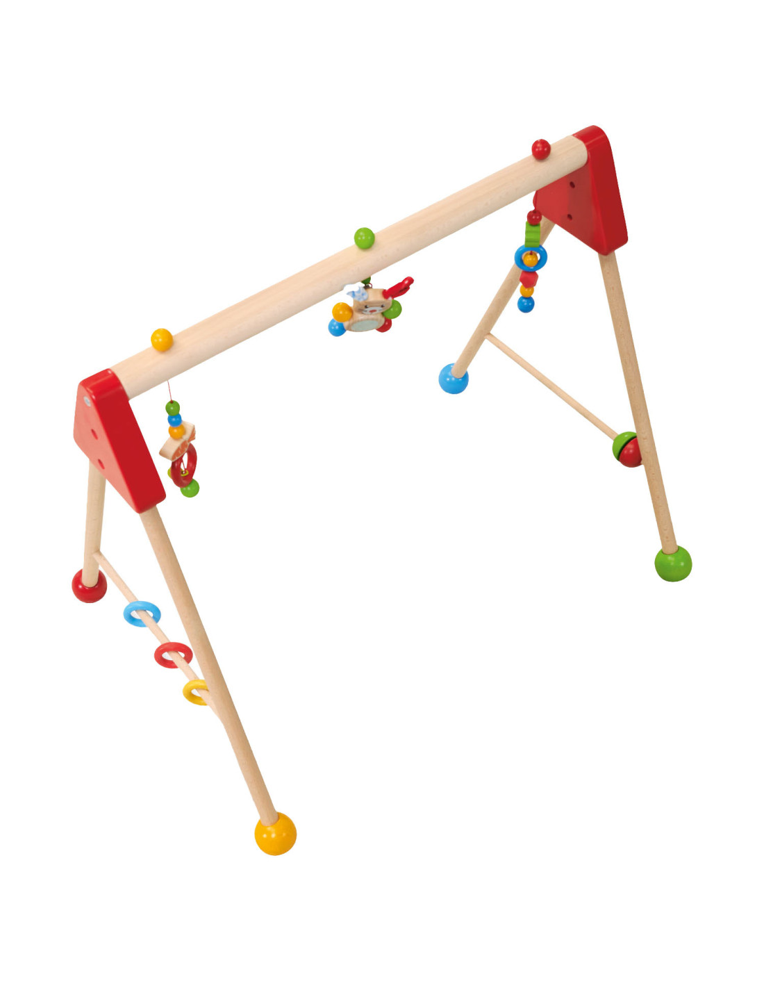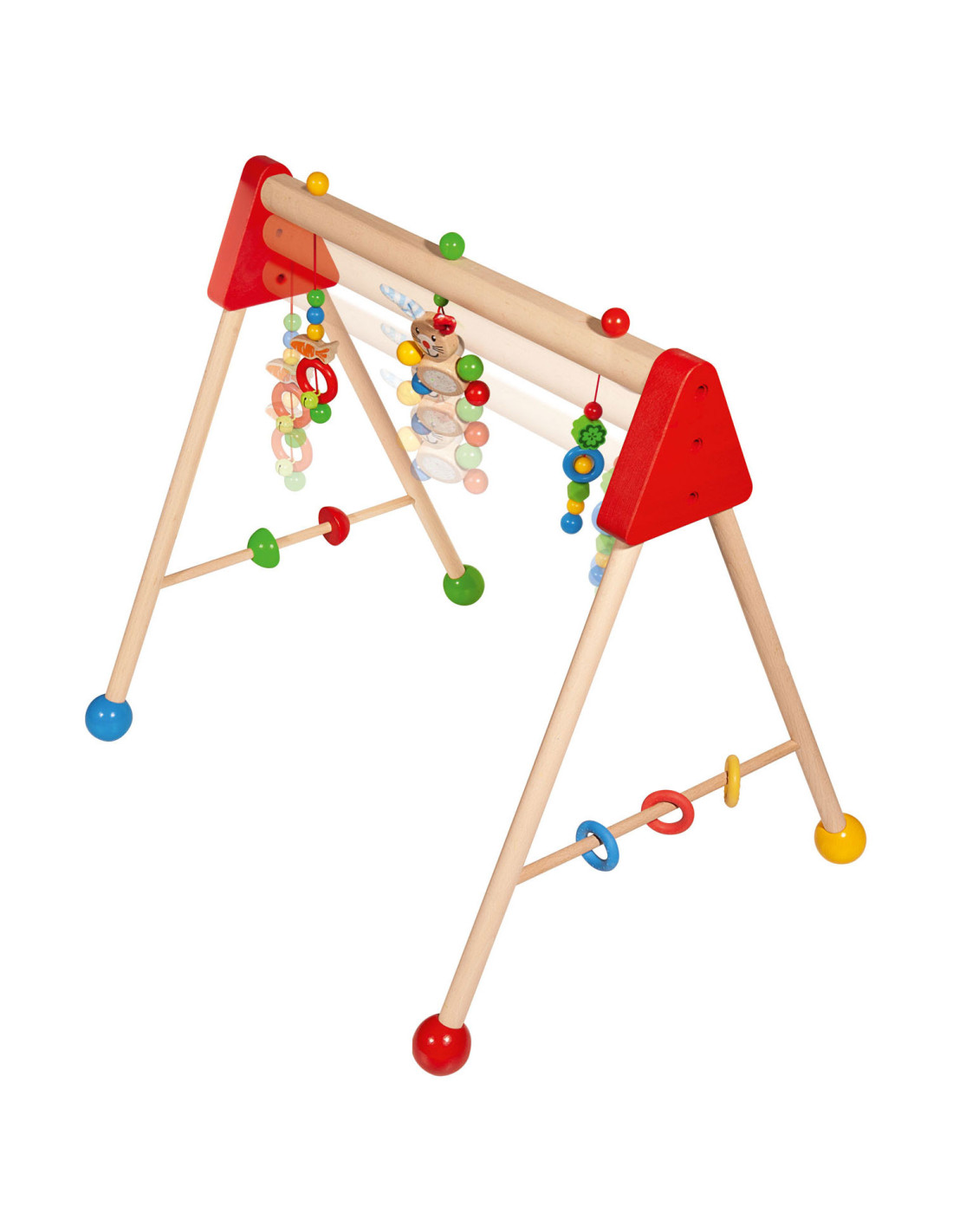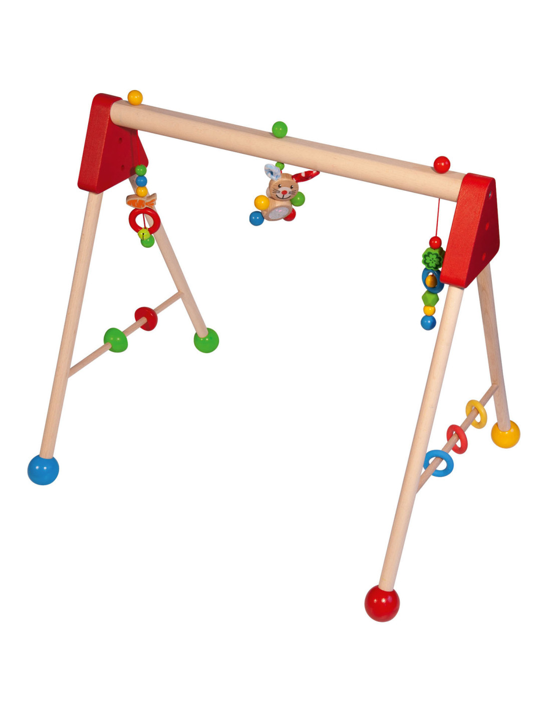 Kleurrijke Eichhorn Baby speelboog met speelactiviteiten en geluiden, waarmee vaardigheden als grijpen, reactievermogen en concentratie getraind worden. Aan de speelboog hangen drie speeltjes om vast te pakken, elk met een andere spannende functie: een belletje, verschillende materialen om te voelen en een schattig konijntje met pluche oren. Aan de zijkanten zitten draaiende elementen en siliconen bijtringen, waar kleine baby's mee kunnen spelen. De speelboog heeft een afmeting van 46 x 52 x 60 cm. Bovendien kan de hoogte eenvoudig en snel in drie stappen worden aangepast, naar 42 cm, 46 cm of 50 cm. Zo groeit de speelboog met je kindje mee! Gemaakt van 100% FSC® hout uit duurzame bosbouw. Geschikt voor kinderen vanaf 3 maanden.