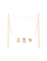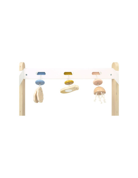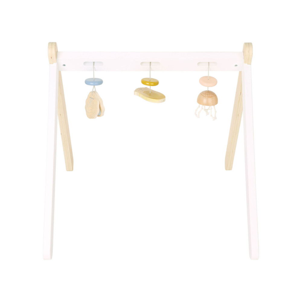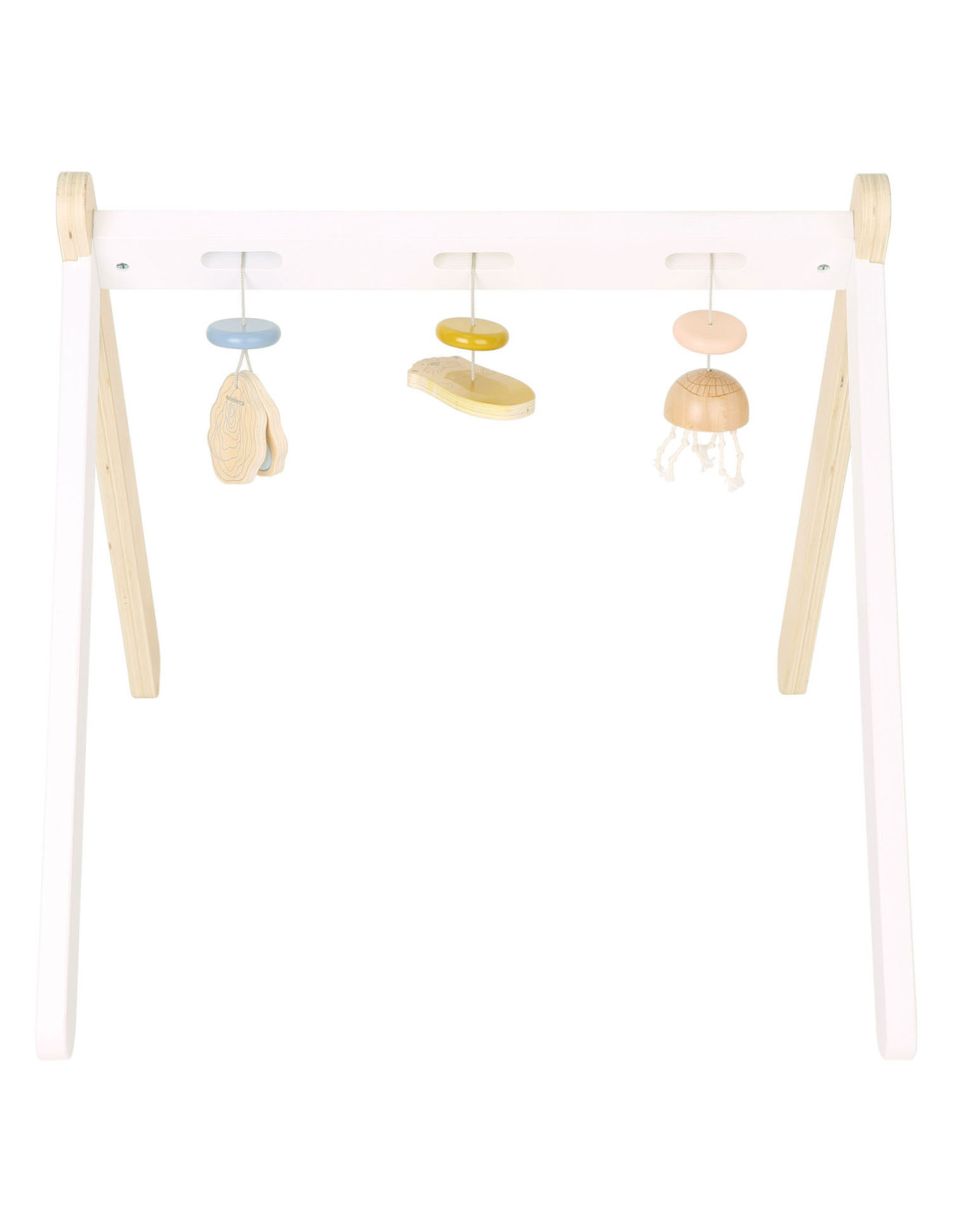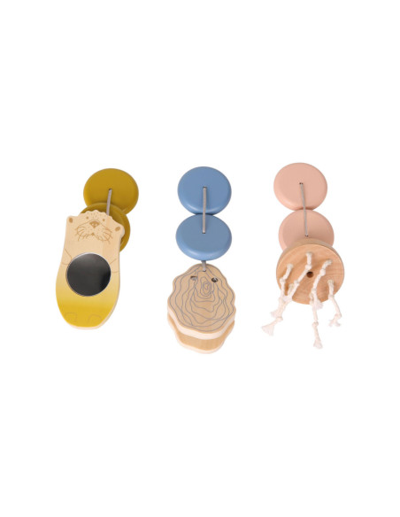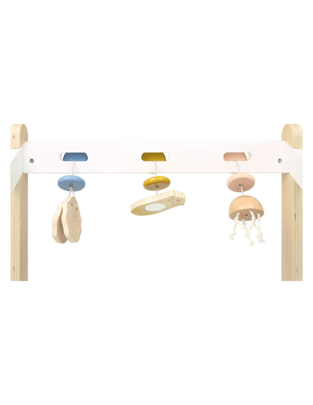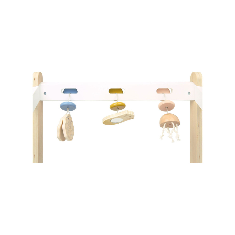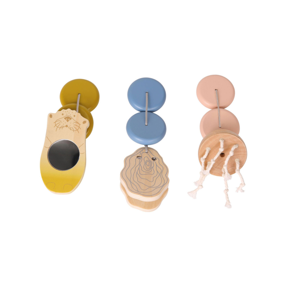 Deze moderne babygym is gemaakt van hout en heeft allerlei leuke prikkels te bieden: een zeeotter met spiegel waarin het kind zichzelf kan zien, een kwal met touwtje als tentakels om aan te raken en te voelen, en een gekke oester die klettert als een castagnet en maakt akoestische stimuli. Het subtiele ontwerp samen met de natuurlijke materialen, zachte vormen en delicate maar trendy kleuren rokerig blauw, mosterdgeel en oudroze bieden leeftijdsgeschikt entertainment zonder overstimulatie. De accessoires kunnen eenvoudig worden verwisseld door de bevestigingsschijven te plaatsen.
