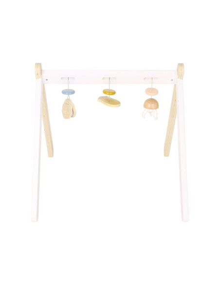 Dankzij het hoge aandeel zichtbaar houtmateriaal is het een absolute blikvanger en verstandig eerste speeltje voor vermaak en ter versterking van de motoriek bij liggende baby's: de zeeotter, oester en kwal kunnen zonder gereedschap aan de drie sleuven worden bevestigd door ze erin te steken door. En dit is goed om te weten: de driedimensionale speelelementen zijn vooral voor liggende baby’s goed te zien! De speelboog is eenvoudig te monteren dankzij de in elkaar grijpende zijstukken en twee schroeven.