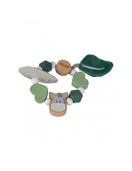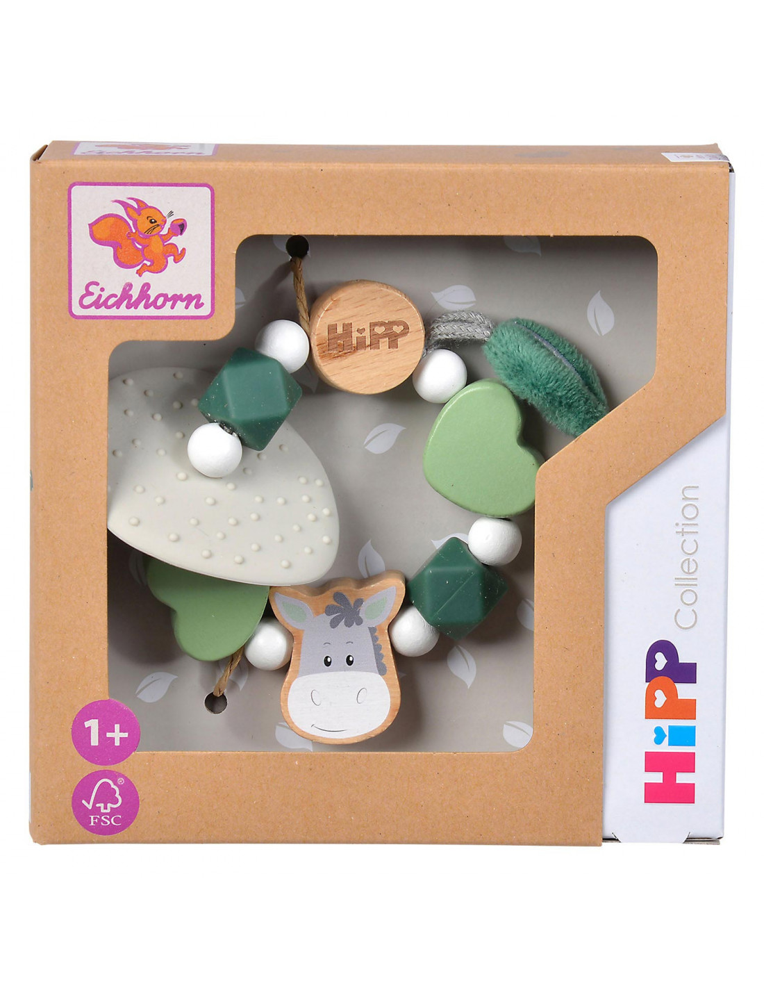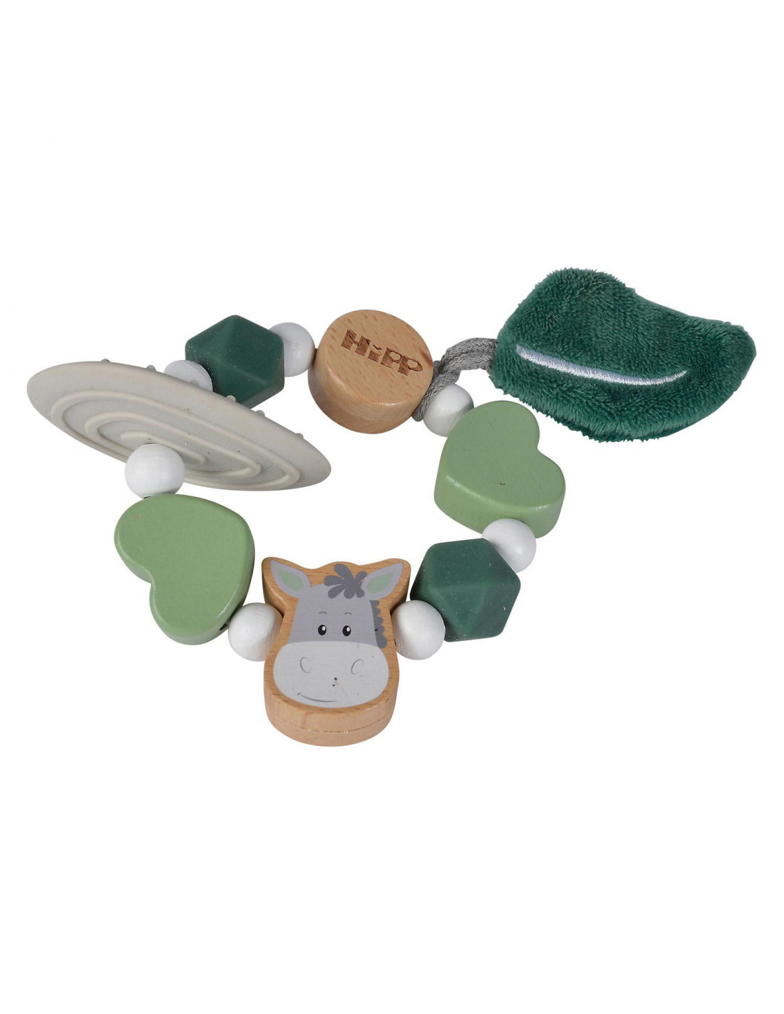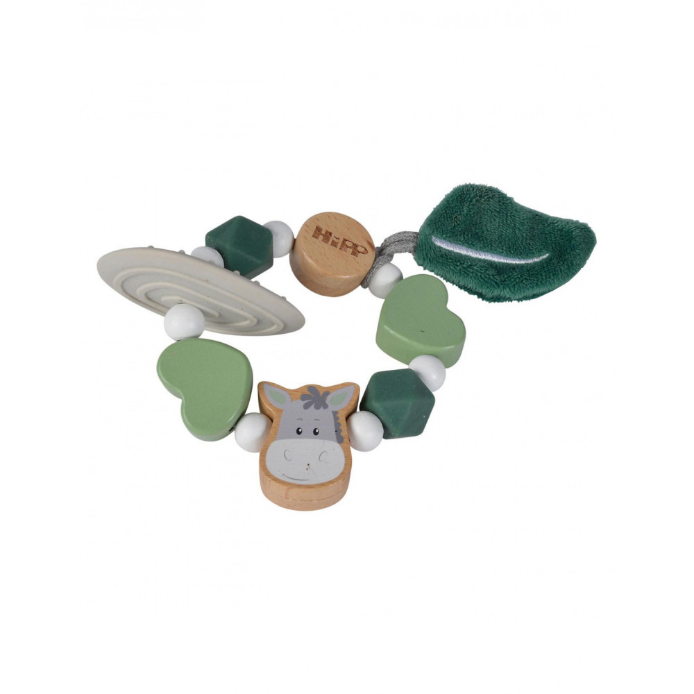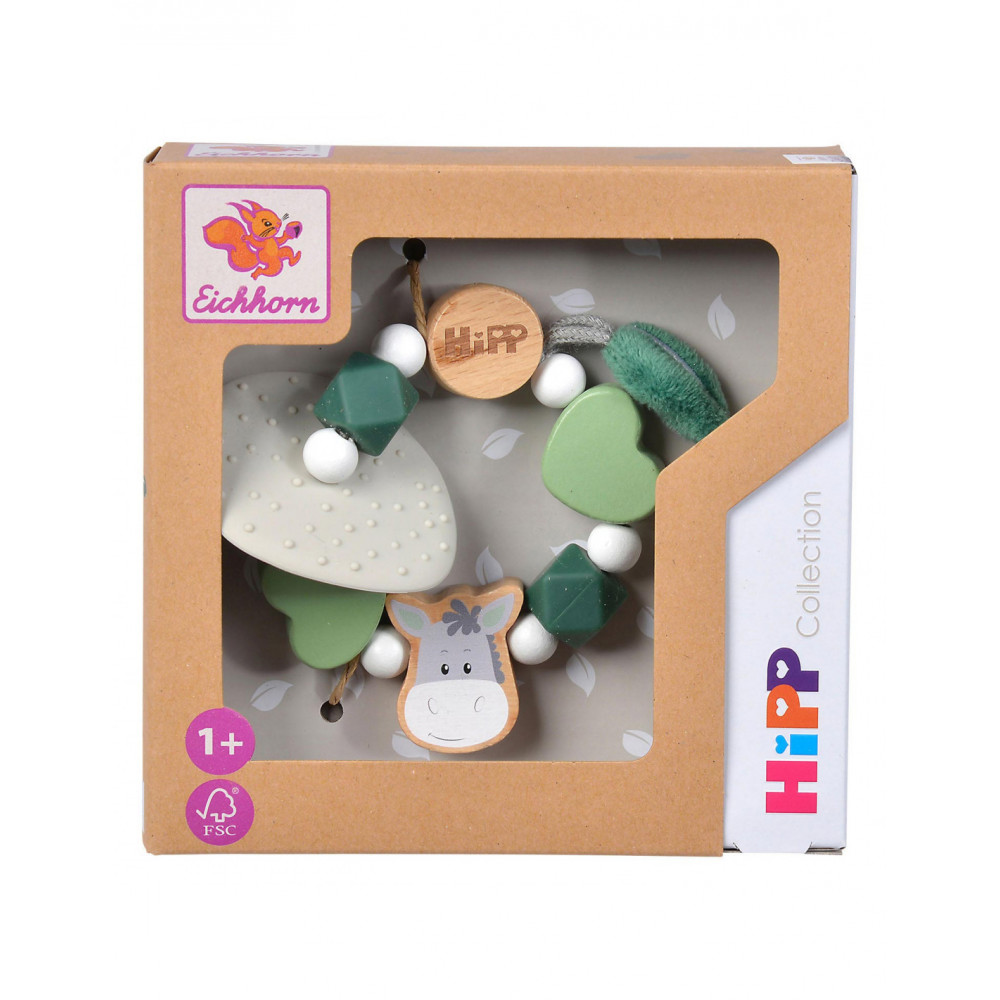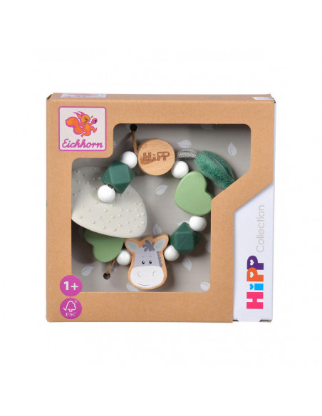 Houten bijtring van Eichhorn Baby HIPP met groene, sensorische kralen. Deze groene bijtring is gemaakt van beukenhout (100% FSC®) en silicone. Geschikt voor kinderen vanaf 1 jaar oud.