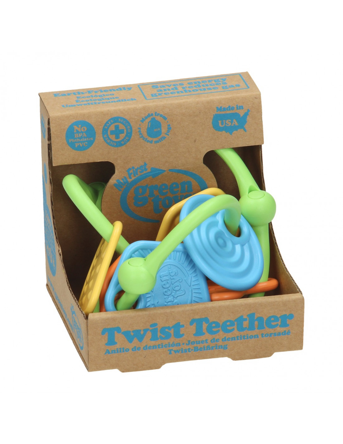Schud, rammel en ontdek met de Green Toys kronkel bijtring. De twist bijtring is gemakkelijk vast houden door kleine babyhandjes. Iedere unieke vorm aan de ring is voorzien van een andere structuur. BPA, PVC en Ftalaten vrij.