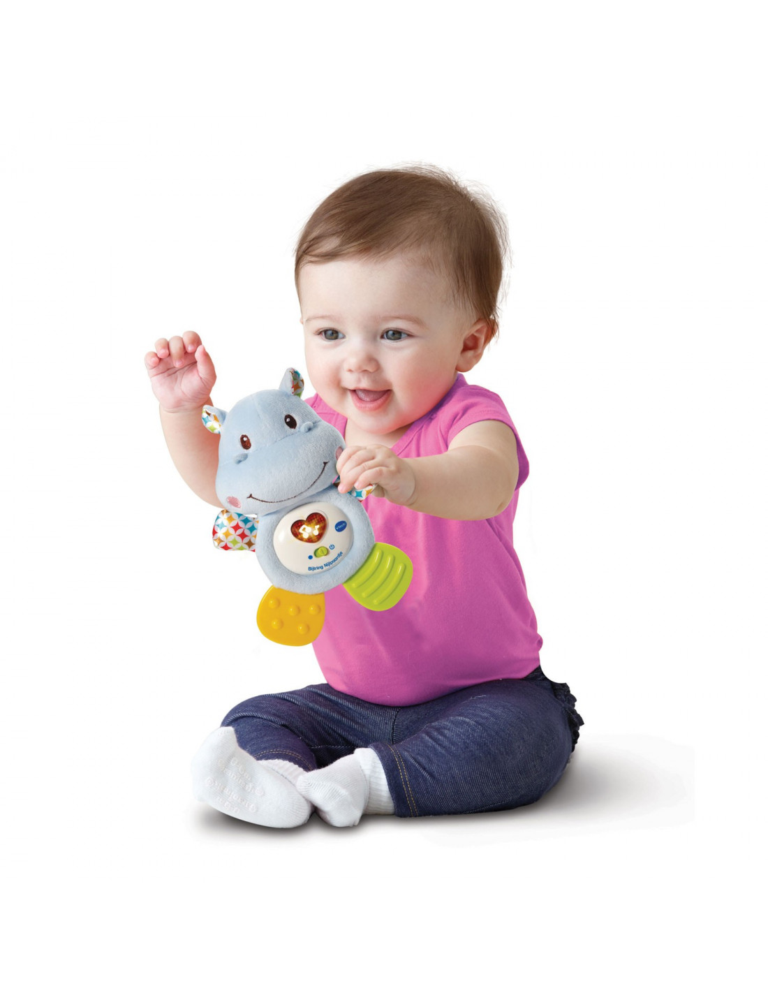De twee bijtringen verlichten de pijn bij het doorkomen van de tandjes en het nijlpaardje zorgt voor volop knuffel- en speelplezier! Druk op de knipperende hart-toets om grappige geluiden, vrolijke zinnetjes, gezongen liedjes en melodietjes te horen. De verschillende texturen stimuleren de tastzin.