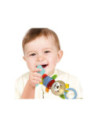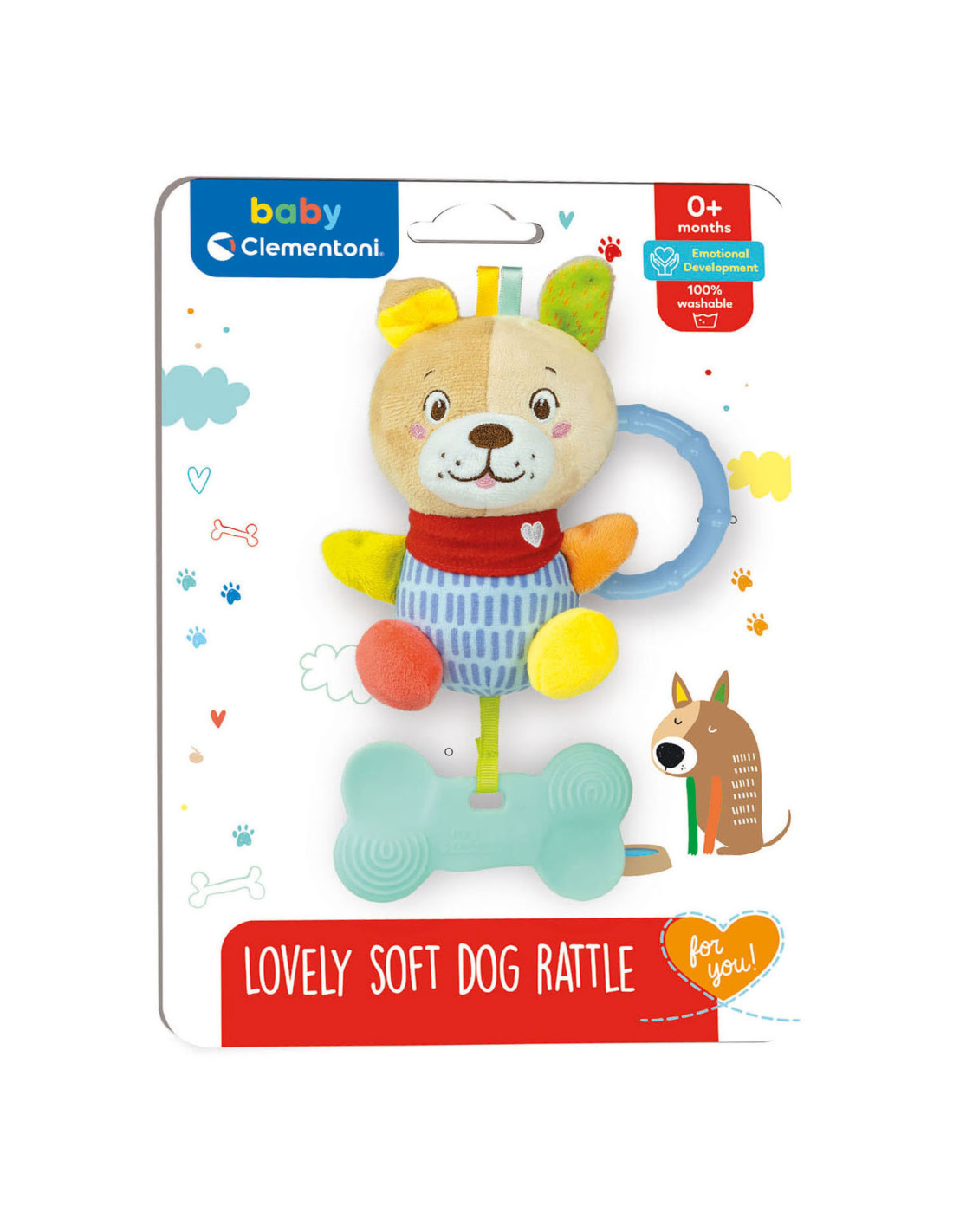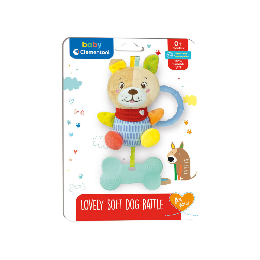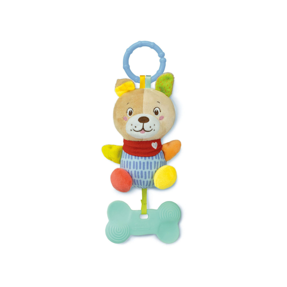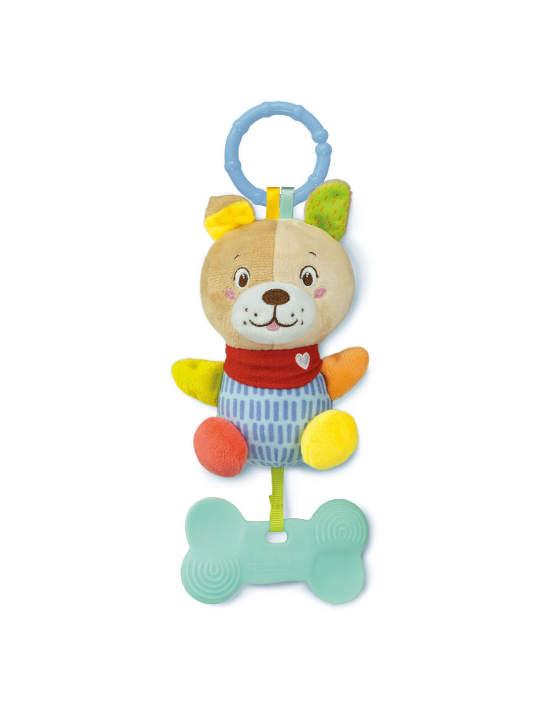 Pluchen rammelaar in de vorm van een hondje, met rubberen bijtspeeltje voor doorkomende tandjes. Machinewasbaar en geschikt voor kinderen vanaf de geboorte. Afmetingen: 18 x 25 x 6 centimeter.