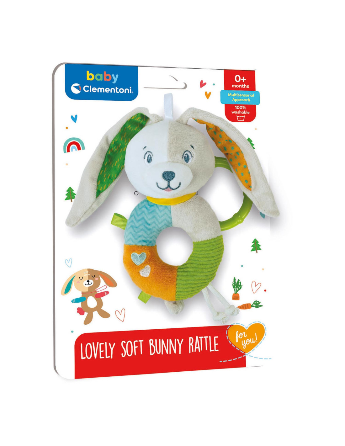 Pluchen konijn rammelaar van Clementoni Baby, groen, oranje, blauw en wit gekleurd. De rammelaar is 18 bij 25 bij 6 cm groot.