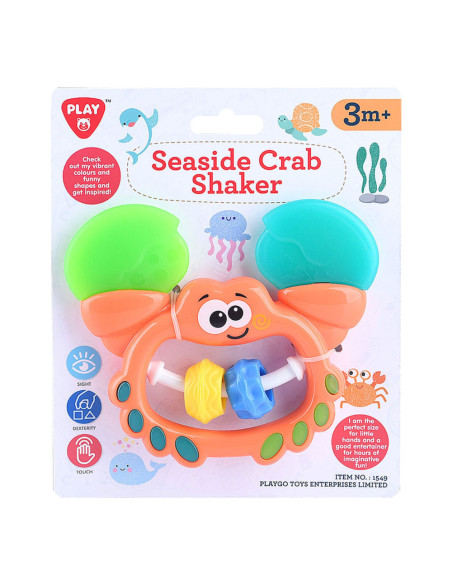 Rammelspeeltje in de vorm van een krab voor baby's vanaf 3 maanden. Het speeltje heeft 2 sensorische kralen en zijn scharen zijn geschikt om te gebruken als bijtspeeltje. Gemaakt van kunststof.