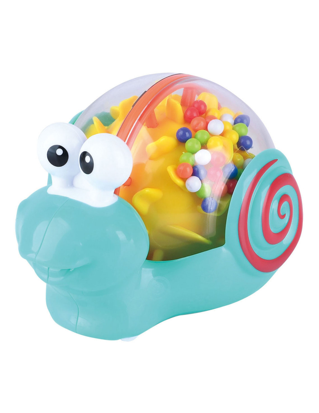 Ratelslak die dankzij de kleine balletjes in het huisje vrolijk ratelt terwijl je hem vooruitduwt. Afmetingen: 11 x 8 x 8 centimeter.