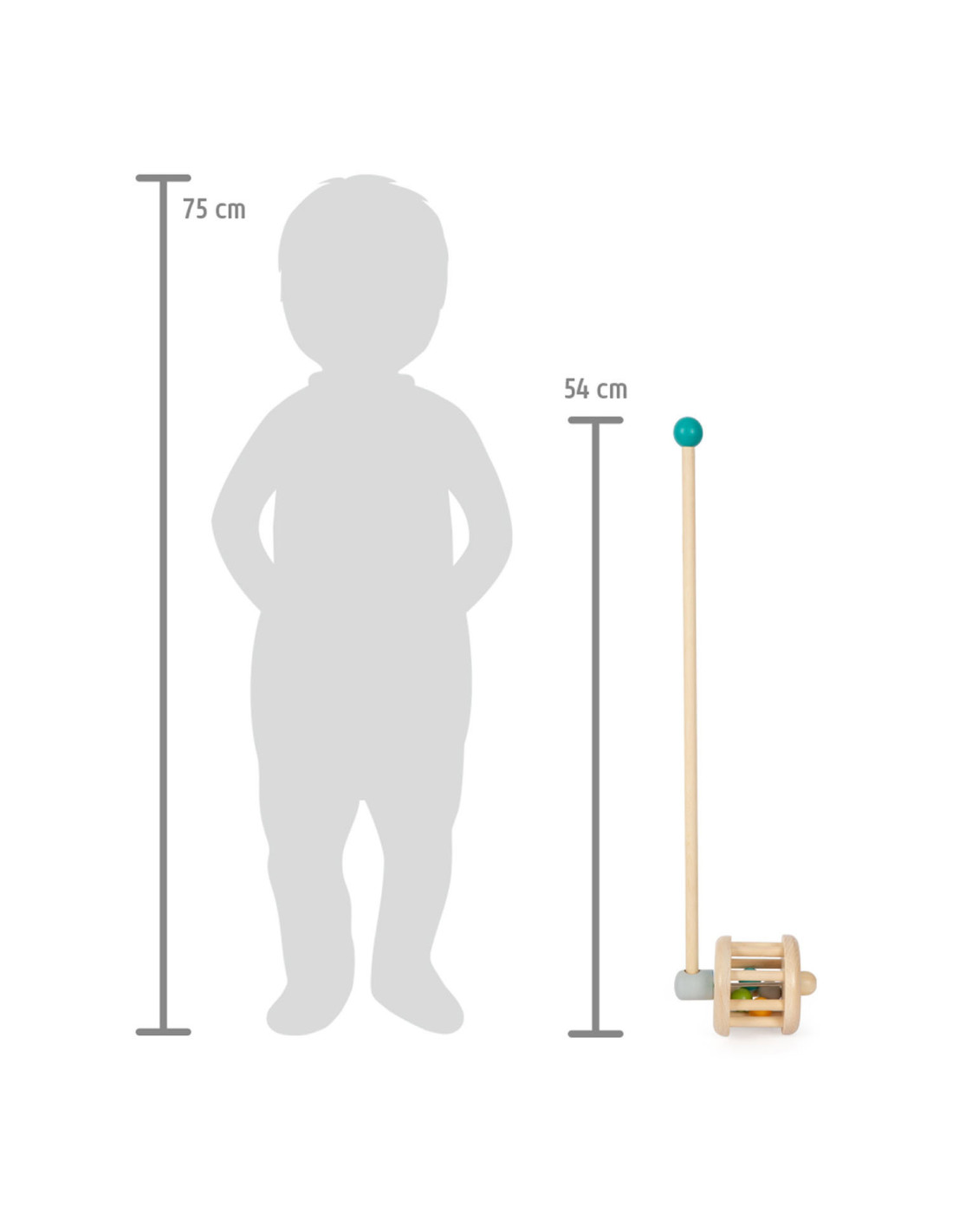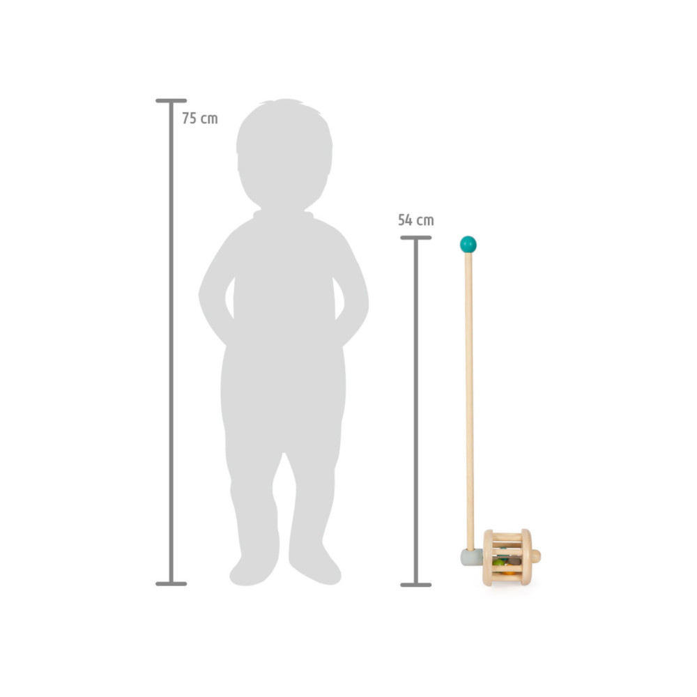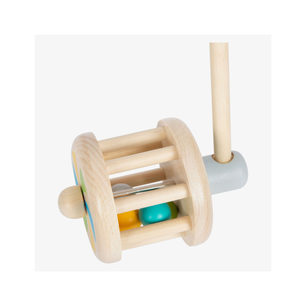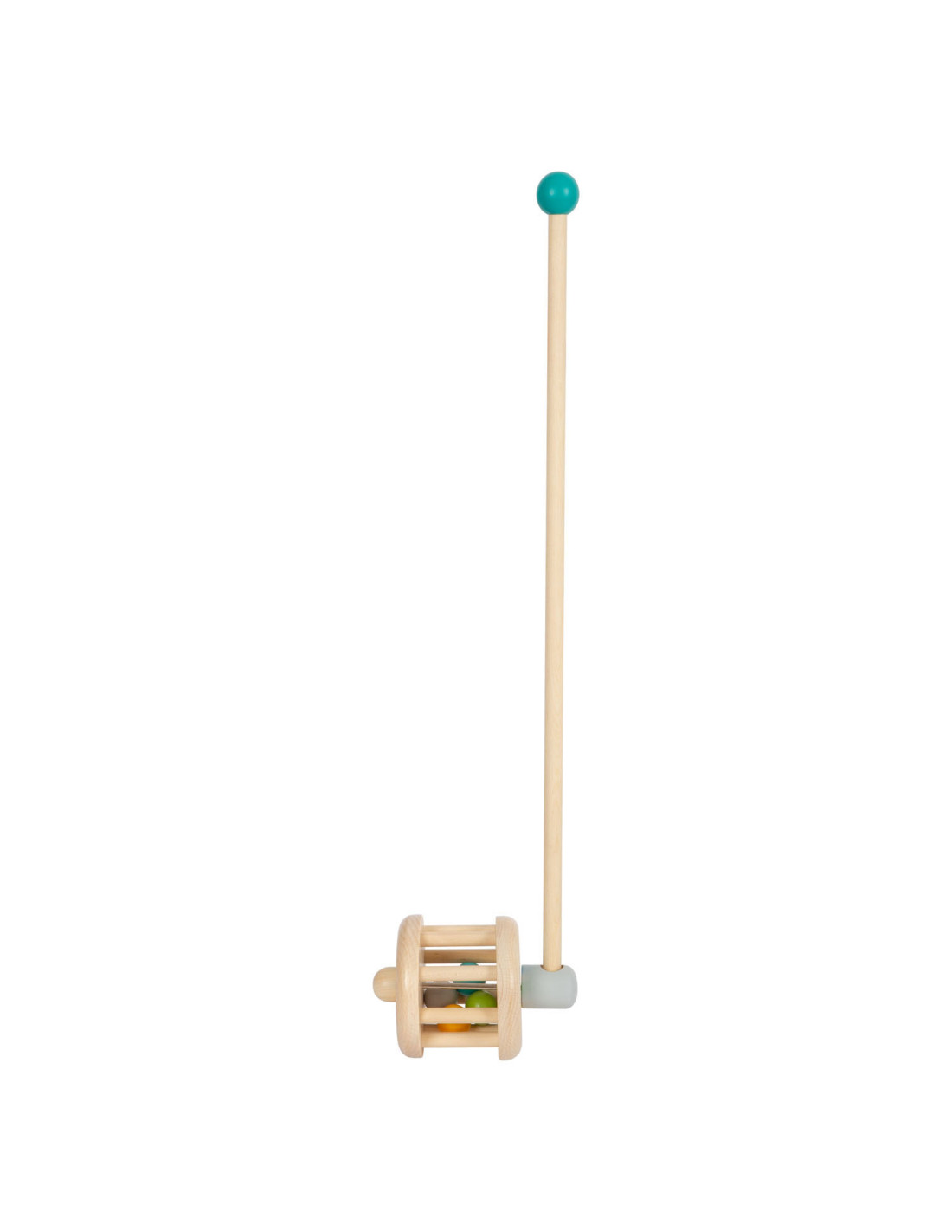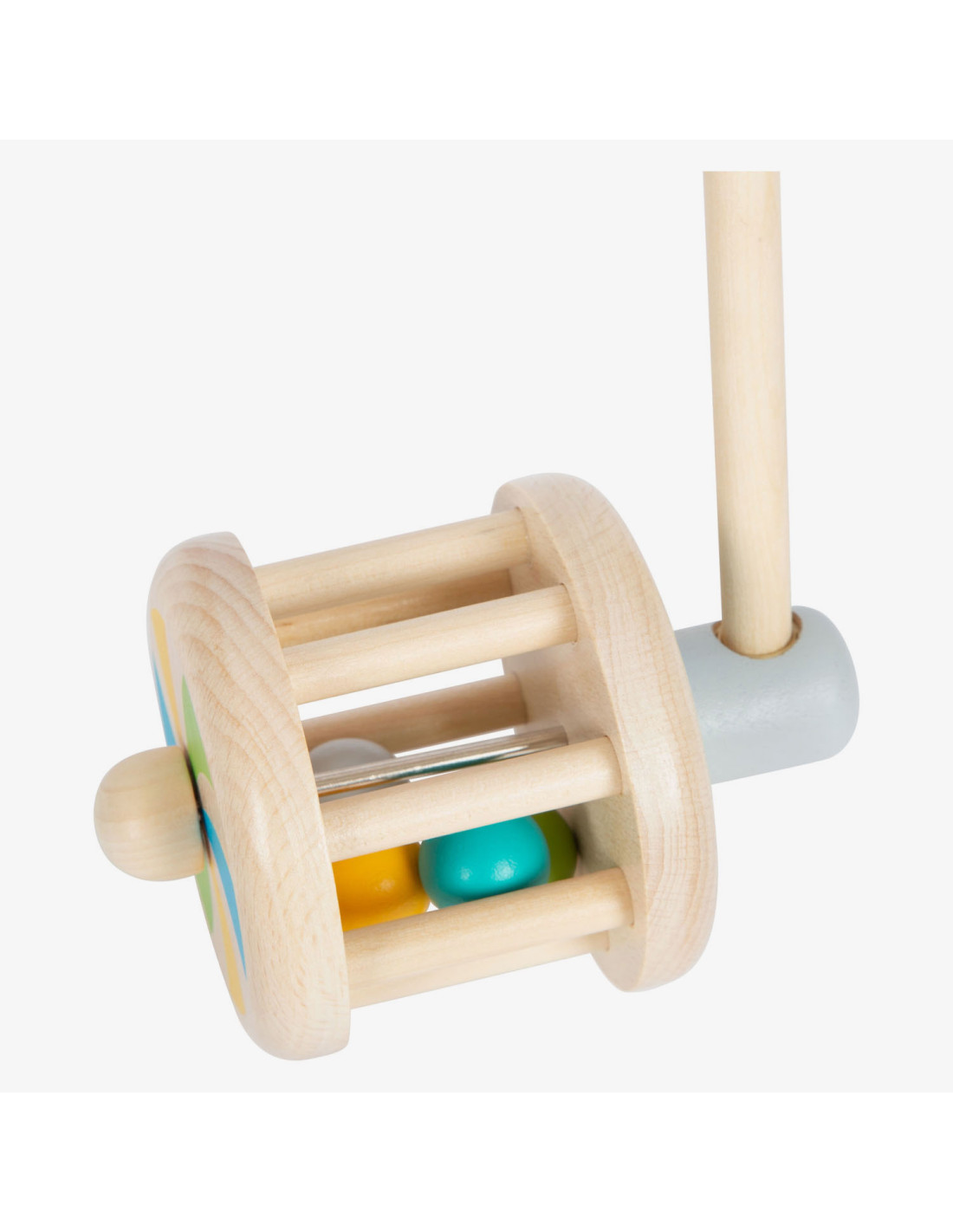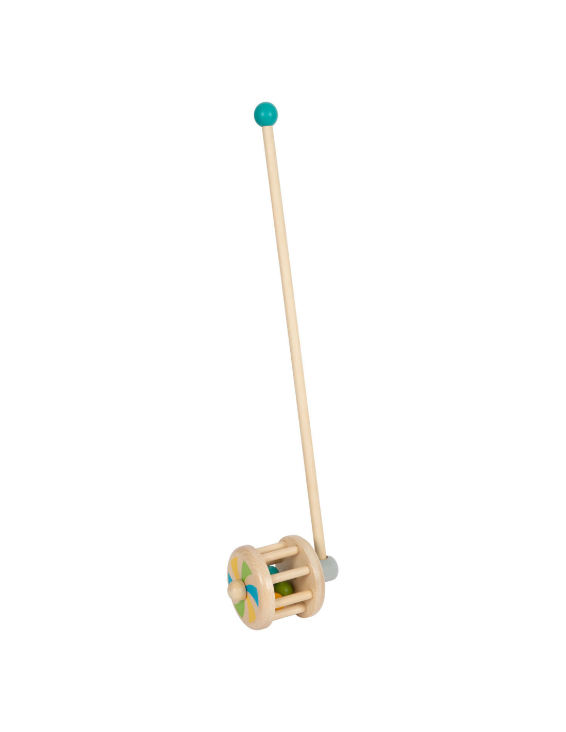 Deze houten duwrammelaar is een veilige en duurzame metgezel voor elke peuter en de onbetwiste klassieker onder de duwspeeltjes! Bij het duwen rommelen de felgekleurde houten ballen wild rond de houten trommel en maken een grappig geluid dat beginnende wandelaars aanmoedigt om keer op keer op ontdekkingstocht door de kinderkamer te gaan. Dankzij de grijpbare houten bal op het handvat kan deze praktische loopwagen een geweldige wandellijn zijn.