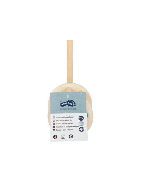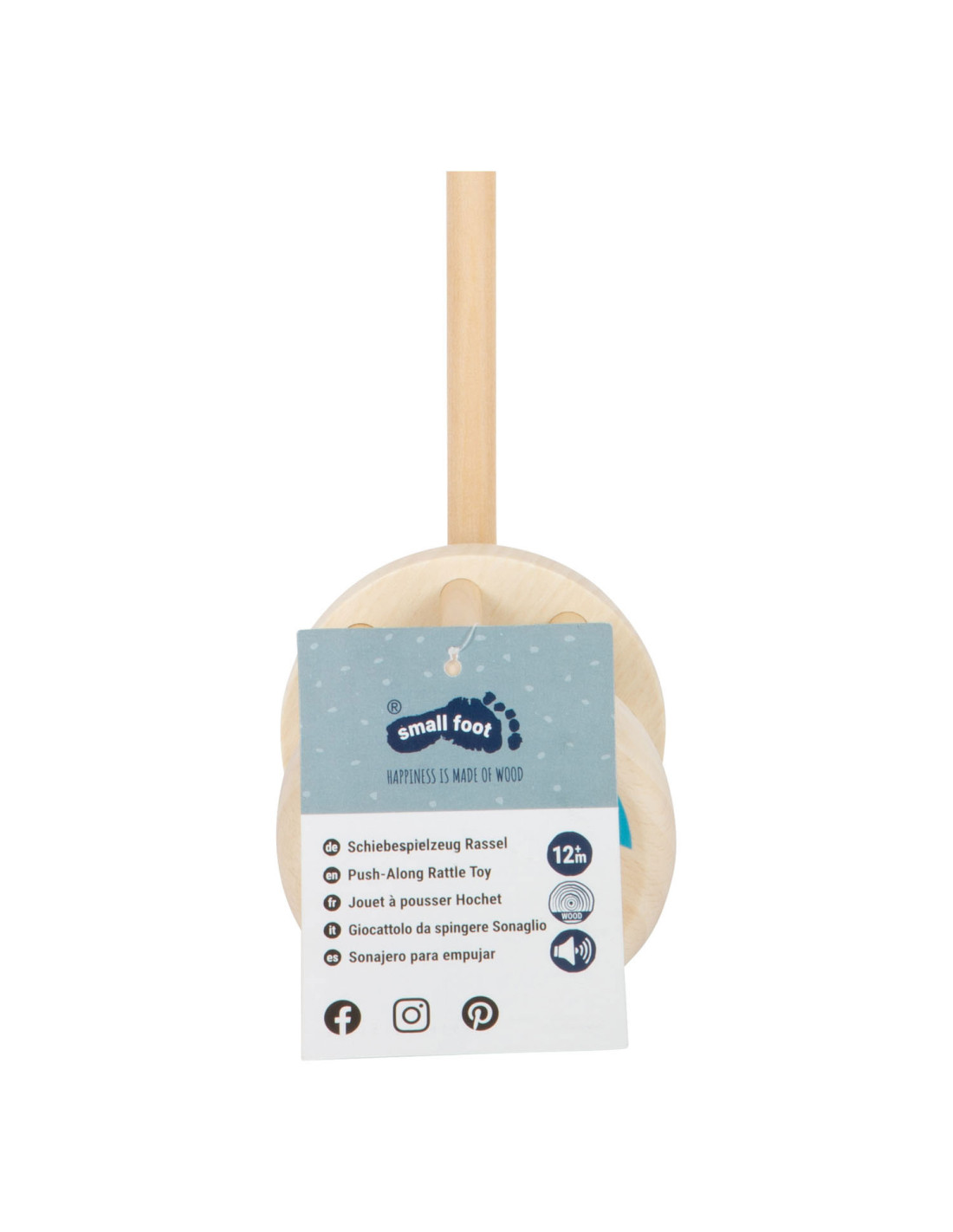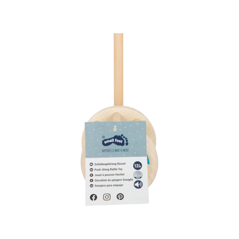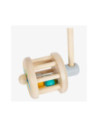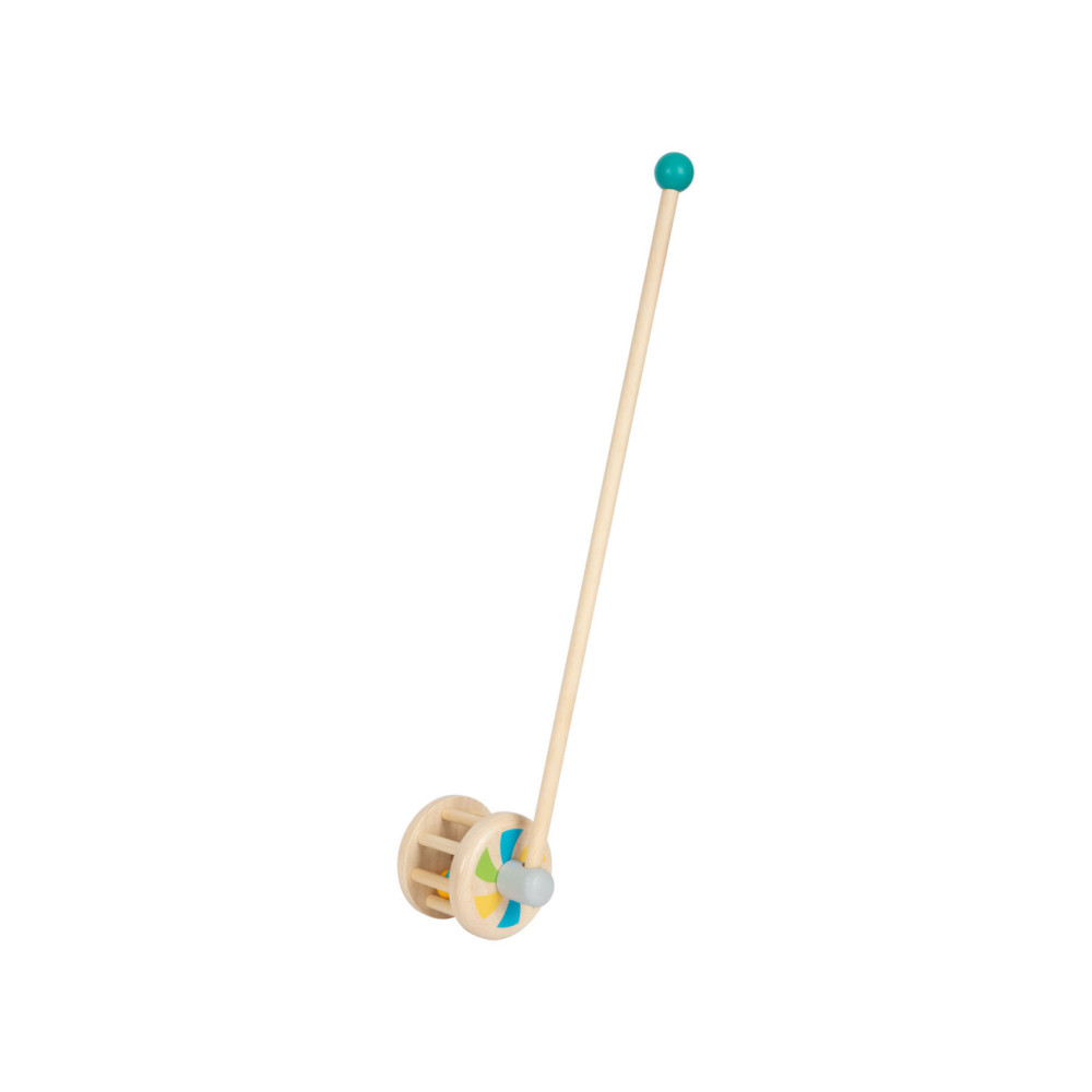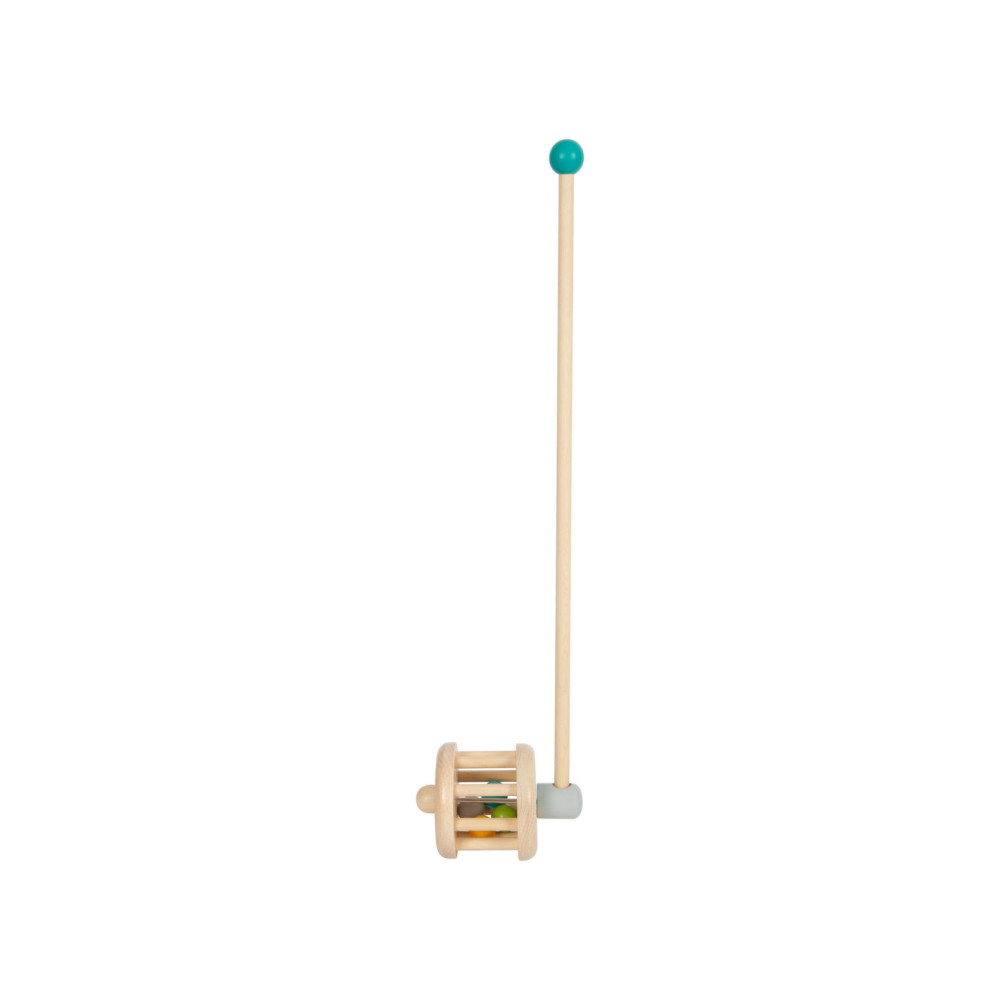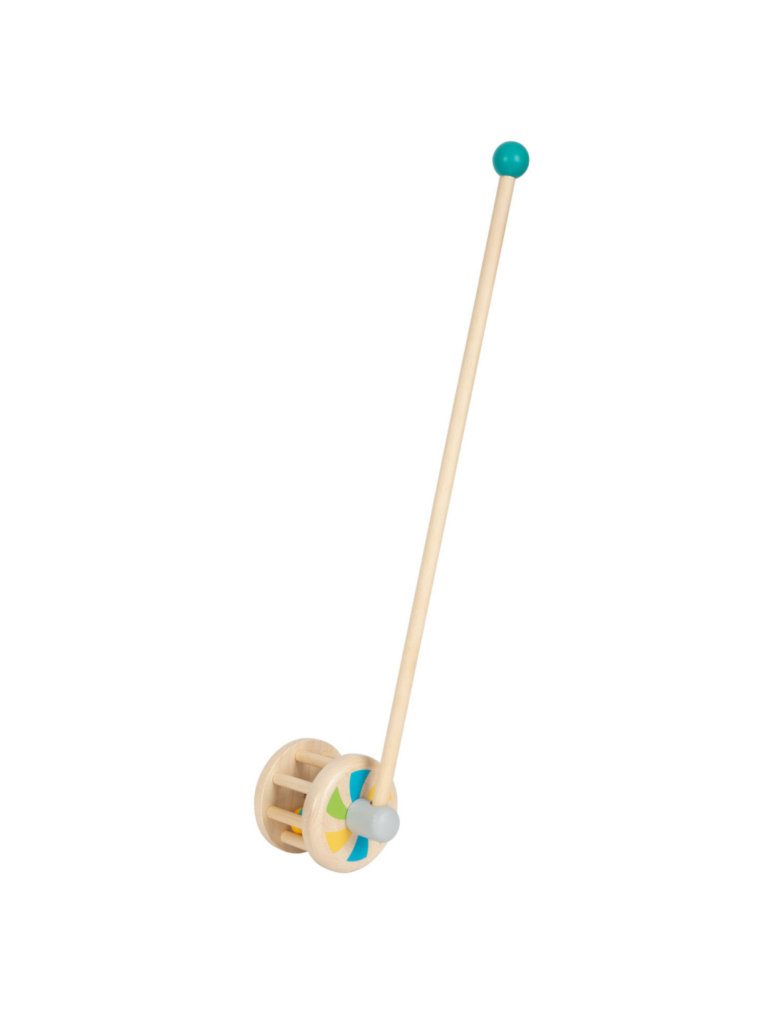 Deze houten duwrammelaar is een veilige en duurzame metgezel voor elke peuter en de onbetwiste klassieker onder de duwspeeltjes! Bij het duwen rommelen de felgekleurde houten ballen wild rond de houten trommel en maken een grappig geluid dat beginnende wandelaars aanmoedigt om keer op keer op ontdekkingstocht door de kinderkamer te gaan. Dankzij de grijpbare houten bal op het handvat kan deze praktische loopwagen een geweldige wandellijn zijn.