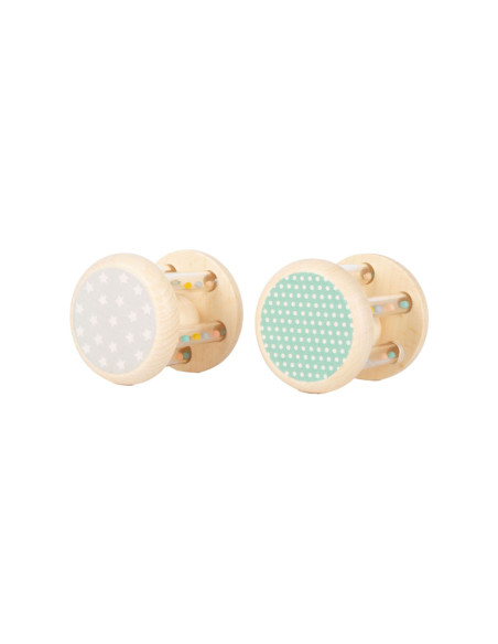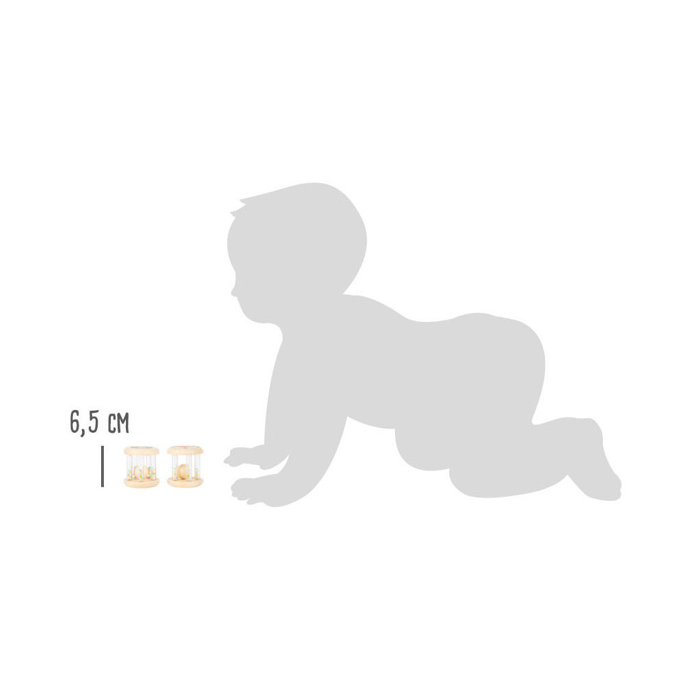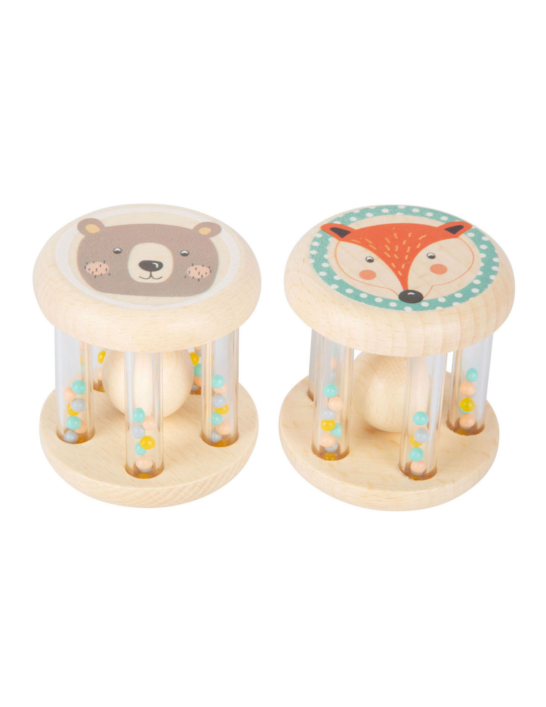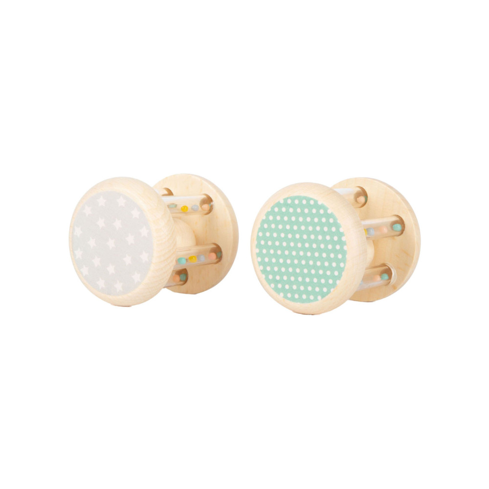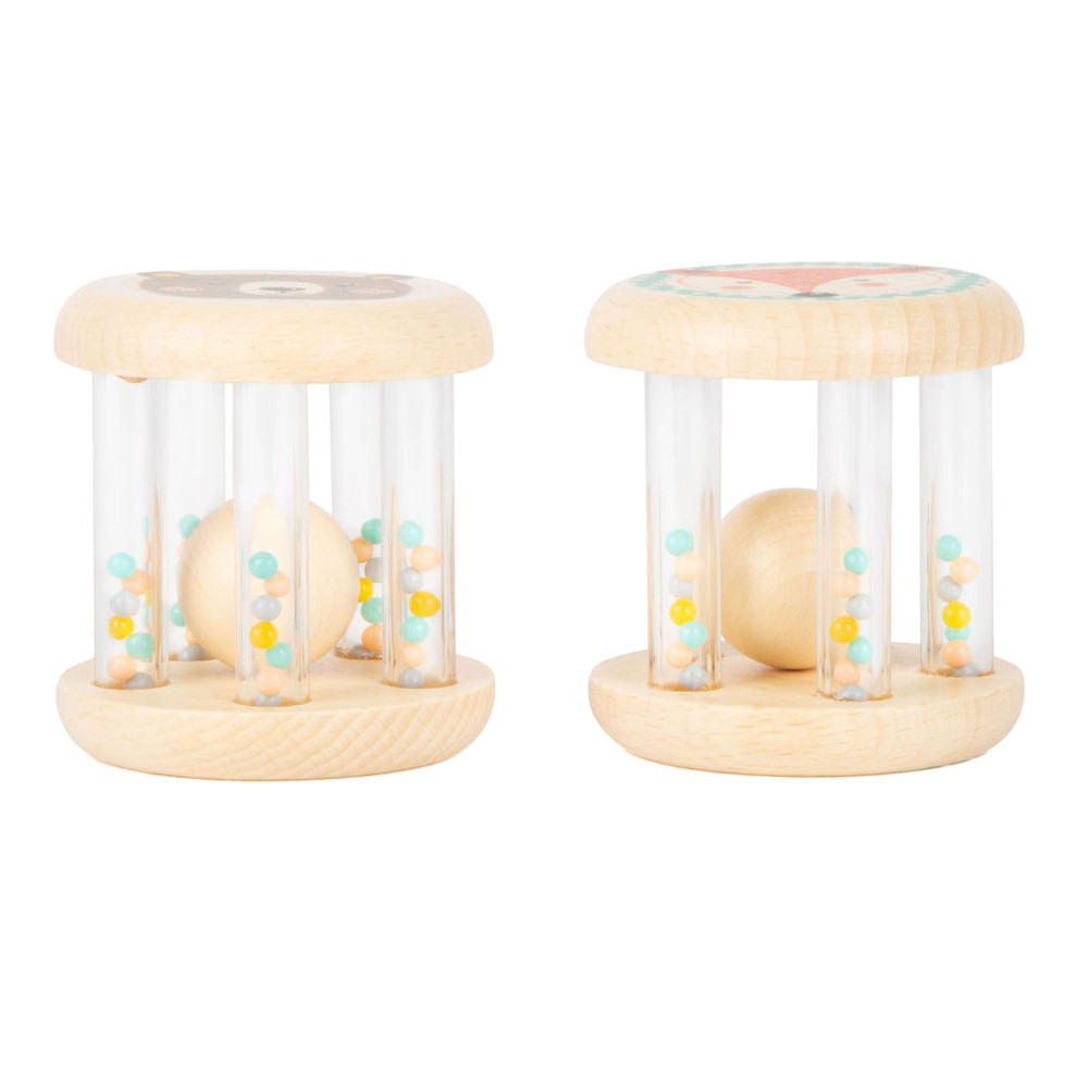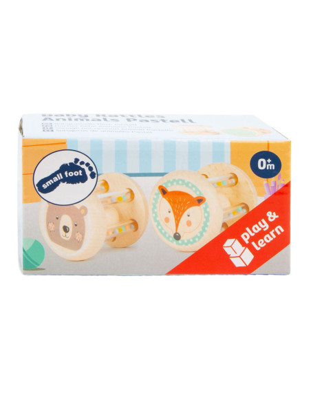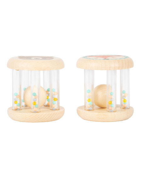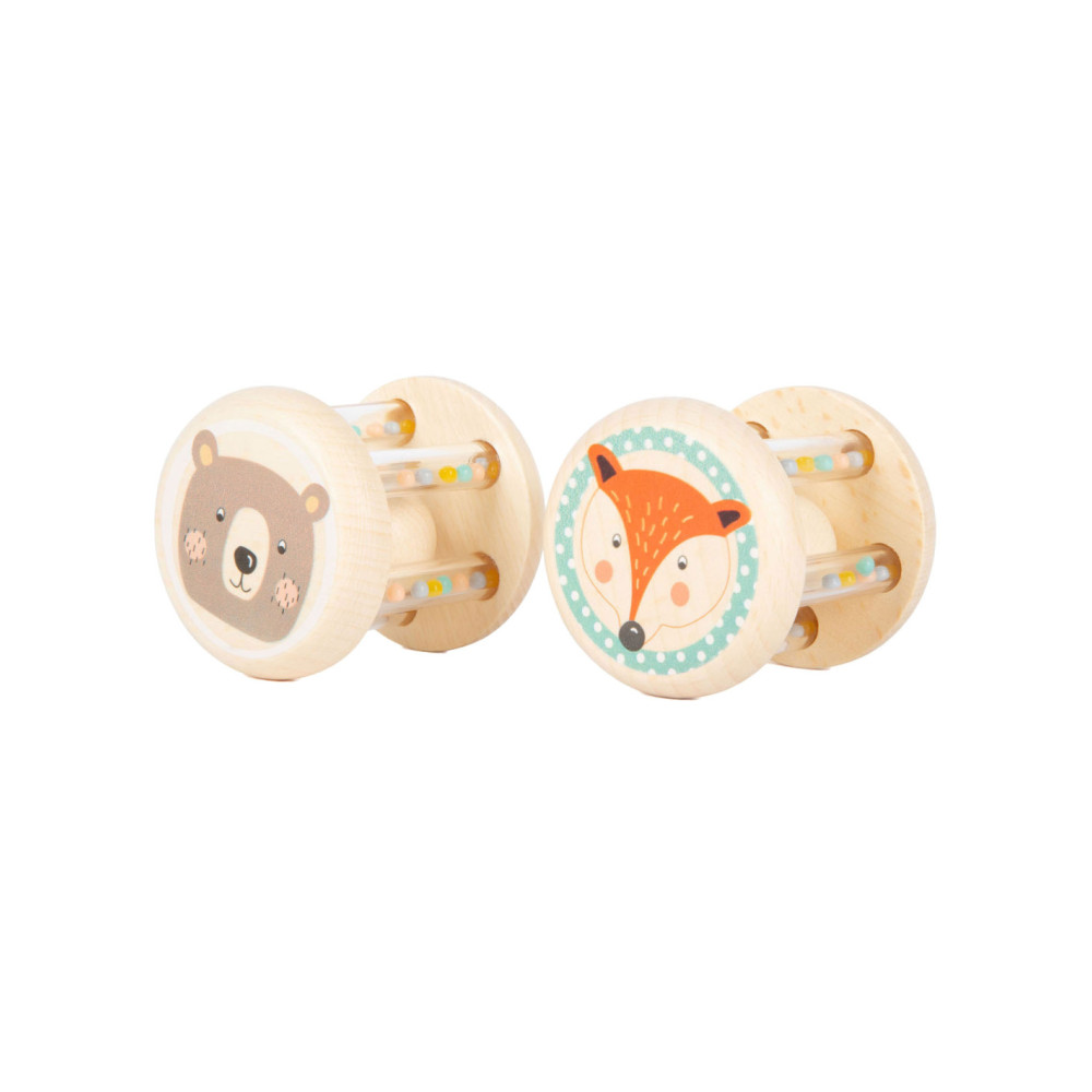 Grijpen, schudden en rammelen! In deze babyrammelaars met kleine, kleurrijke kraaltjes in transparante buisjes klettert een houten balletje rond. Wat leuk voor je ogen en oren! Het is ideaal babyspeelgoed in een set van 2, voor het ontwikkelen van motorische vaardigheden en zintuiglijke waarneming. Bijzonder gemakkelijk vast te pakken en vast te houden voor baby's! Veel natuurlijk houtmateriaal en de delicate pastelkleuren en schattige dierenprints maken deze rammelaars tot echte blikvangers onder het babyspeelgoed. Geschikt vanaf 0 maanden.