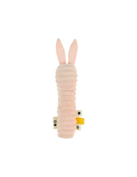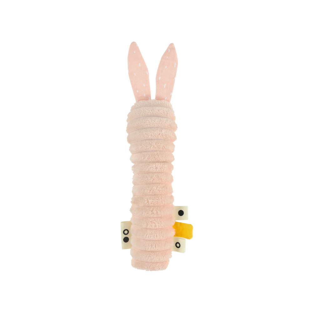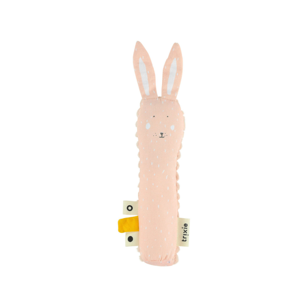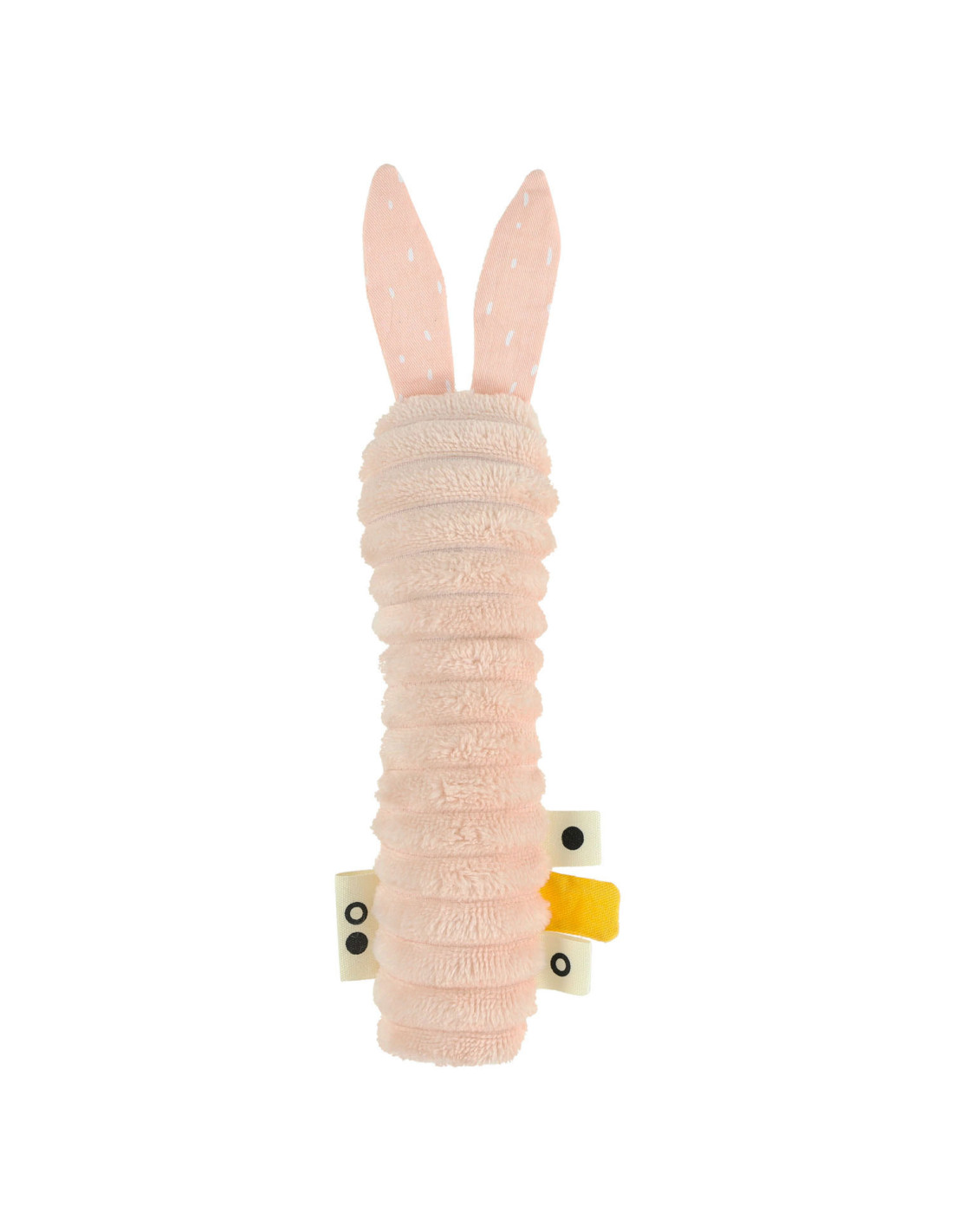 Zelfs de kleinste handjes kunnen dit kleine, zachte vriendje beetnemen. En wanneer je erin knijpt, komt er een kort, luid piepje uit.