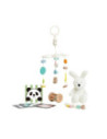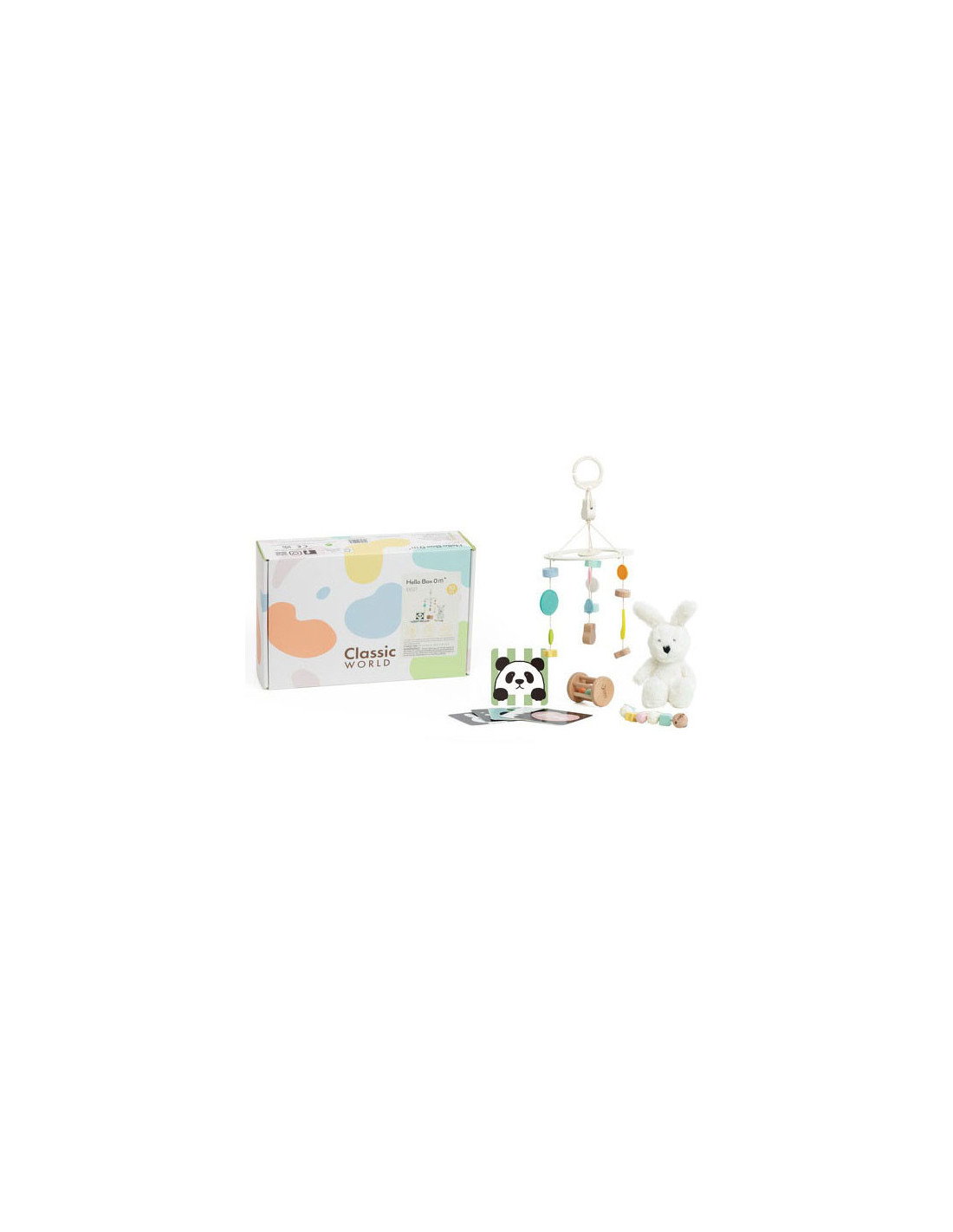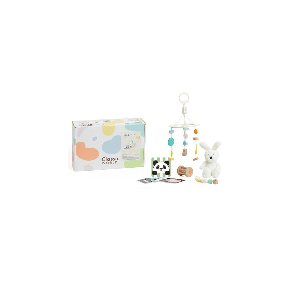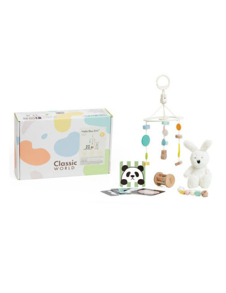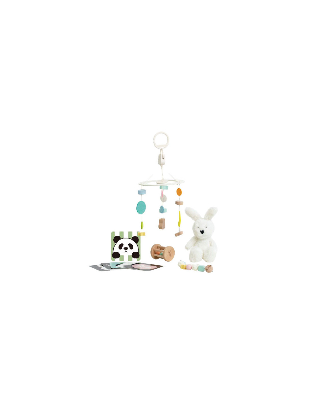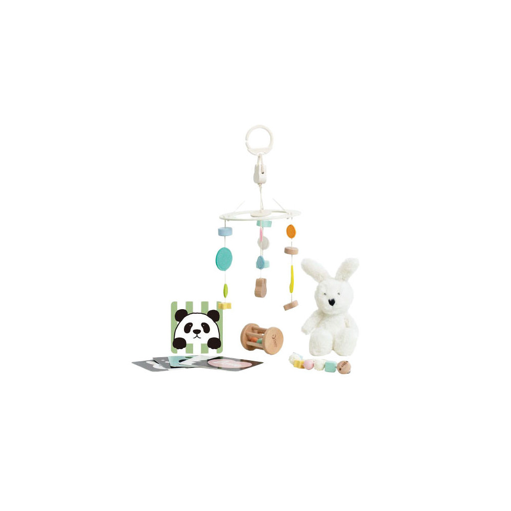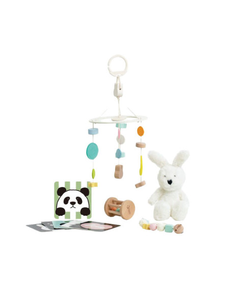 Set met verschillende items voor kinderen van 0 tot 6 maanden. De set bevat een pluchen konijn, mobiel, zwart en wit sensory kaarten, een speenkoord en een rammelaar.
