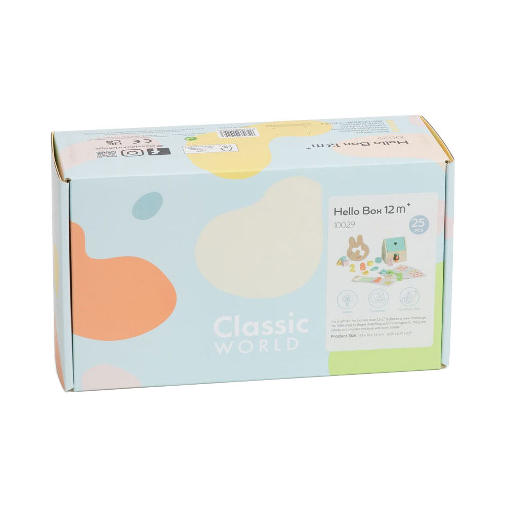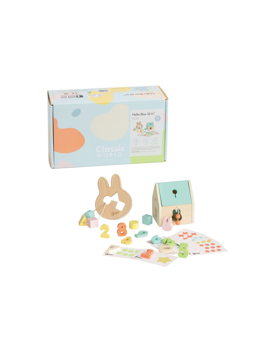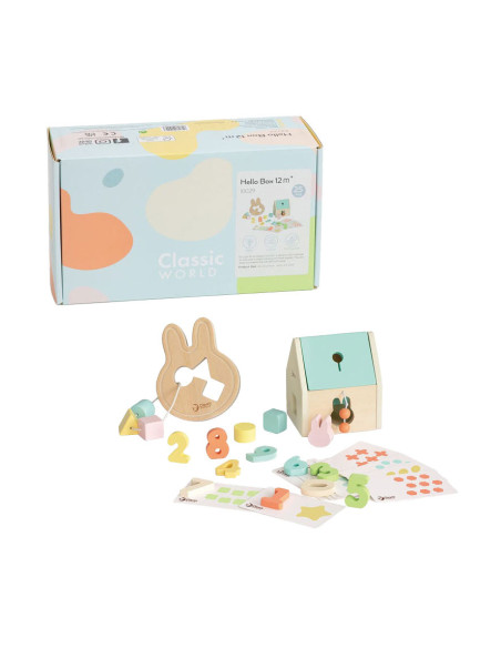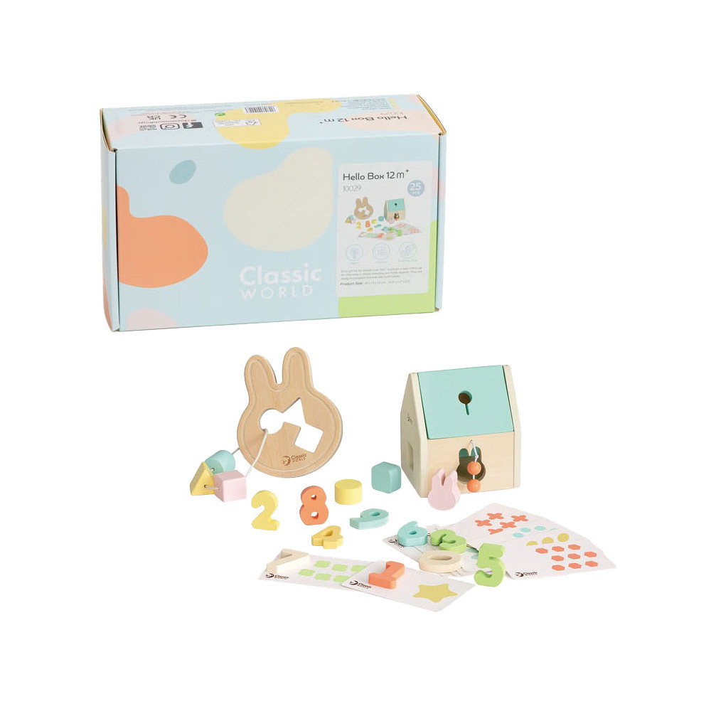 Een box gevuld met items voor kinderen van 1 jaar tot 18 maanden. De items helpen bij het matchen van vormen en het leren van getallen.