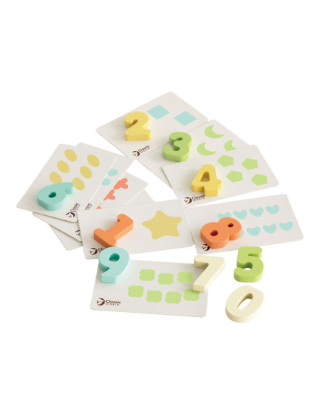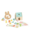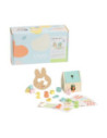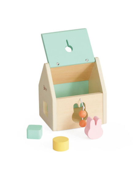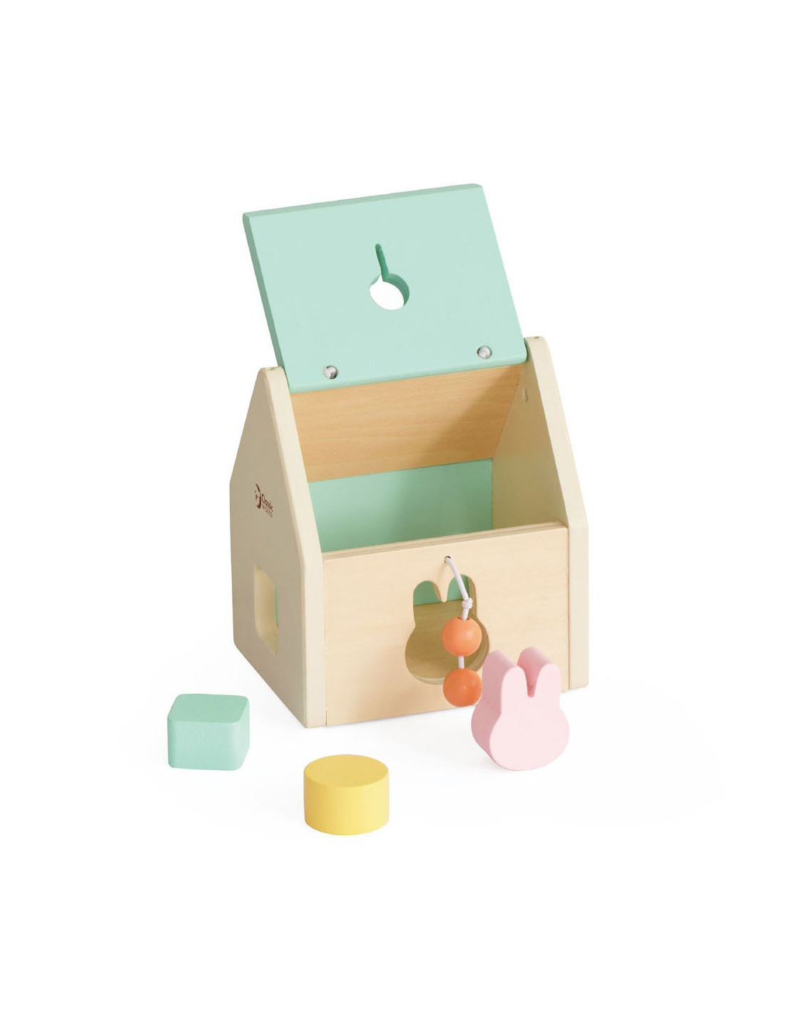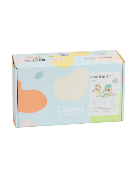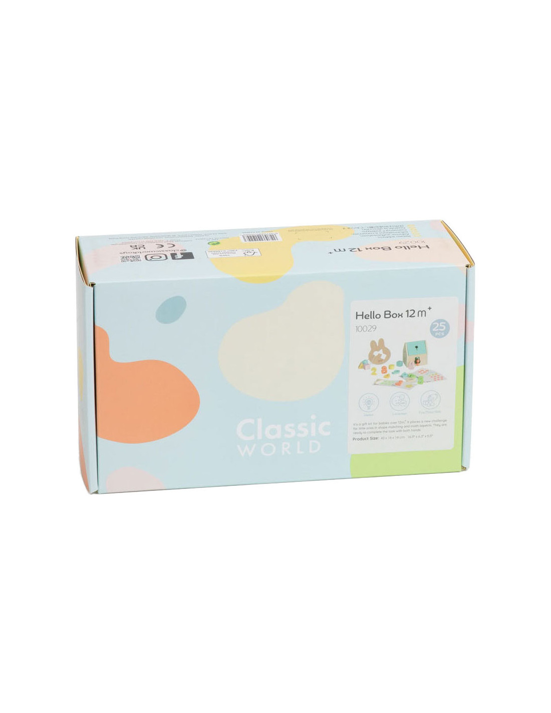 Een box gevuld met items voor kinderen van 1 jaar tot 18 maanden. De items helpen bij het matchen van vormen en het leren van getallen.