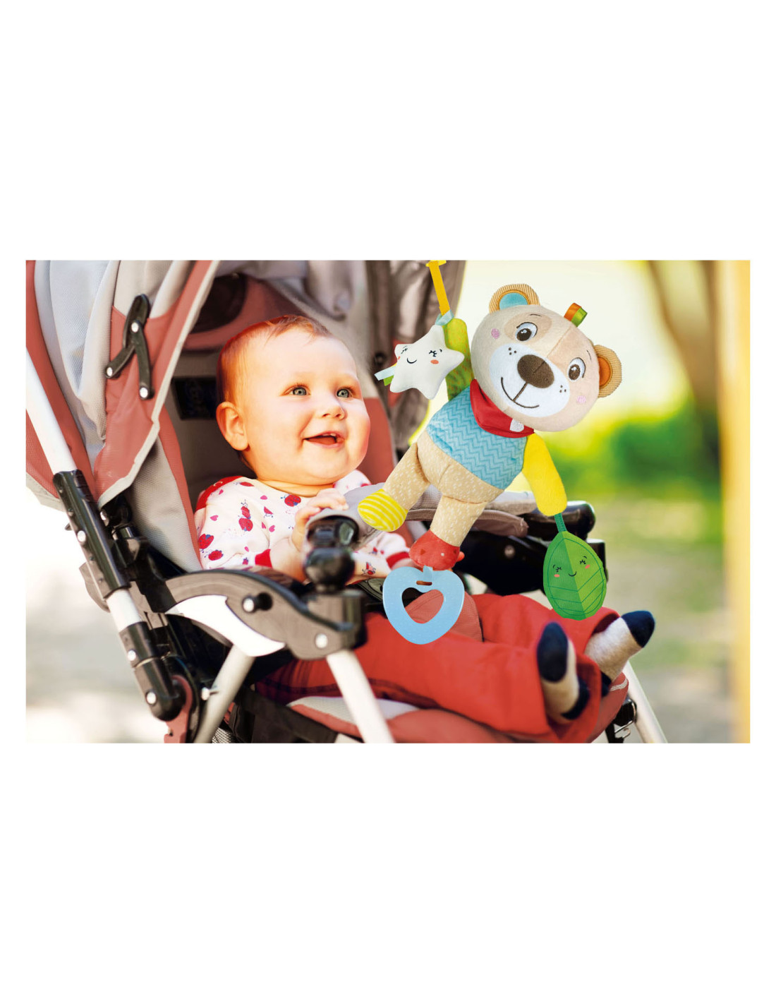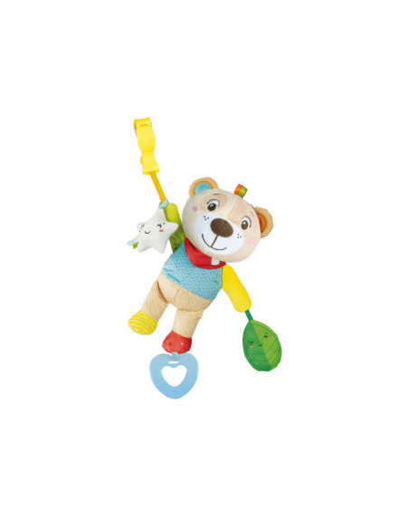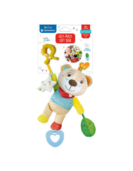 Zacht rammelbeertje van pluche, met drie hangers om op te bijten en mee te spelen. Geschikt vanaf de geboorte. 18 x 34 x 7,5 centimeter groot.