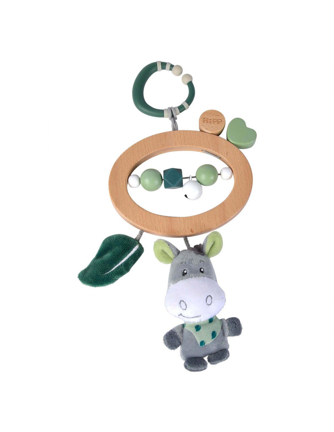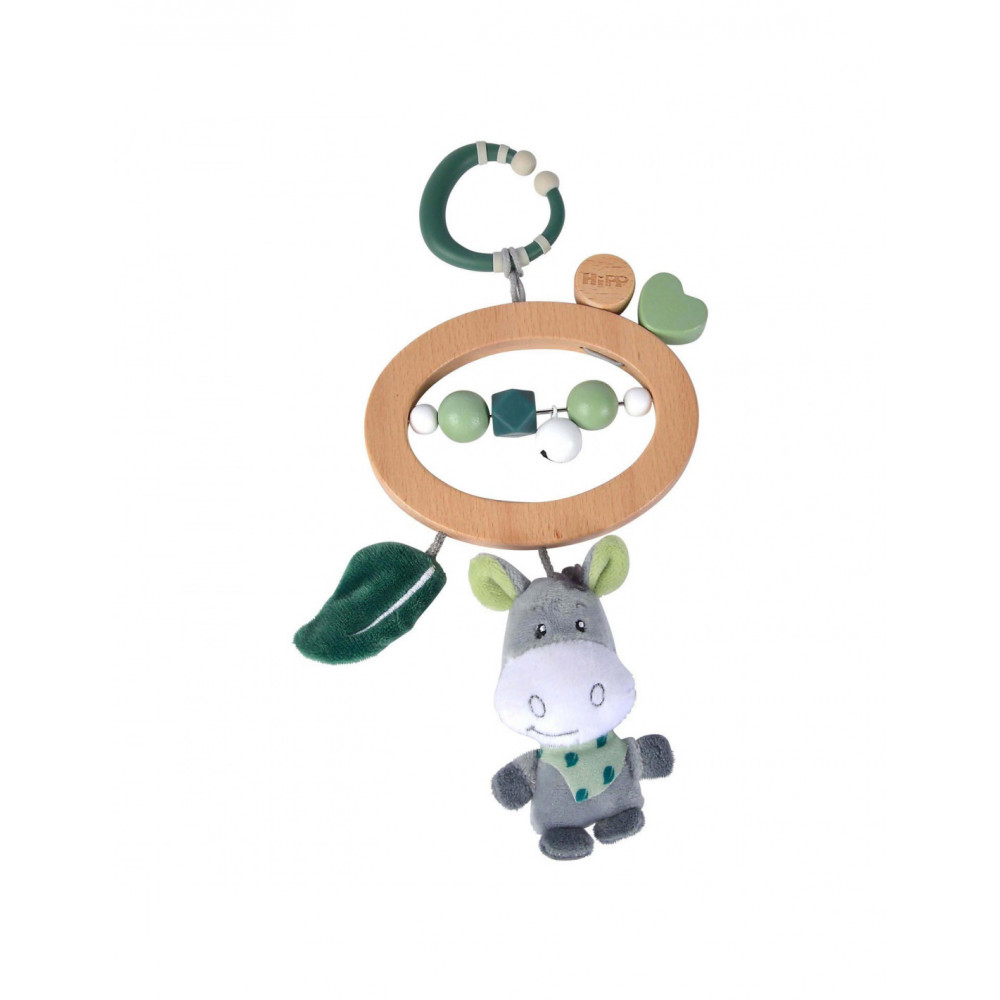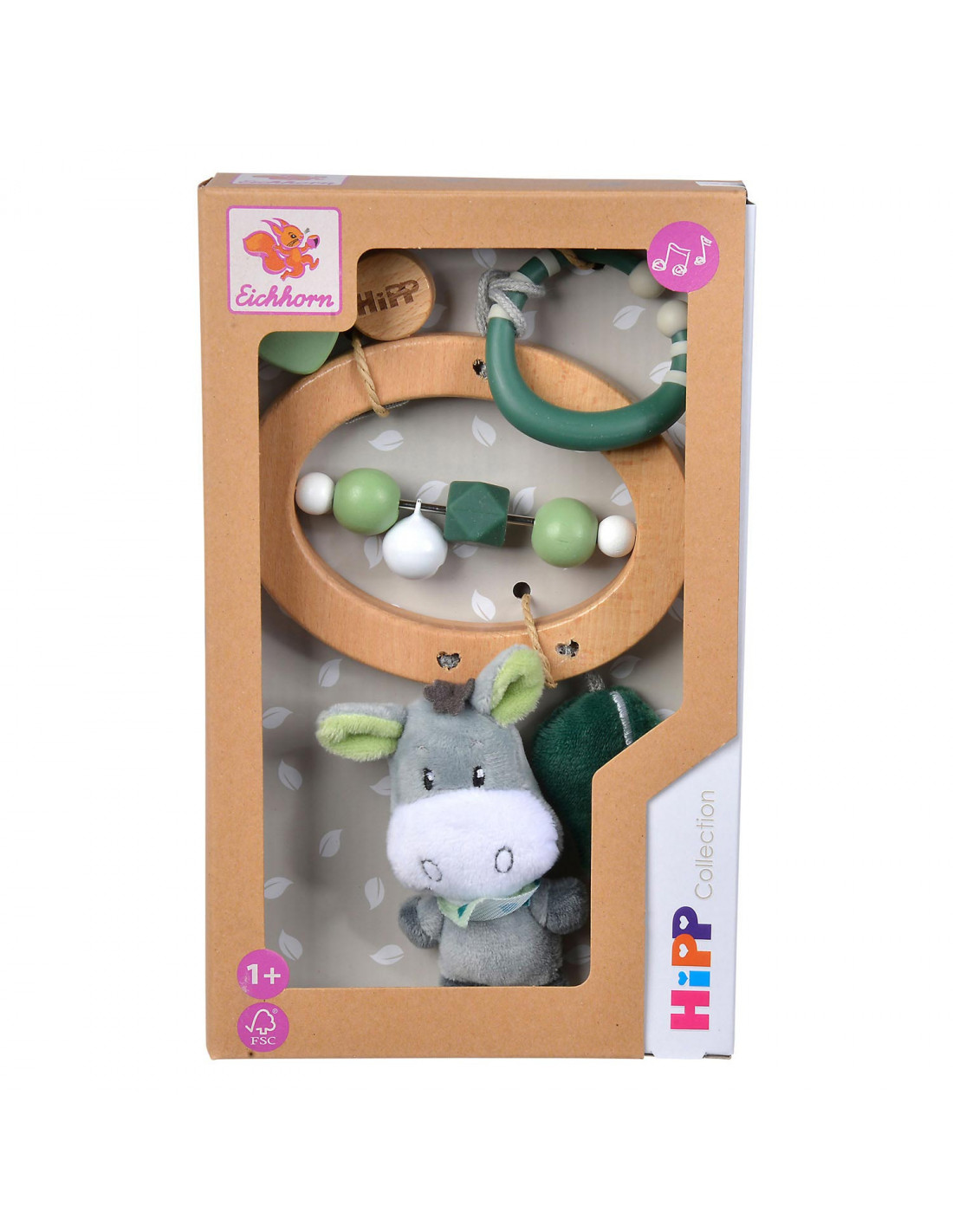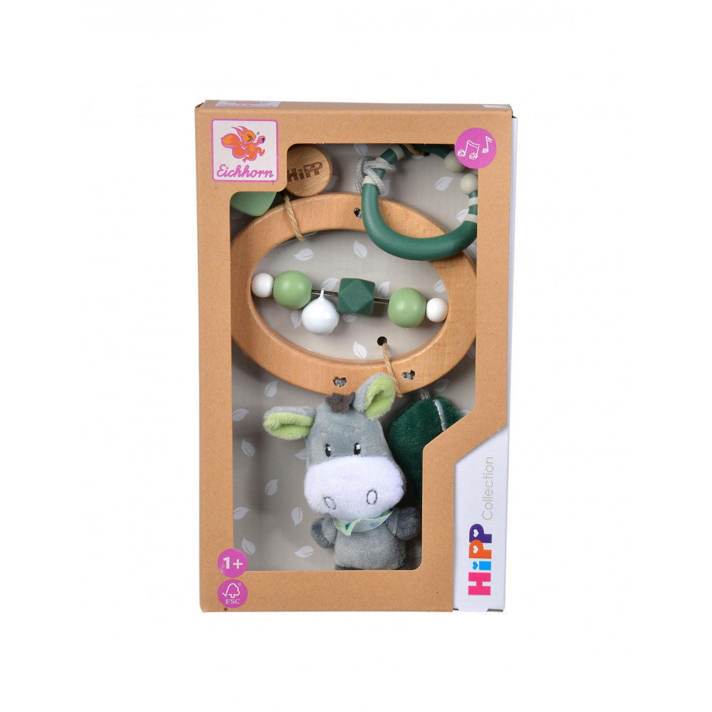 Houten kinderwagenspeeltje van Eichhorn Baby HIPP voor onderweg. Dit babyspeeltje heeft een stevige houten bijtring, sensorische kralen en een lekker zacht knuffeltje. Gemaakt van beukenhout (100% FSC®), silicone en pluche. Geschikt voor kinderen vanaf 12 maanden oud.