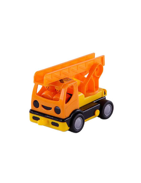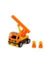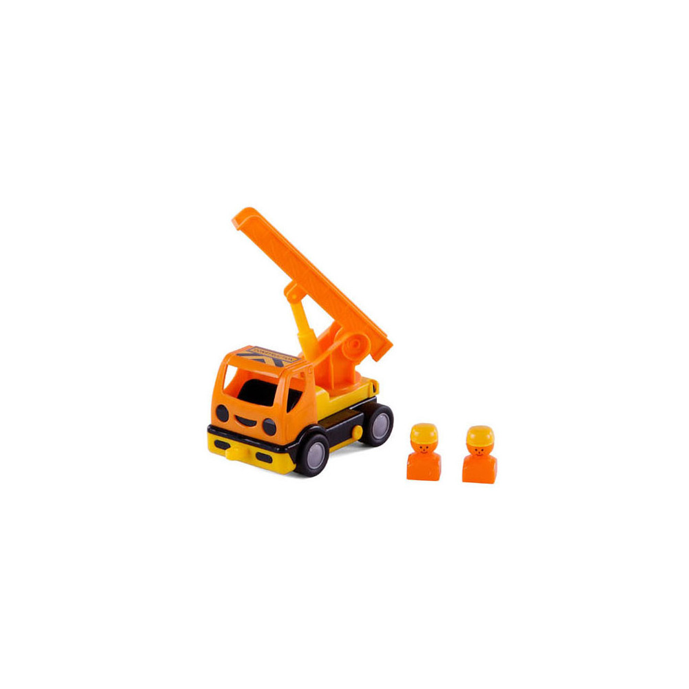 Deze kleine hijskraan is het perfecte eerste voertuig. Het ligt fijn in de hand en is gemakkelijk vast te houden door kleine handjes. De twee mannetjes in de auto besturen de wagen. De hijskraan kan omhoog en uitschuiven. De hijskraanwagen is oranje met zwarte en gele accenten.