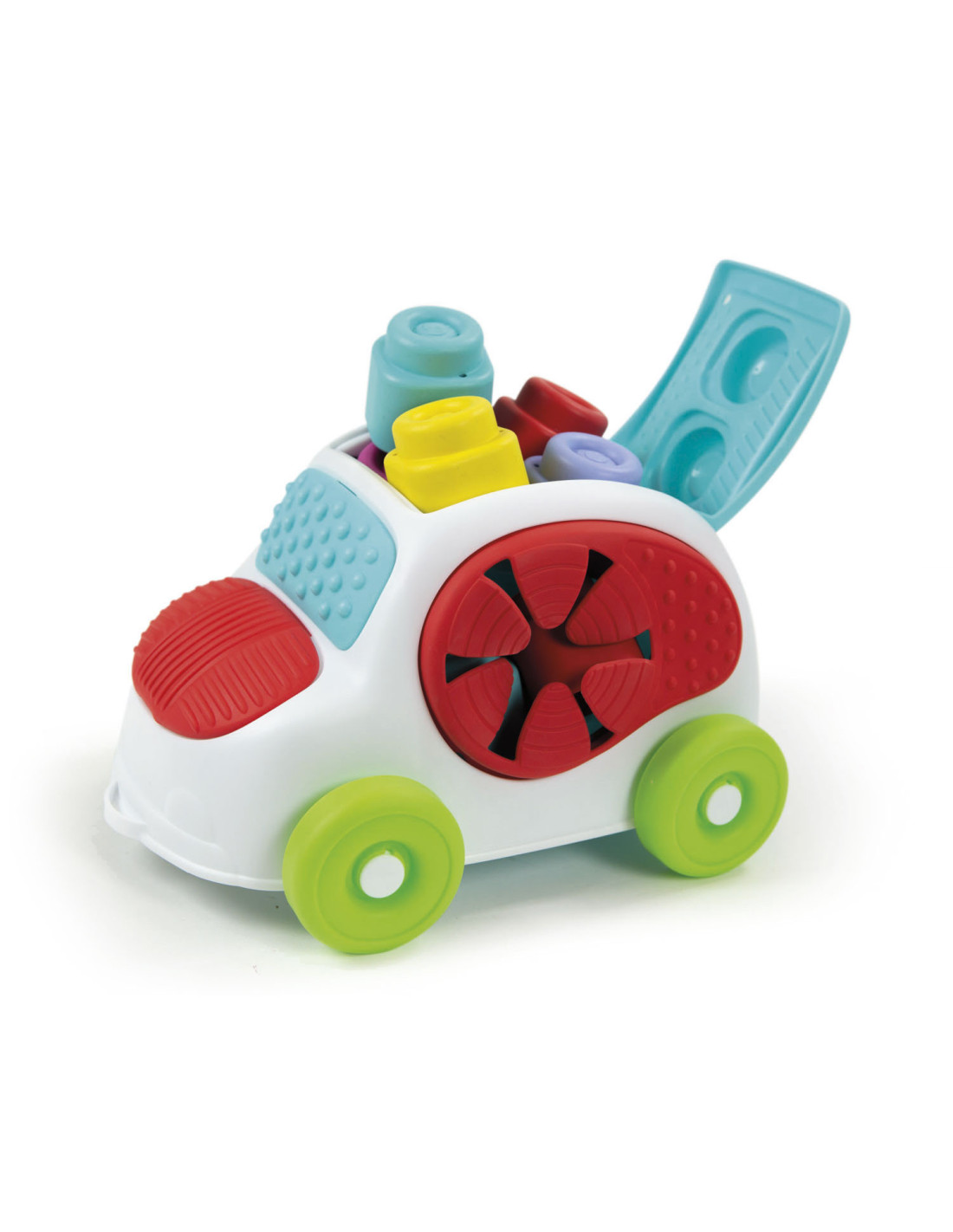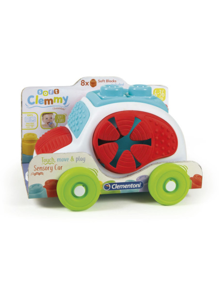 Een innovatieve auto met zachte inzetstukken, zoals de Clemmy-blokken, voor een stimulerende ervaring die zich vermengt met spelen en zintuiglijke ontdekking. De zachte inzetstukken kunnen worden verkend en aangeraakt om de verschillende reliëfpatronen en vormen te ontdekken. Stimuleert aanraking en handmatige vaardigheden. Het dak van de auto kan worden gebruikt als basis voor het stapelen van de Clemmy-blokken, het wordt geopend en wordt een praktisch compartiment voor het opslaan van alle blokken. Dankzij de zachte zijruiten kunt u Clemmy-blokken in de auto spelen en invoegen en eruit halen. De auto en blokken kunnen worden gewassen, zelfs in de vaatwasser.