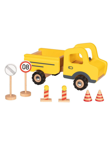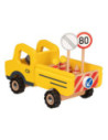 Een houten auto gemaakt voor dagelijks gebruik op de weg. Als robuust bouwplaatsvoertuig, voorzien van de nodige accessoires voor kleine reparaties aan het wegdek. De mooi gevormde, open zijpanelen die speciaal zijn ontworpen voor kinderhanden en de hoogwaardige rubberen banden verhogen de speelwaarde.