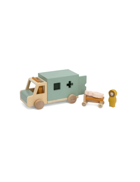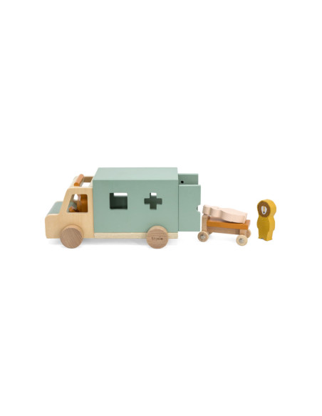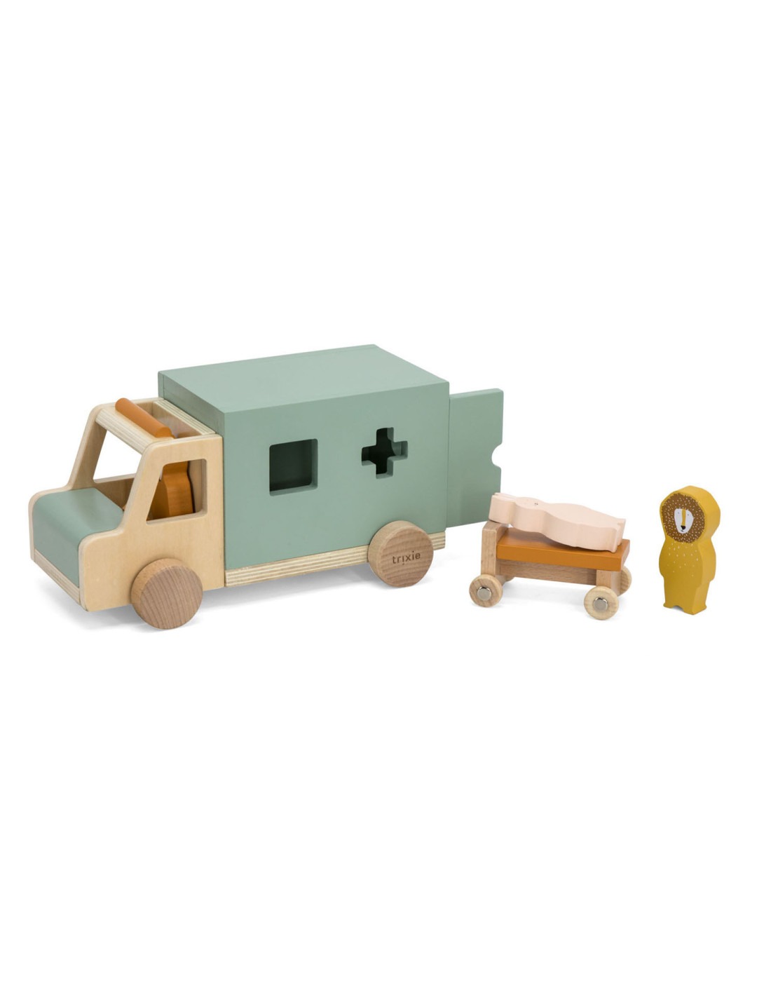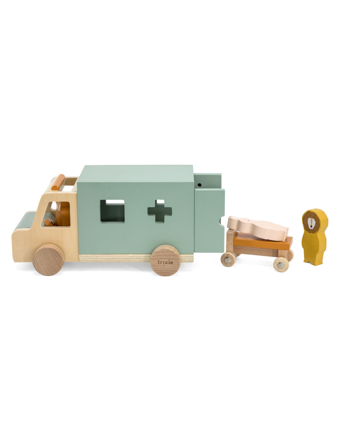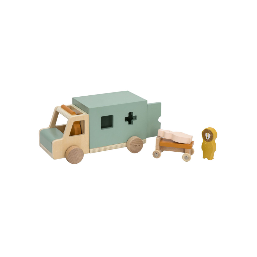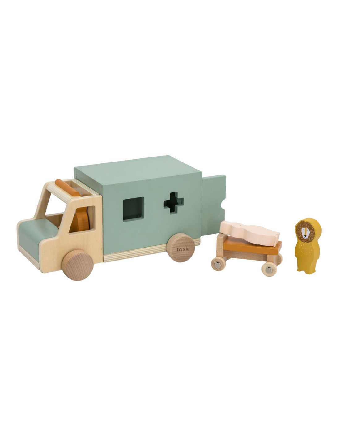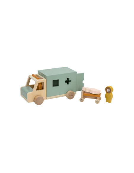 Pas op, daar komt de ambulance! Onze dierenvrienden zijn onderweg om iemand in nood te helpen. Deze houten ambulance prikkelt meteen de fantasie van kinderen.