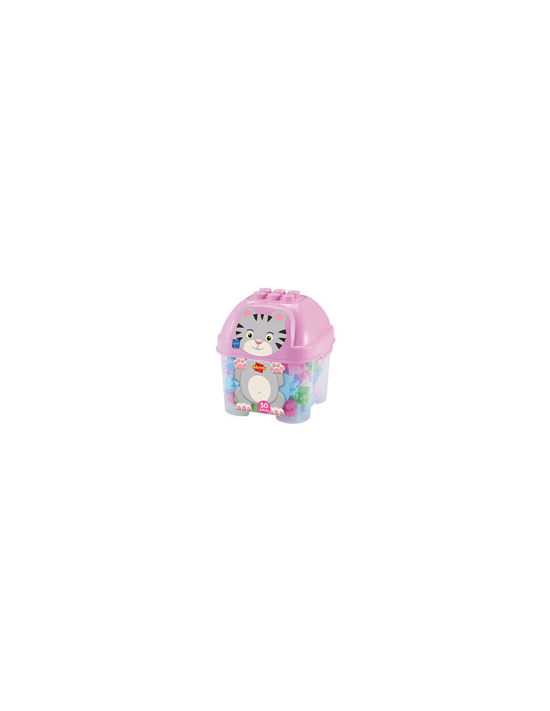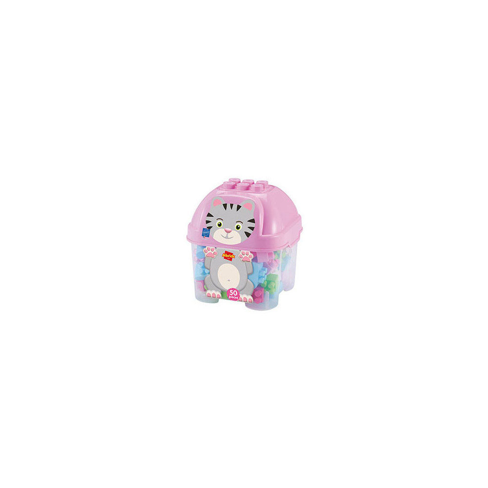 EEN PRAKTISCHE OPBERGBOX: deze box, versierd met een schattige kat, is gevuld met 50 bouwstenen in verschillende kleuren en vormen.