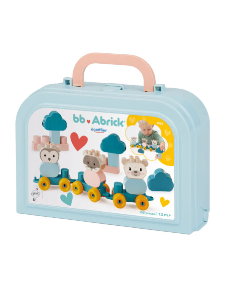 Deze set bevat 1 koffer, 3 verwisselbare rollende onderstellen, 12 wielen en 13 bouwblokken in verschillende vormen, waarvan er 3 versierd zijn.