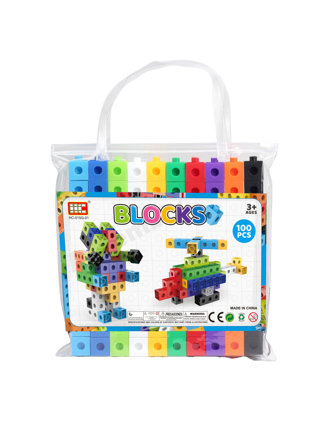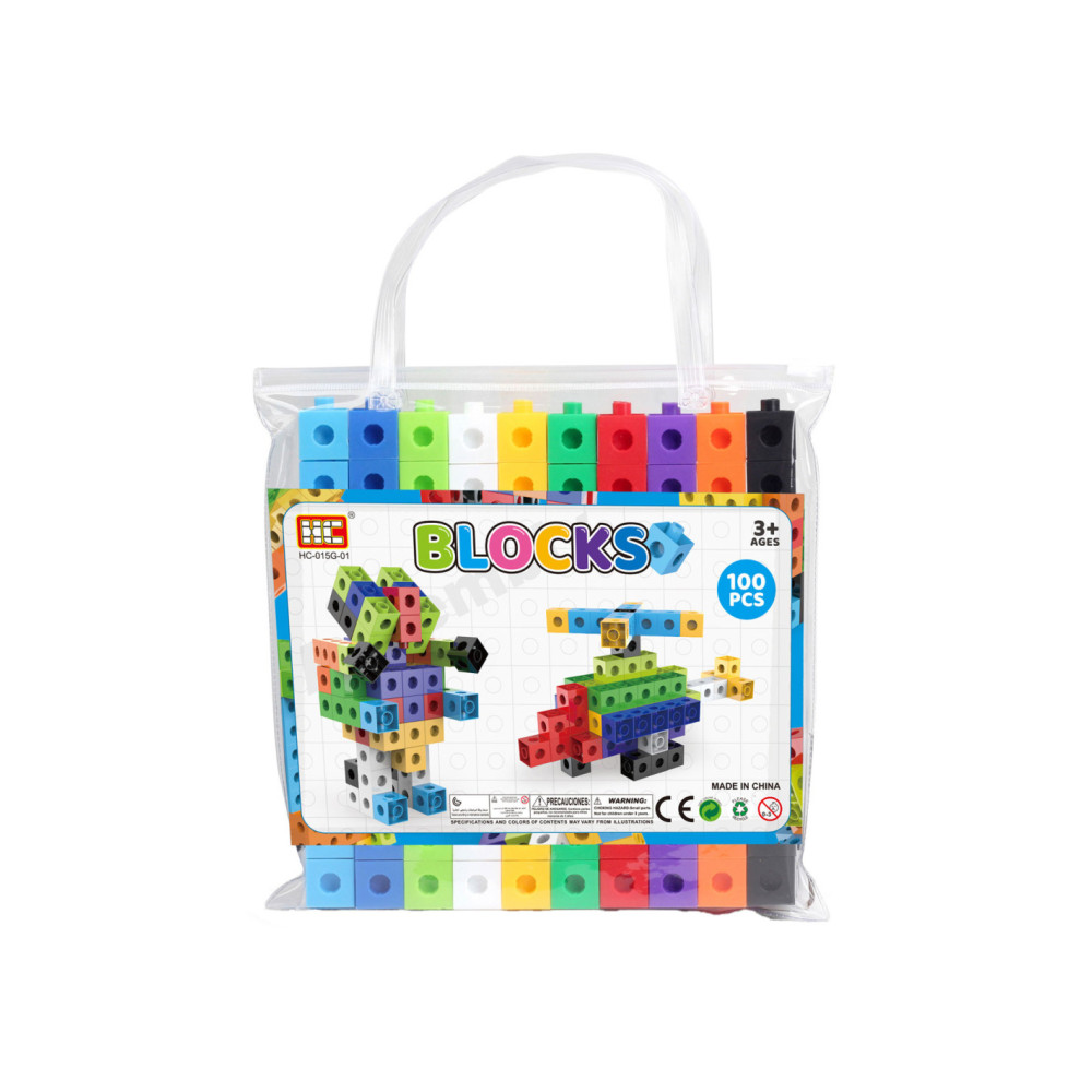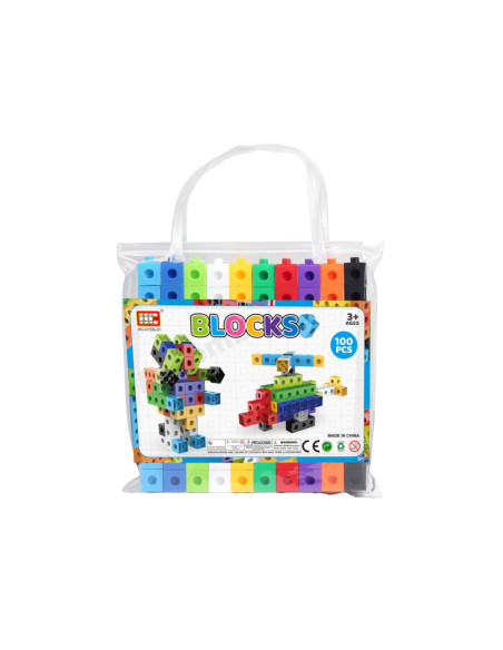 Set van 100 vierkante bouwblokjes (2 x 2 cm) in hersluitbare opbergtas. Geschikt vanaf 3 jaar.