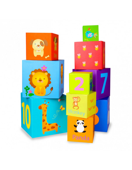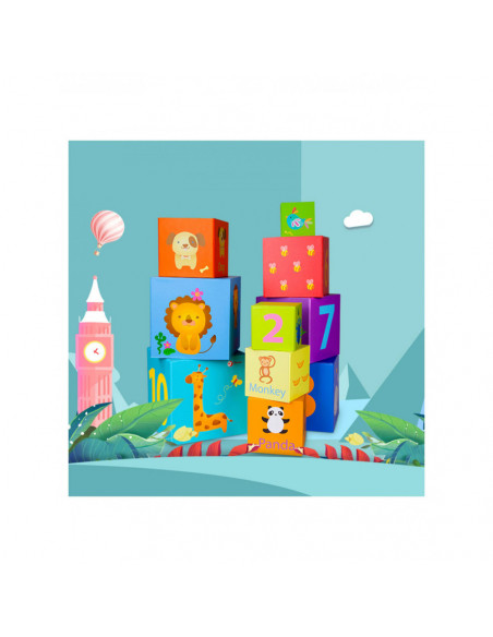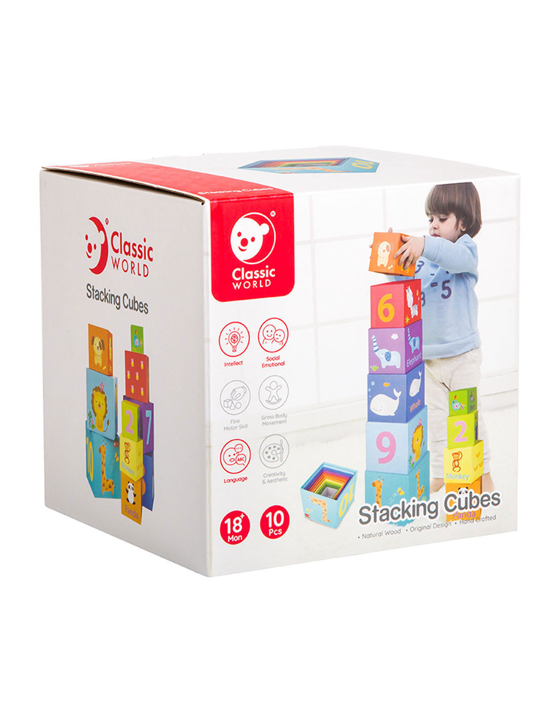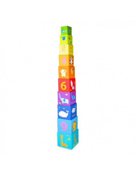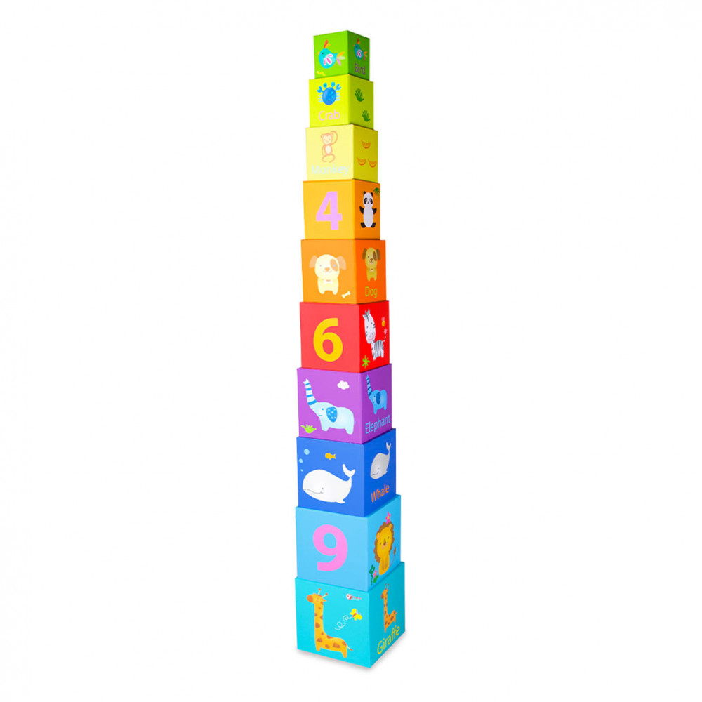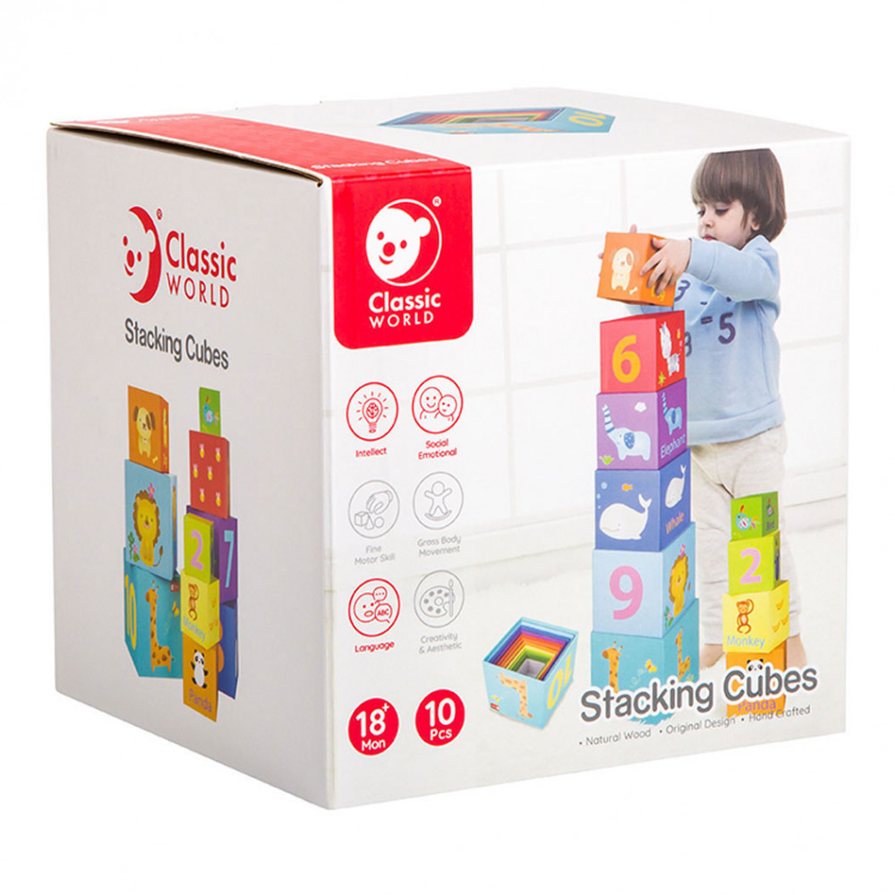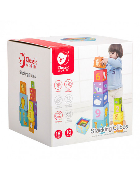 10 lichtgewicht stapelblokken met dieren- en cijferthema van Classic World. De blokken hebben verschillende formaten en kleuren en stimuleren ruimtelijk inzicht en de fijne motoriek. Gemaakt van ecologisch verantwoorde en kindvriendelijke materialen. Geschikt voor kinderen vanaf 18 maanden.