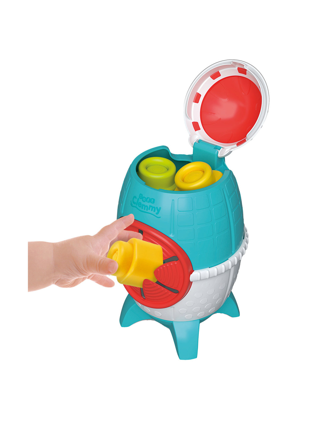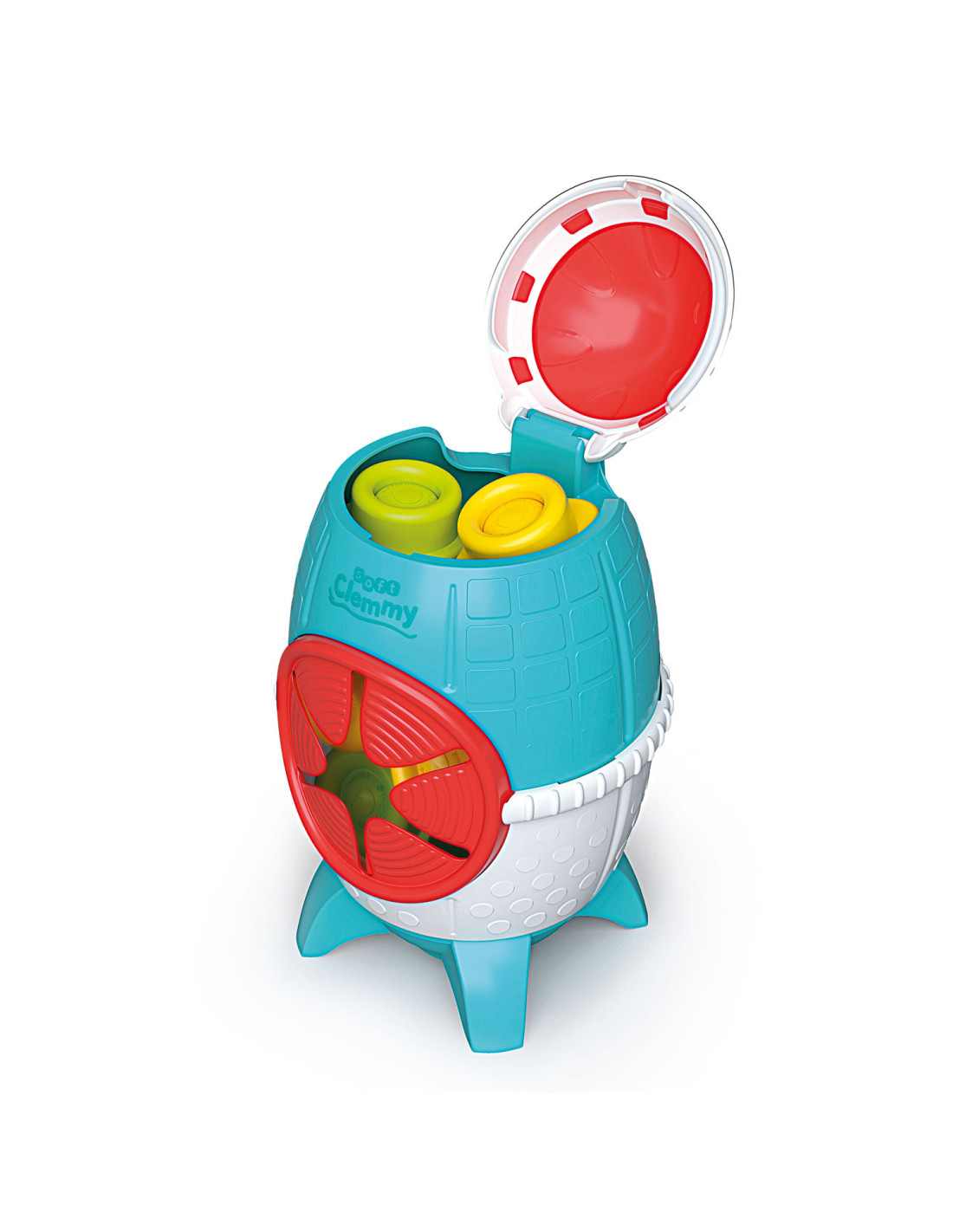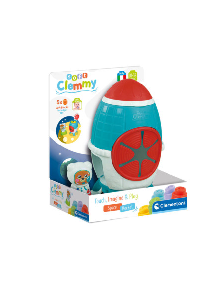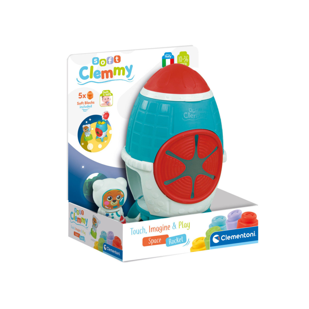 Een originele raketvormige Clemmy emmer met een leuk personage. Vol met activiteiten en blokken waarmee je veel ruimteavonturen kunt maken, stapelen en verzinnen. Het kind kan de blokken door de opening van het zachte plastic steken en ze weer pakken door het deksel te openen. Het personage kan op de blokken worden gemonteerd en in de raket worden geplaatst, klaar om te vertrekken naar het zachte Clemmy-universum! Het spelen met de blokken en de raket die rijk is aan reliëftexturen helpt het kind de tastzin te stimuleren, de handvaardigheid te ontwikkelen en de oog-handcoördinatie te verbeteren. Alle kwaliteit en veiligheid van de Clemmy wereld en de garantie van het Made in Italy.
