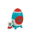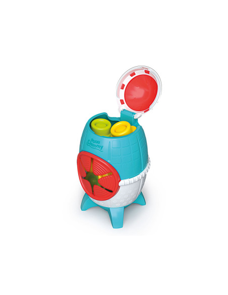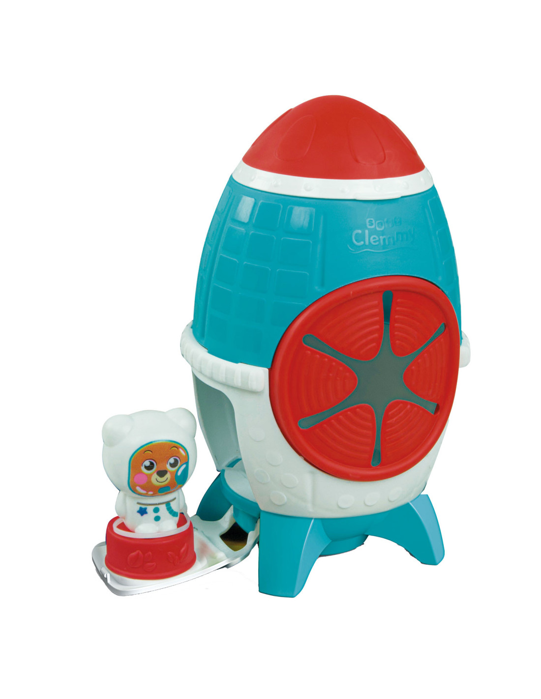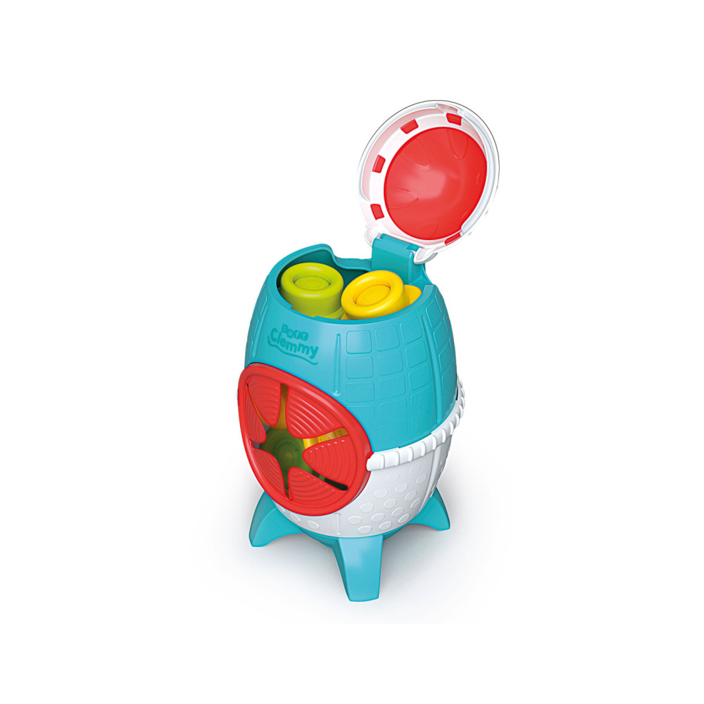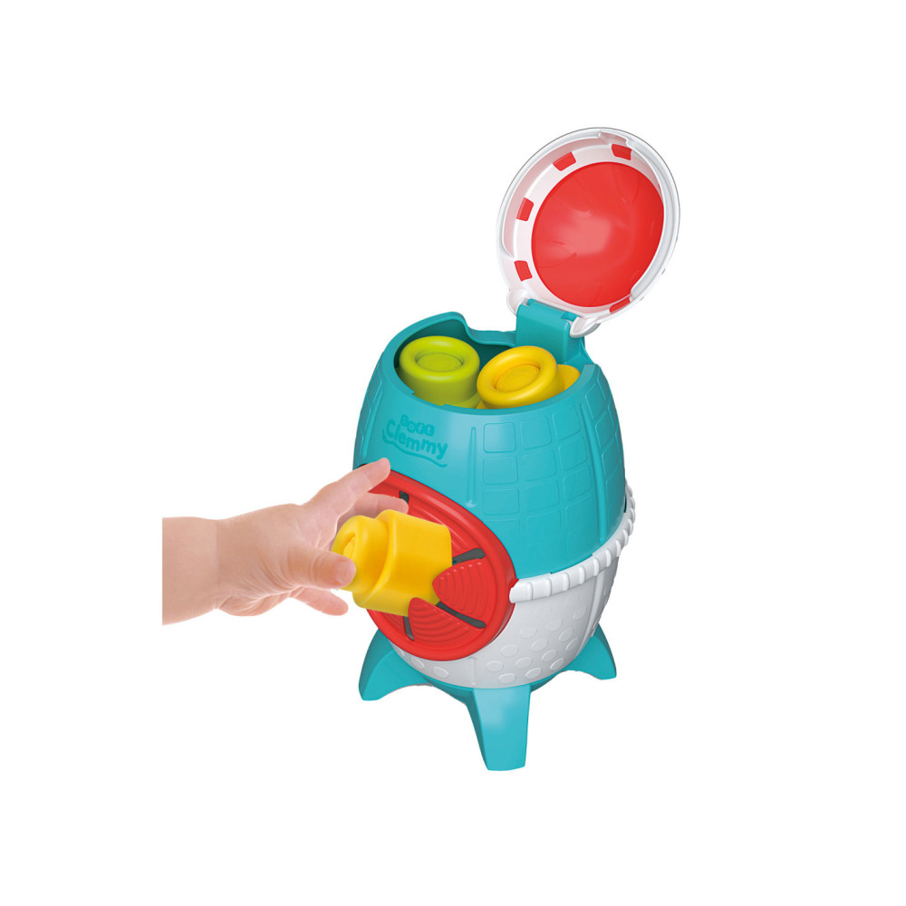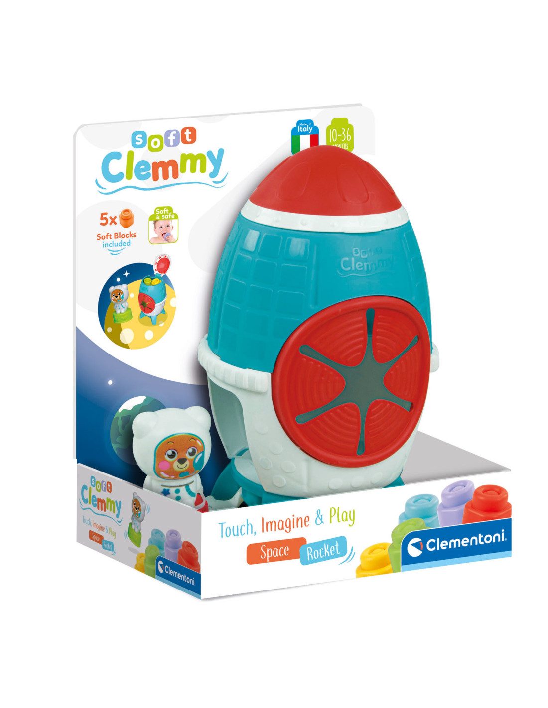 Een originele raketvormige Clemmy emmer met een leuk personage. Vol met activiteiten en blokken waarmee je veel ruimteavonturen kunt maken, stapelen en verzinnen. Het kind kan de blokken door de opening van het zachte plastic steken en ze weer pakken door het deksel te openen. Het personage kan op de blokken worden gemonteerd en in de raket worden geplaatst, klaar om te vertrekken naar het zachte Clemmy-universum! Het spelen met de blokken en de raket die rijk is aan reliëftexturen helpt het kind de tastzin te stimuleren, de handvaardigheid te ontwikkelen en de oog-handcoördinatie te verbeteren. Alle kwaliteit en veiligheid van de Clemmy wereld en de garantie van het Made in Italy.