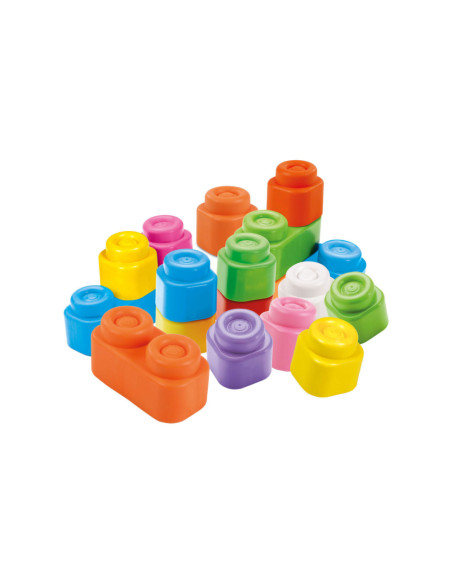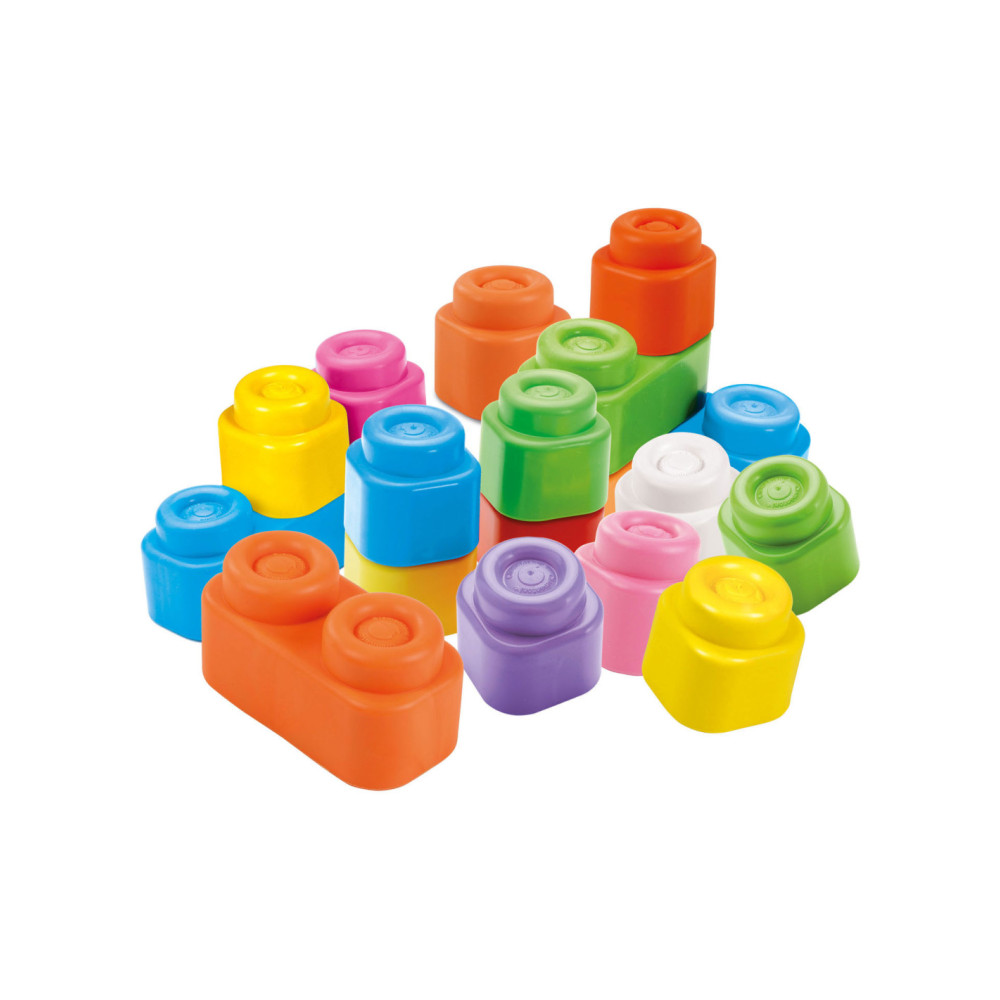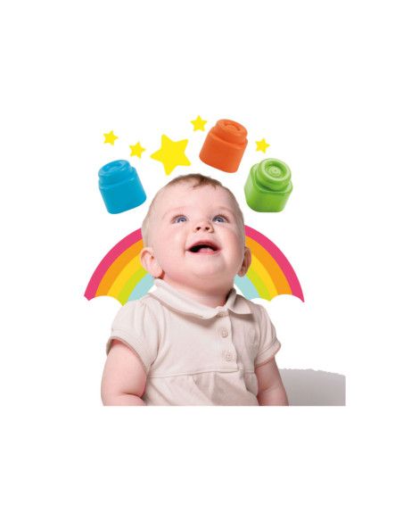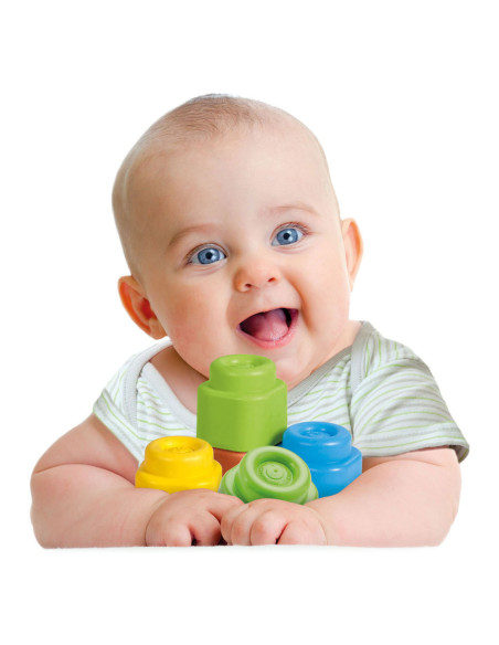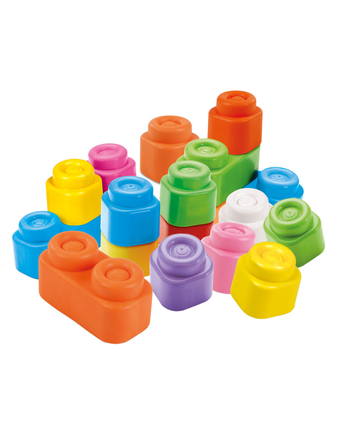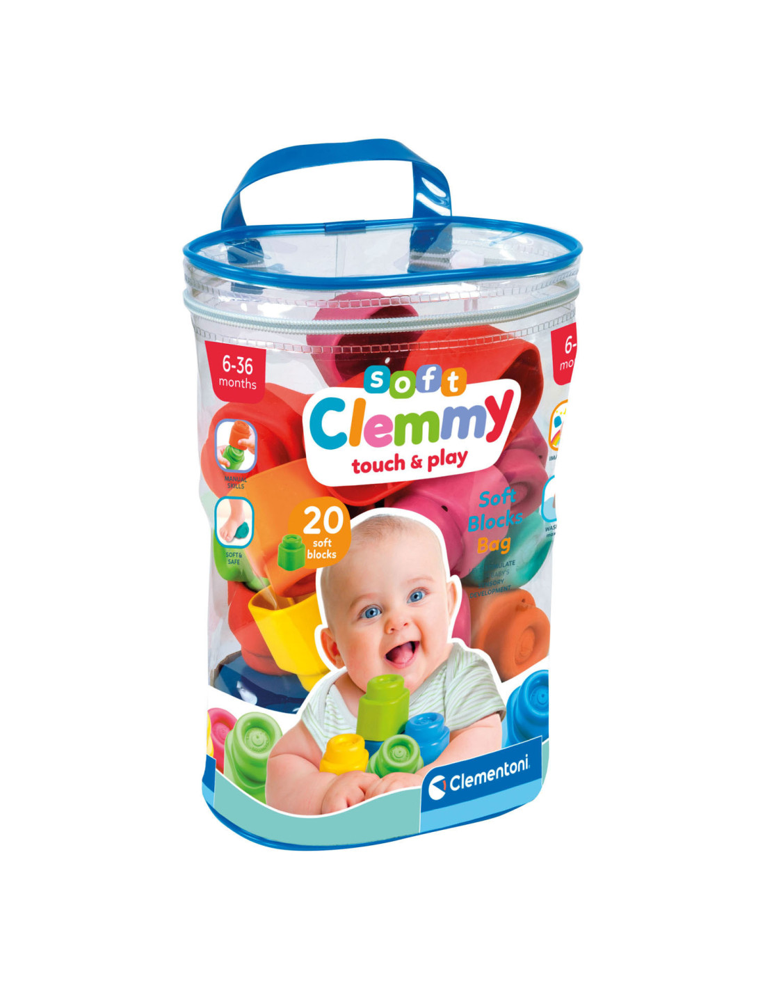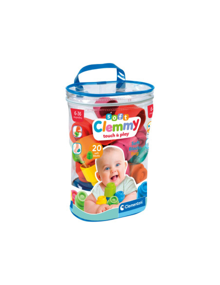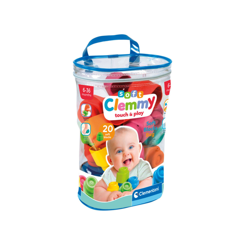 De doorzichtige tas bevat 20 Baby Clemmy's, hele zachte en gekleurde blokken die zijn ontwikkeld om kinderen van 6-18 maanden in absolute veiligheid te laten spelen. De zachte Baby Clemmy's zijn ideaal voor de zintuiglijke verkenning, met veel heldere kleuren die de visuele waarneming, de aandacht en het observatievermogen stimuleren. Ze zijn vervaardigd van niet-giftig, wasbaar, geparfumeerd materiaal, ze zijn makkelijk beet te pakken, eenvoudig op elkaar te stapelen en helpen je kind zijn fantasie en creativiteit te ontwikkelen. Alle Clemmy blokken zijn in Italië geproduceerd. Ze zijn veilig en wasbaar