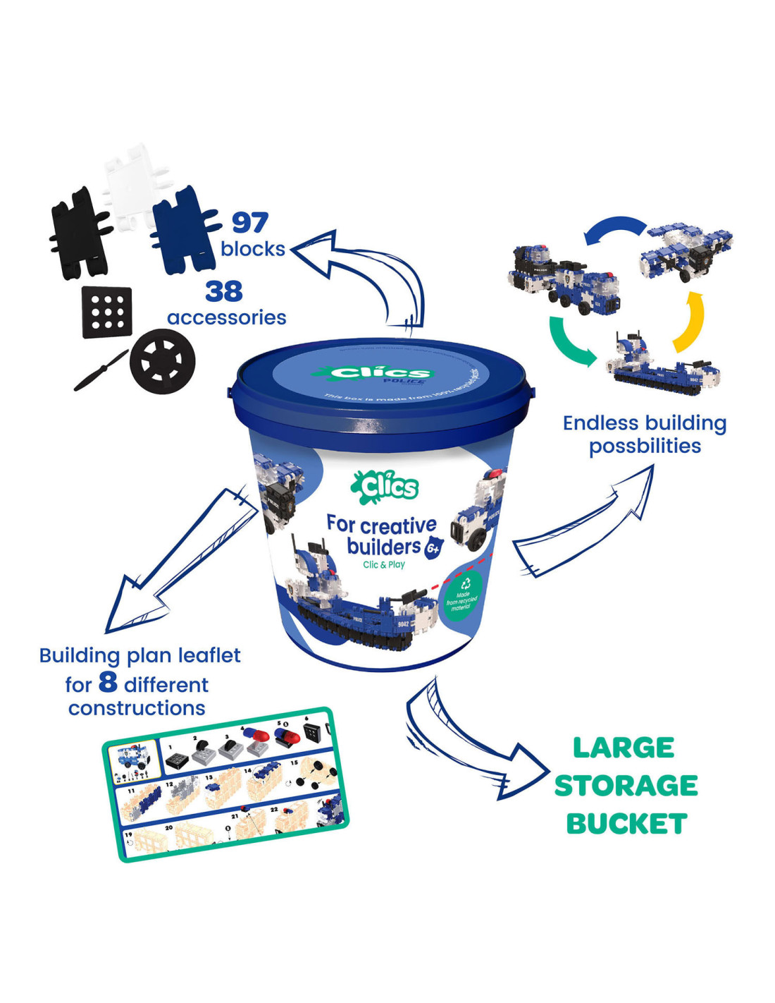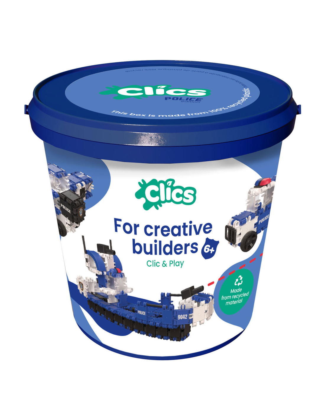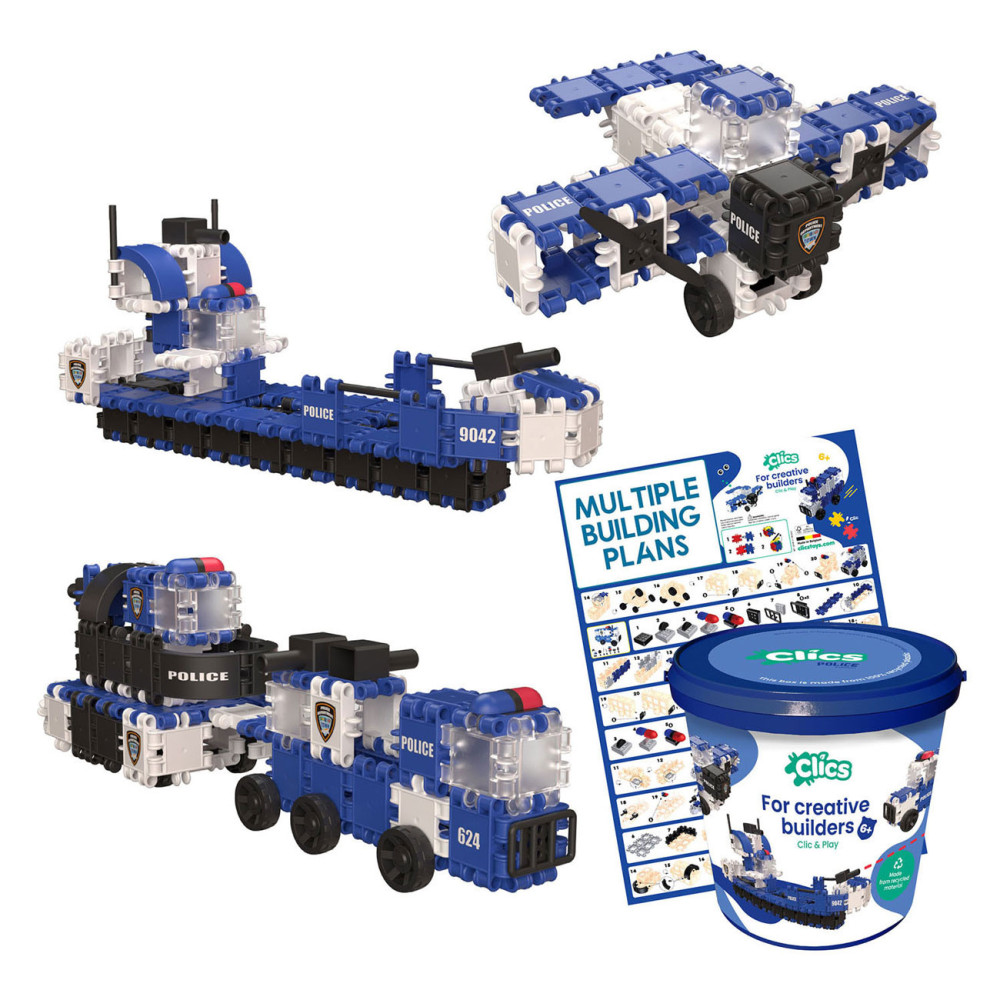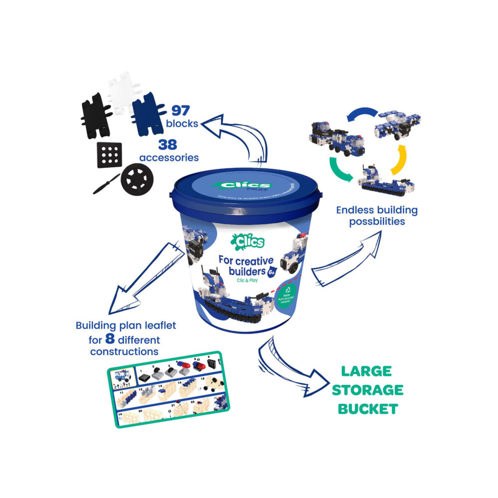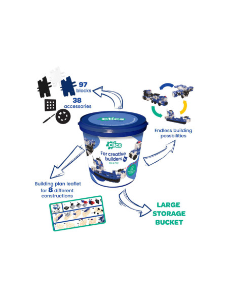 Hou je van bouwen met blokken? Dan zul je dol zijn op Clics. Want met de Clics bouwblokken bouw je je eigen wereld of die van de gratis meegeleverde bouwplannen. Met deze brandweeremmer bouw je je eigen brandweerkorps met brandweervoertuigen, vliegtuig, boot....