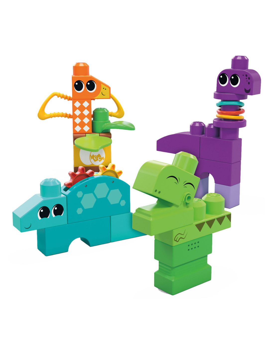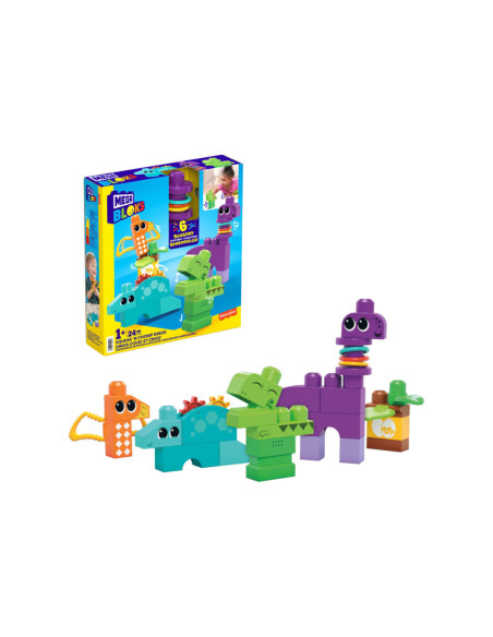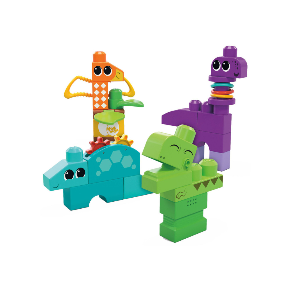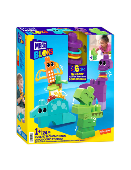 Kleine bouwers kunnen bouwen, spelen en hun zintuigen verkennen met 4 snoezige dino's. Met 6 zintuiglijke functies kunnen ze naar hartelust piepen, knarsen en draaien. Ze kunnen aan de geribbelde vleugels van de Pterodactylus voelen, rammelen met de ringen om de nek van de Brontosaurus, de tandwielen op de rug van de Stegosaurus laten draaien en de T-Rex omlaag duwen zodat de dino gaat piepen en happen. Peuters kunnen zelfs een babydino ontdekken, die verborgen is achter het draaiende blad. �??�??
