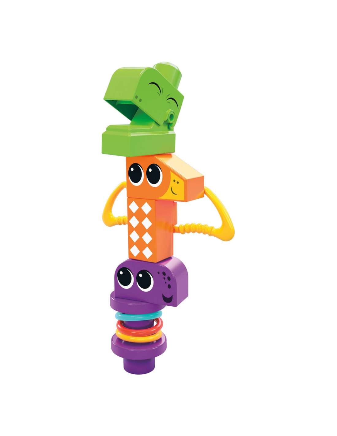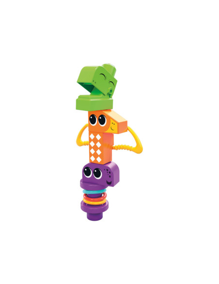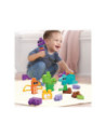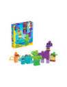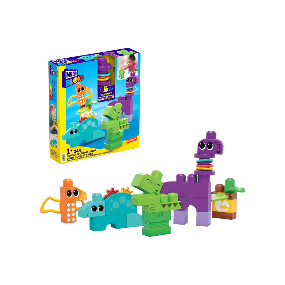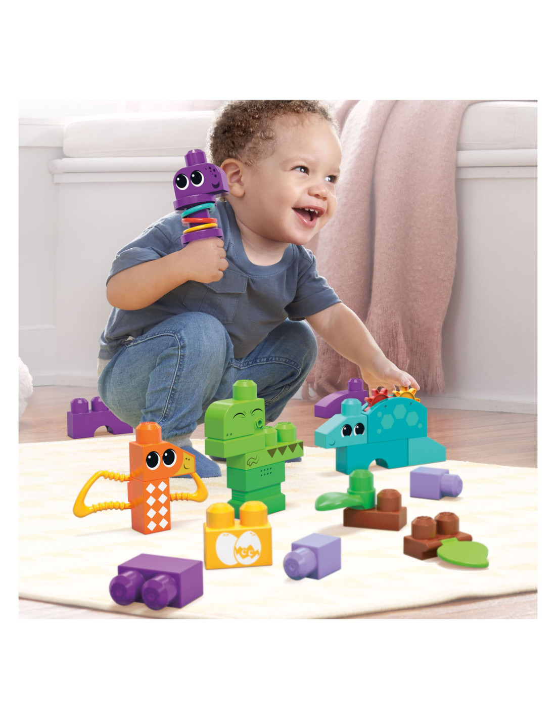 Kleine bouwers kunnen bouwen, spelen en hun zintuigen verkennen met 4 snoezige dino's. Met 6 zintuiglijke functies kunnen ze naar hartelust piepen, knarsen en draaien. Ze kunnen aan de geribbelde vleugels van de Pterodactylus voelen, rammelen met de ringen om de nek van de Brontosaurus, de tandwielen op de rug van de Stegosaurus laten draaien en de T-Rex omlaag duwen zodat de dino gaat piepen en happen. Peuters kunnen zelfs een babydino ontdekken, die verborgen is achter het draaiende blad. �??�??