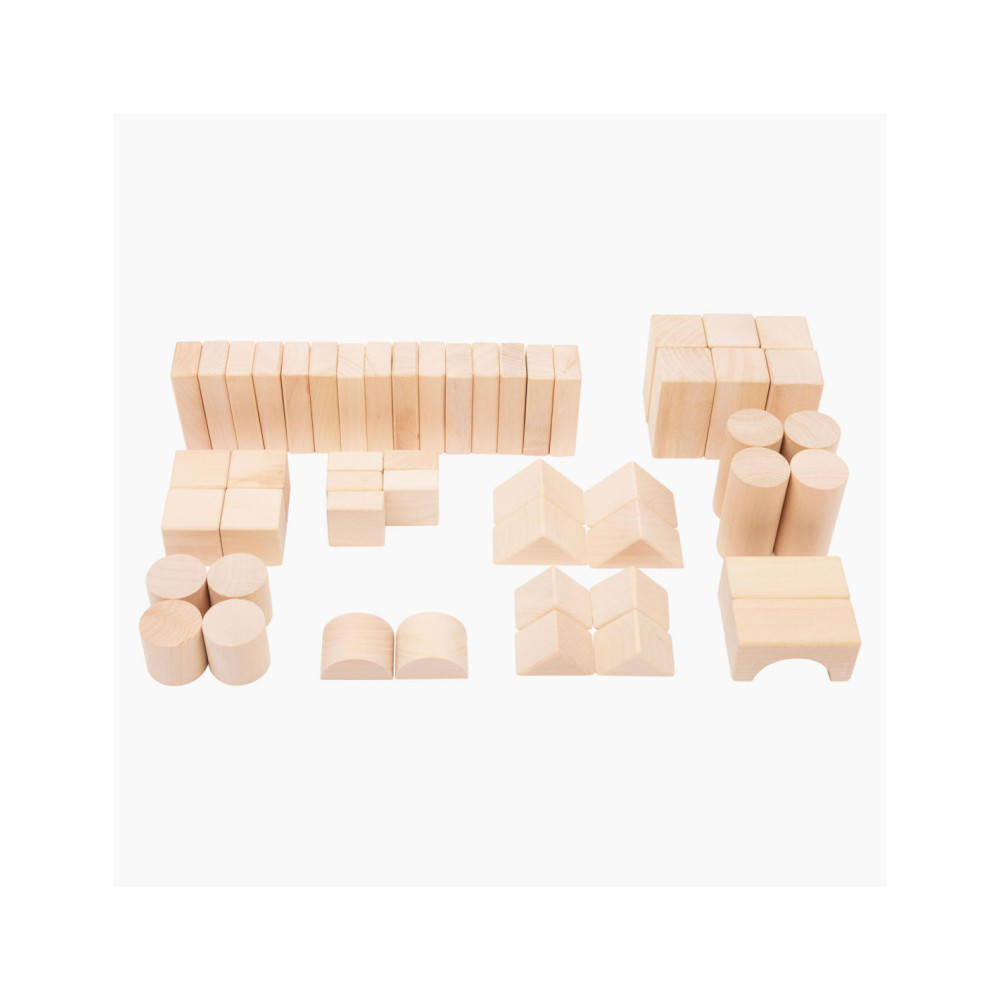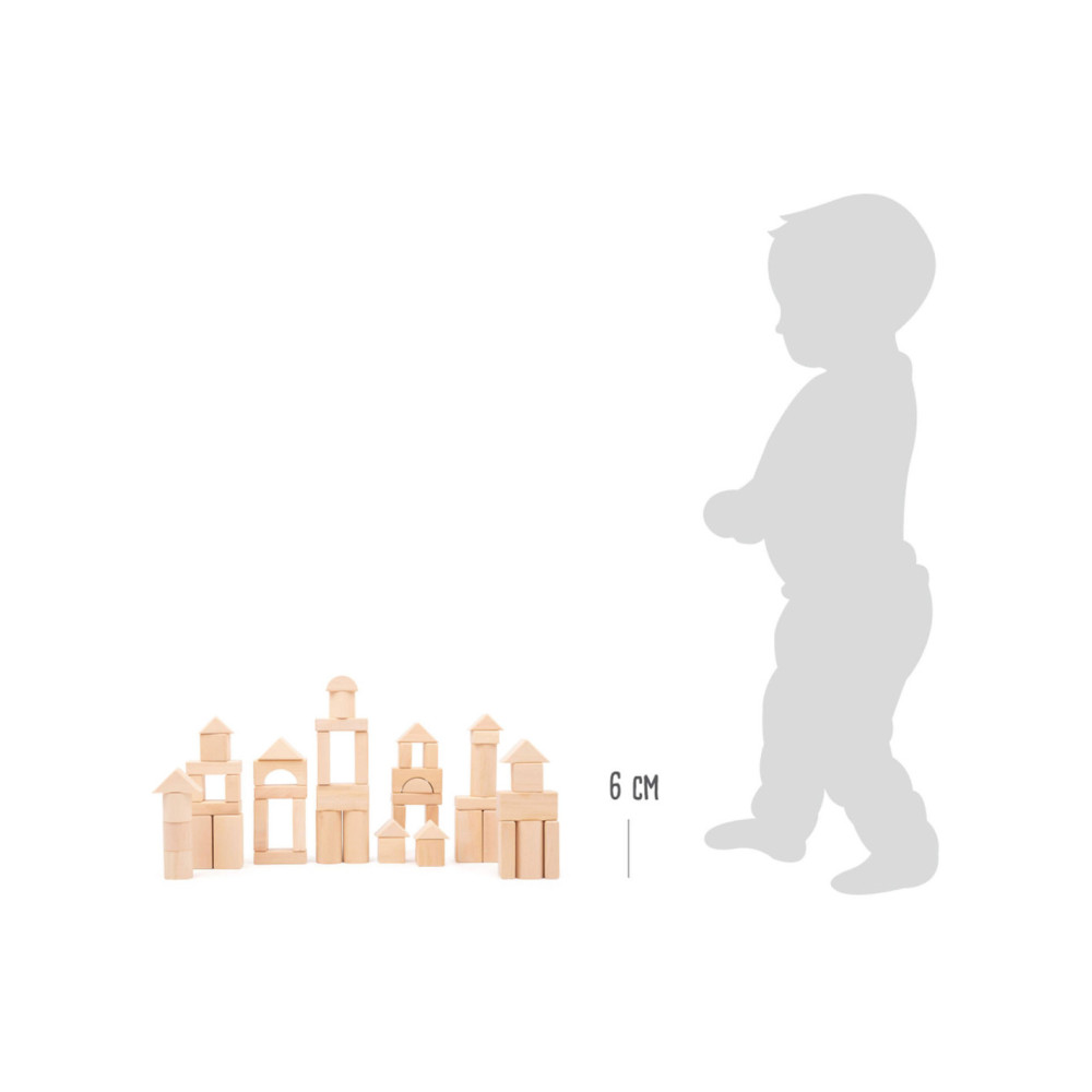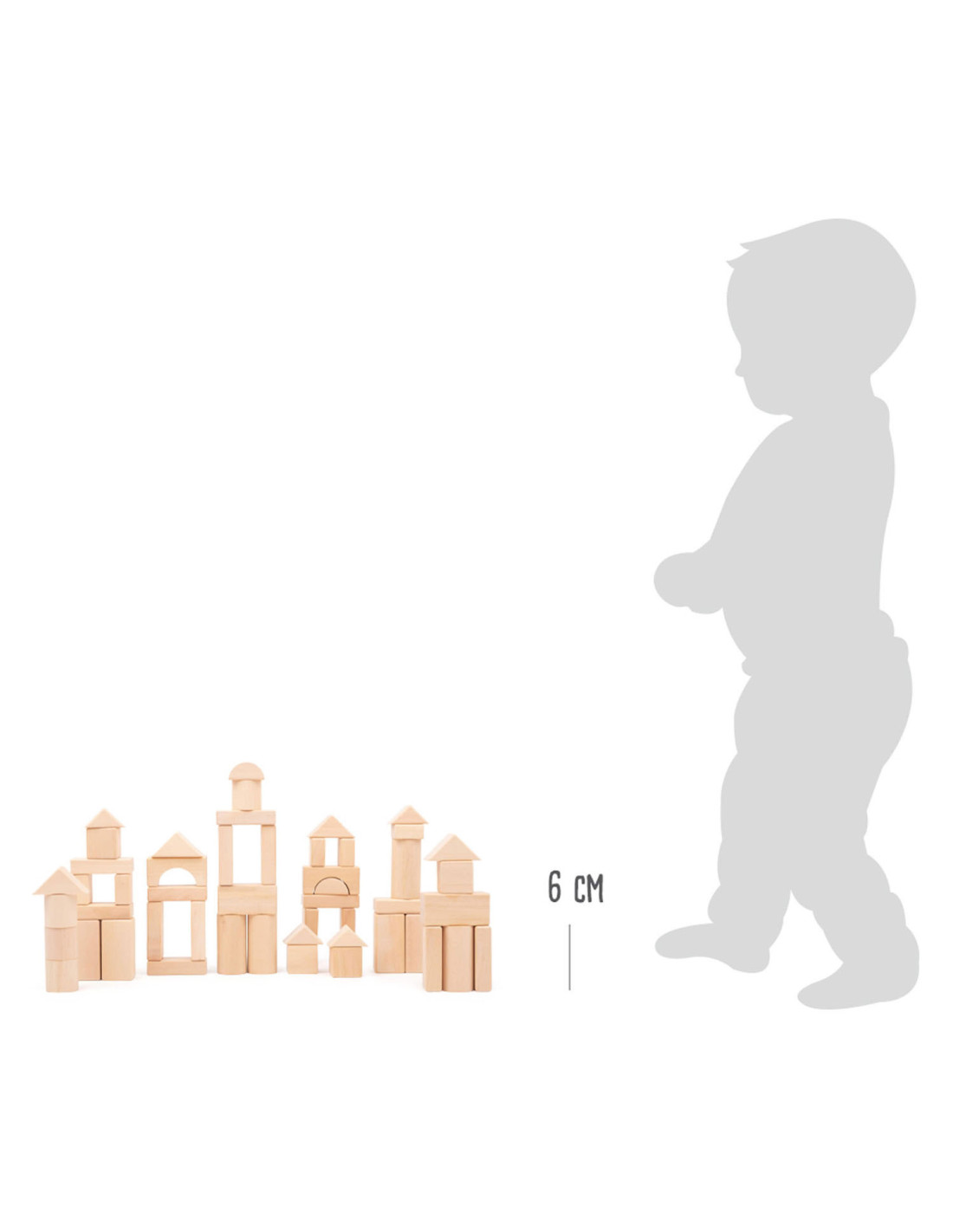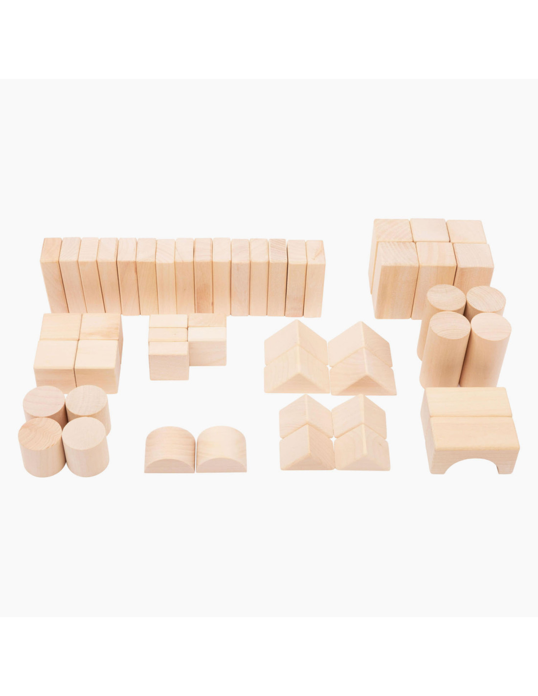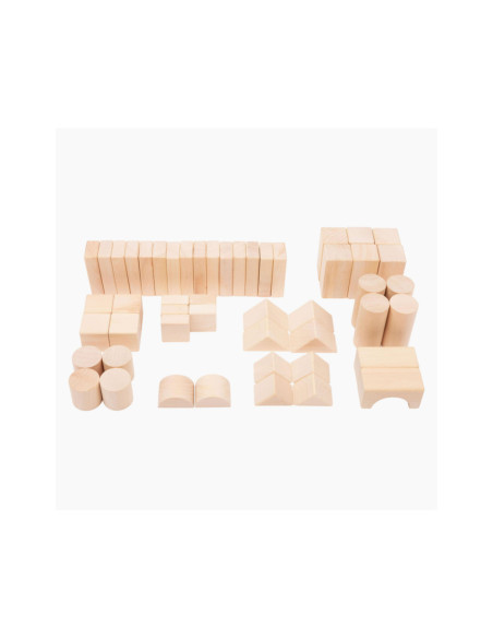 • Een uitgebreide 50-delige set bouwstenen van natuurlijk, onbehandeld hout