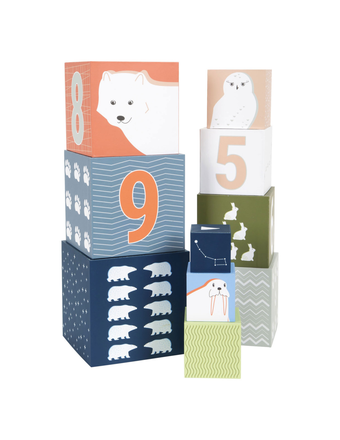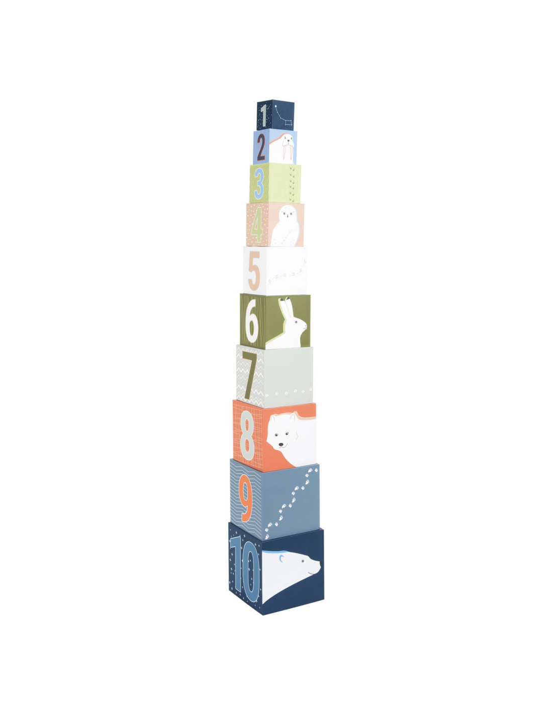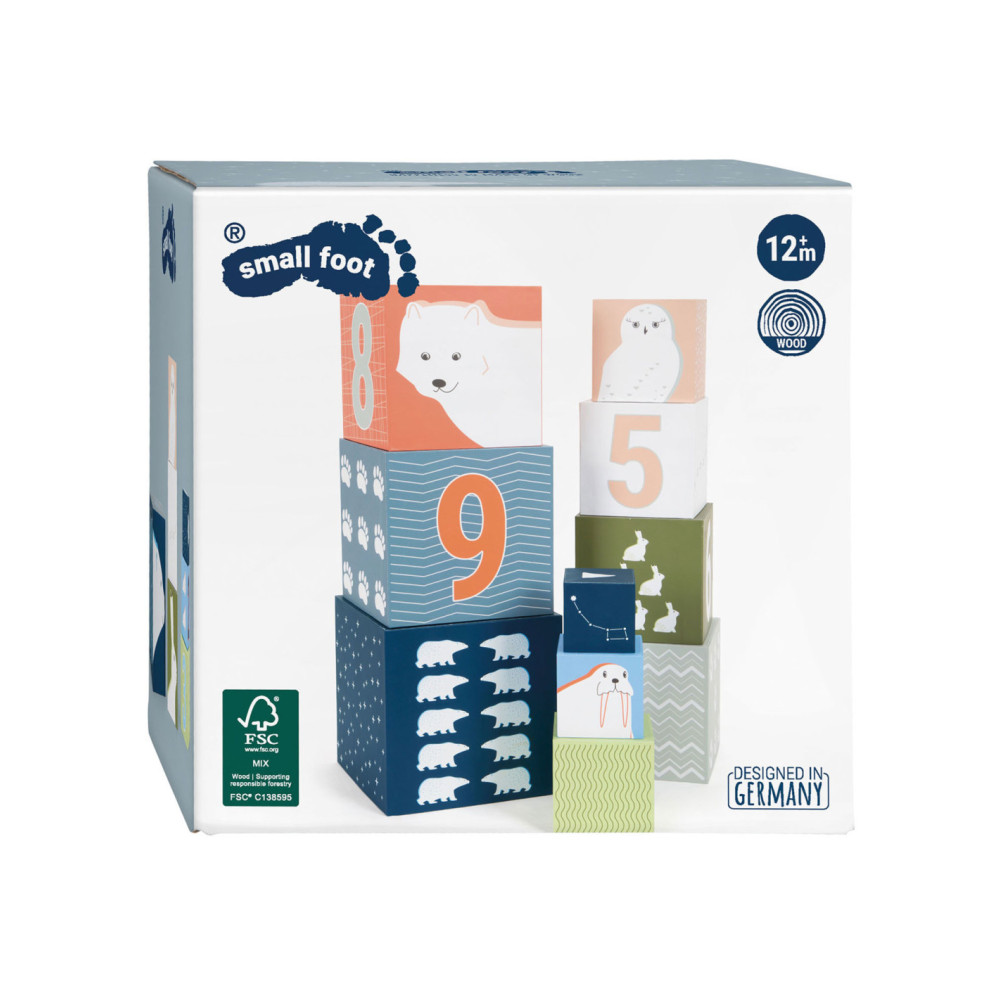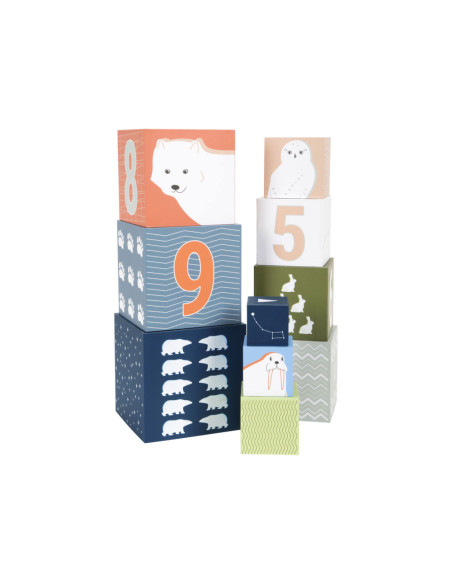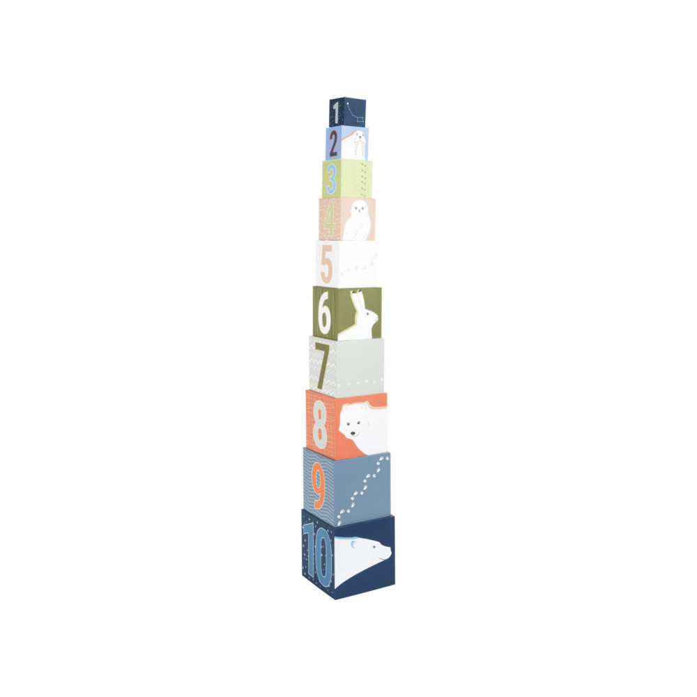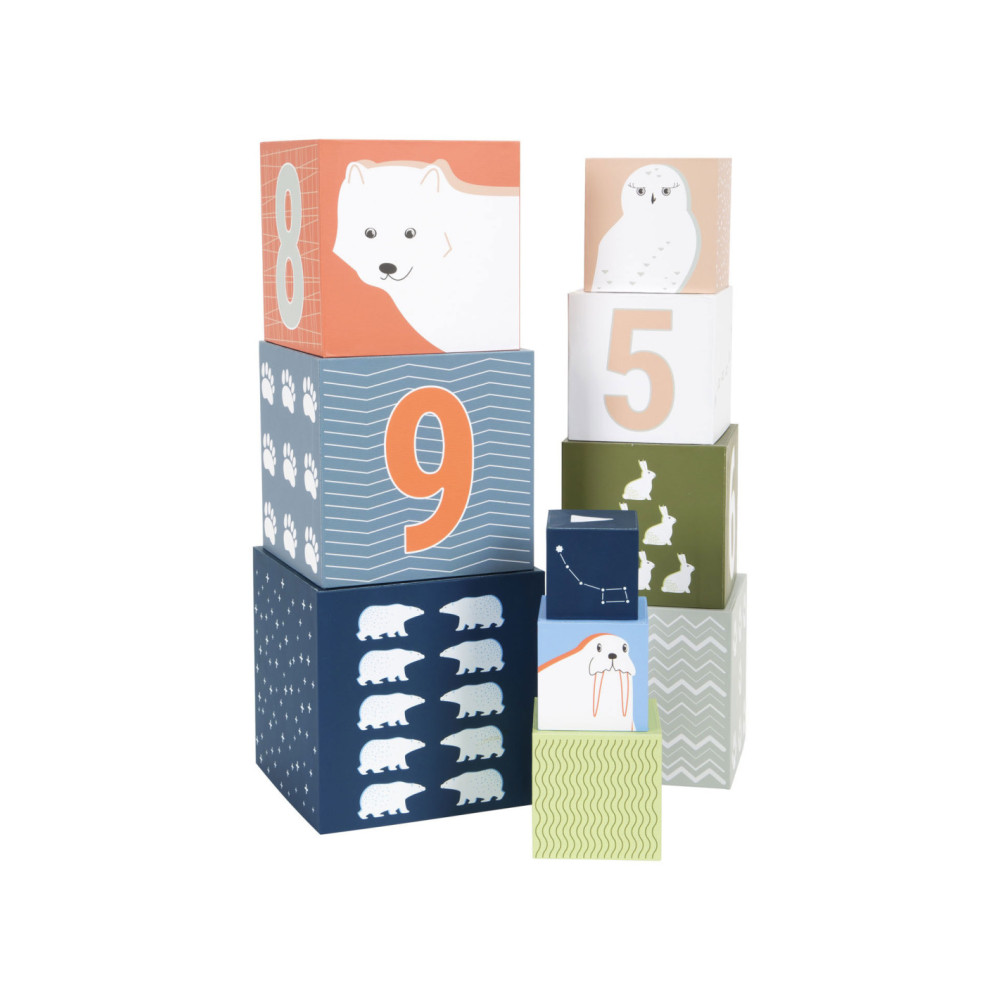 Een bezoek aan de ijsbeer, het sneeuwkonijn en hun vrienden! Met deze tien stapelkubussen van stevig FSC®-gecertificeerd karton met arctisch landschapsmotief kunnen jonge gebouwen hun stapelkunsten demonstreren en op een leuke manier de dieren van de Noordpool verkennen. Elke kubus heeft zijn respectievelijke stapelvolgnummer en een overeenkomstig aantal motieven erop gedrukt. Hiertoe behoren schattige afbeeldingen van populaire pooldieren en de sporen die ze achterlaten in de sneeuw. Het ontwerp van de kubussen is compleet gemaakt met abstracte patronen afkomstig uit de arctische omgeving. Er is een "North Star" met een overeenkomstig aantal zigzaglijnen bovenop elke kubus.