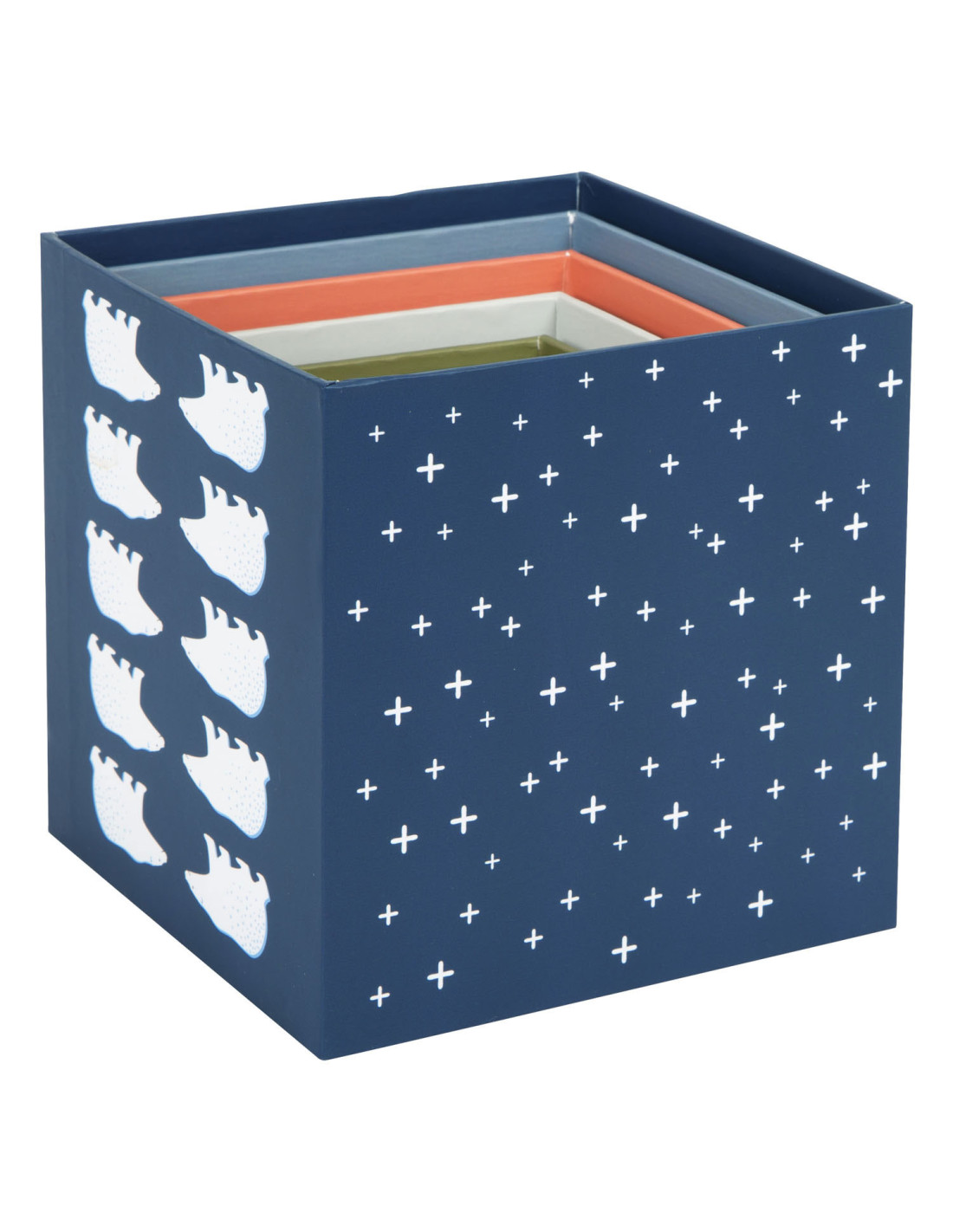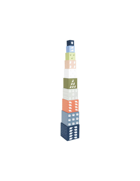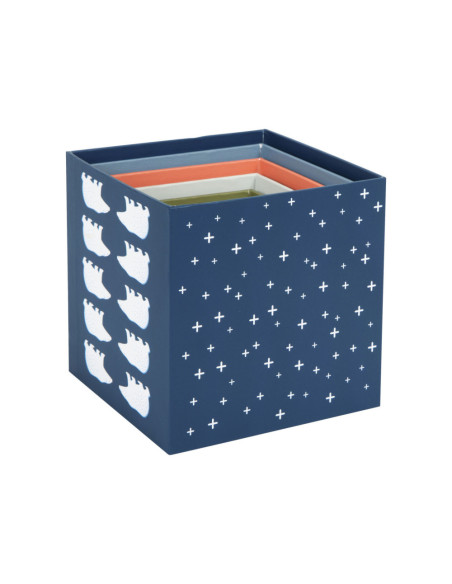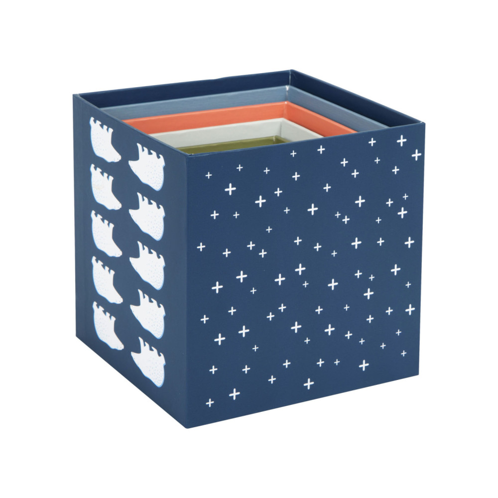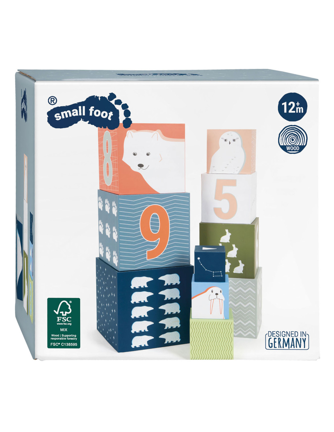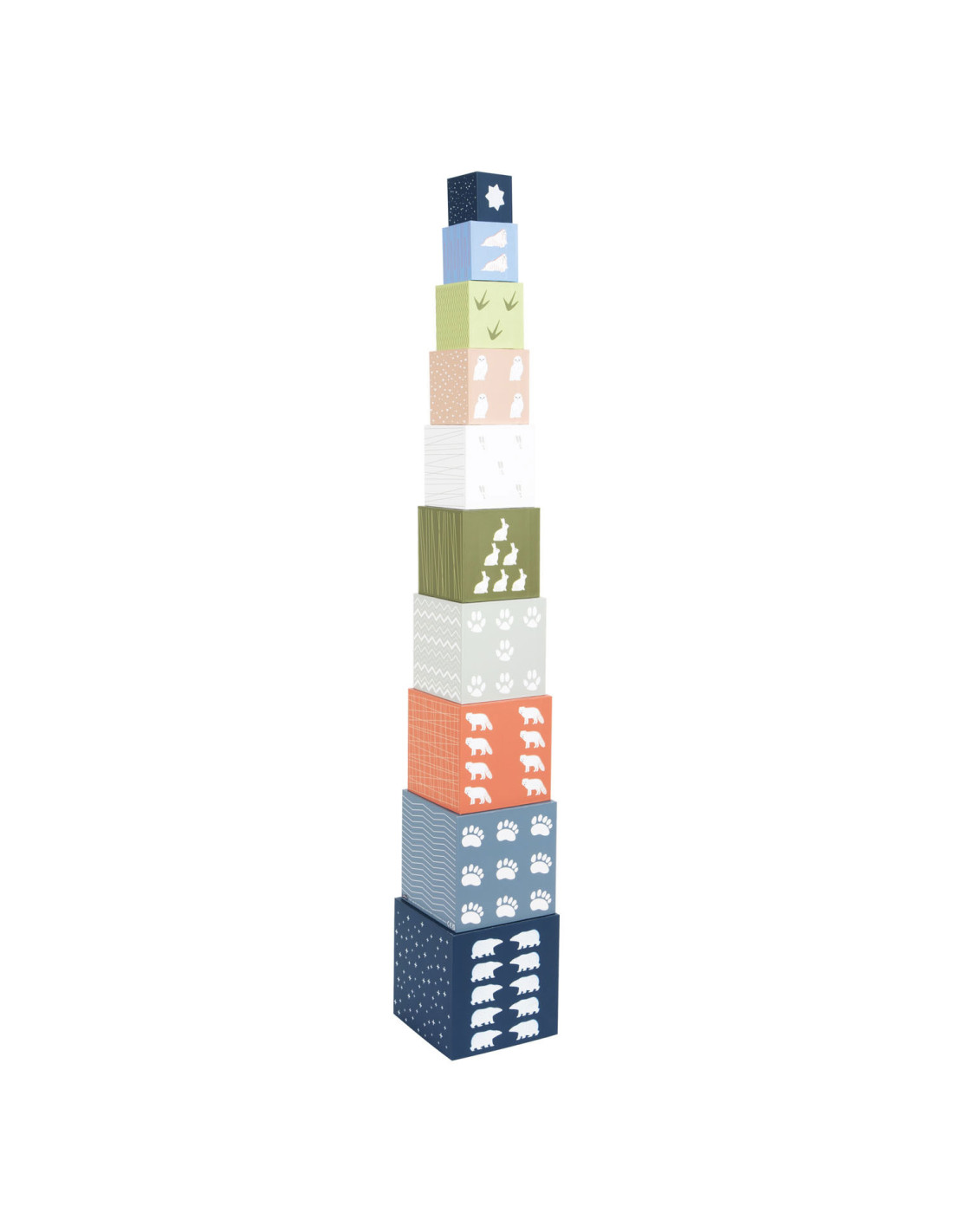 Een bezoek aan de ijsbeer, het sneeuwkonijn en hun vrienden! Met deze tien stapelkubussen van stevig FSC®-gecertificeerd karton met arctisch landschapsmotief kunnen jonge gebouwen hun stapelkunsten demonstreren en op een leuke manier de dieren van de Noordpool verkennen. Elke kubus heeft zijn respectievelijke stapelvolgnummer en een overeenkomstig aantal motieven erop gedrukt. Hiertoe behoren schattige afbeeldingen van populaire pooldieren en de sporen die ze achterlaten in de sneeuw. Het ontwerp van de kubussen is compleet gemaakt met abstracte patronen afkomstig uit de arctische omgeving. Er is een "North Star" met een overeenkomstig aantal zigzaglijnen bovenop elke kubus.