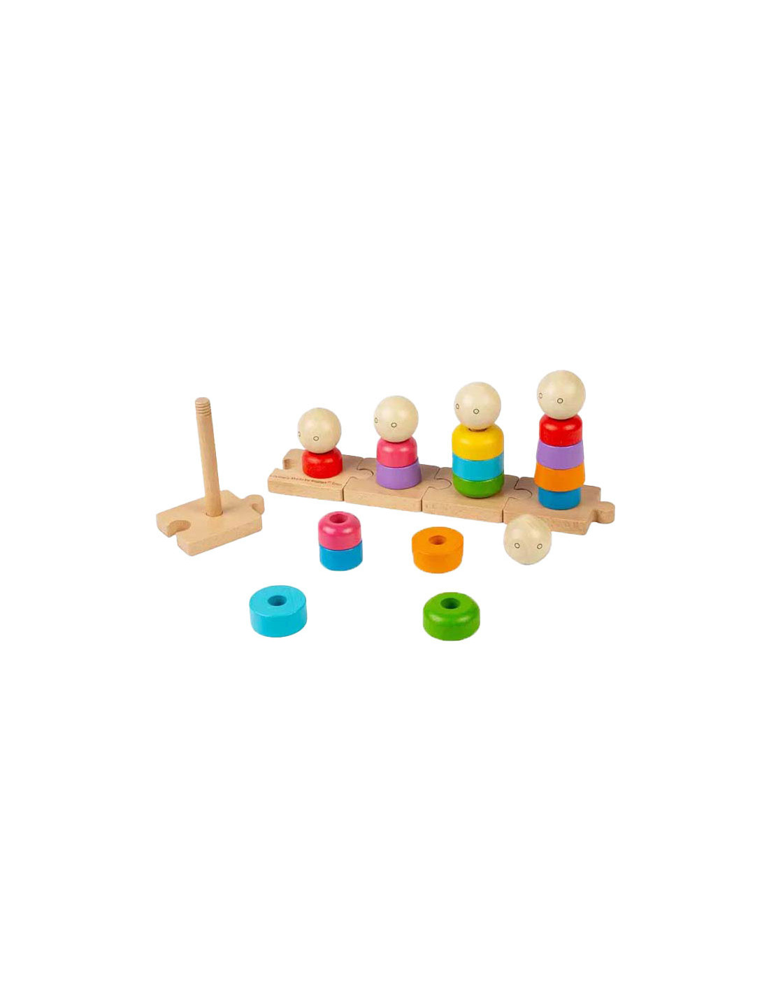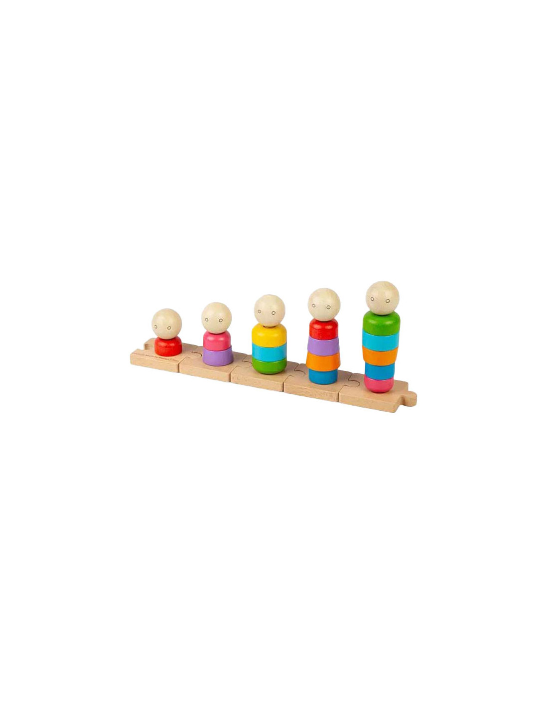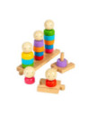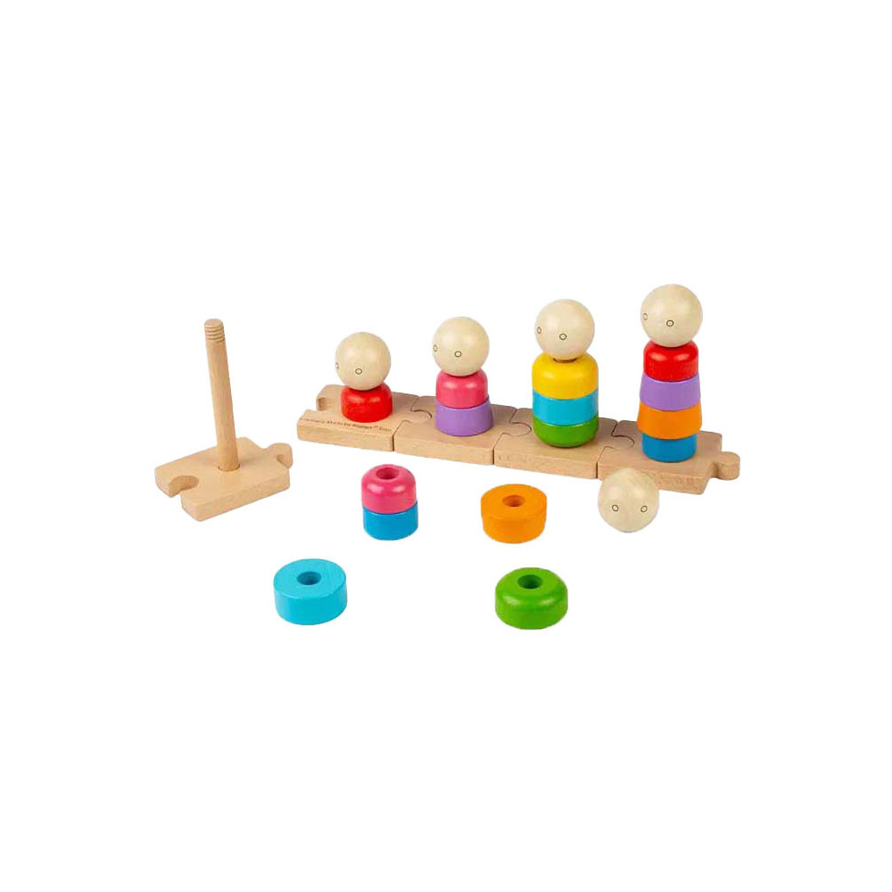 Maak stapelen en sorteren een familieaangelegenheid! Regenboog Stapelfamilie is een uniek stapelspeelgoed, met een selectie van kleurrijke vormen en gezichten die op vijf afzonderlijke pinnen passen. Elke pin staat op een klein houten puzzelstukje, dat kinderen aan elkaar kunnen verbinden, wat een extra dimensie aan het plezier toevoegt.