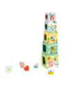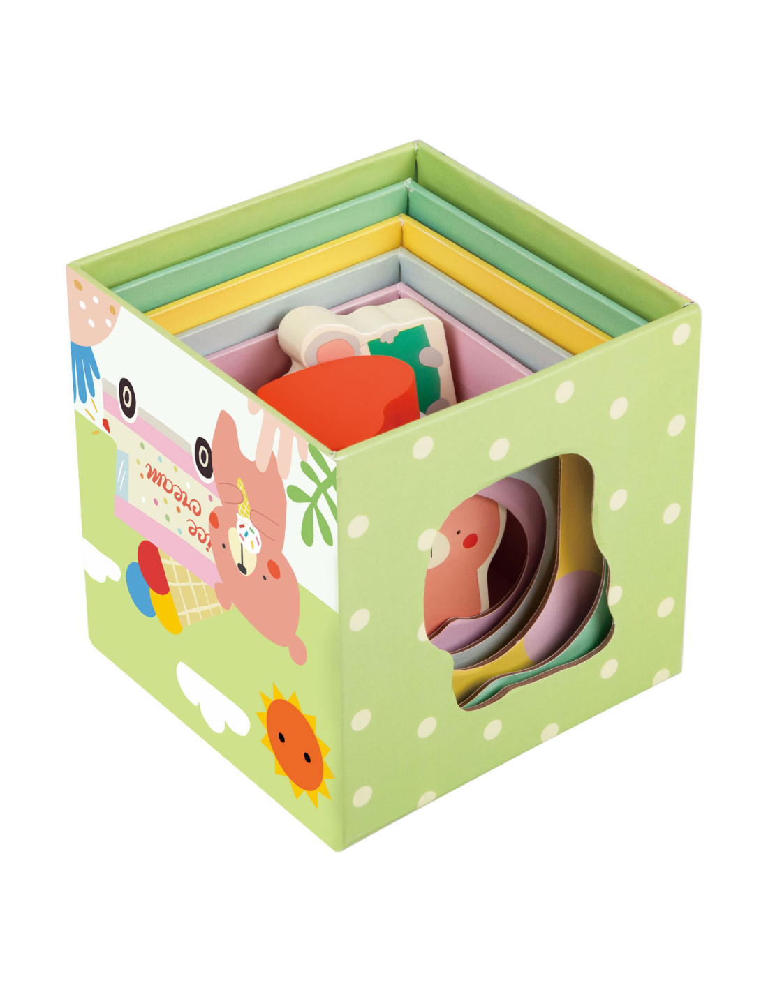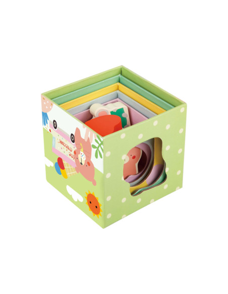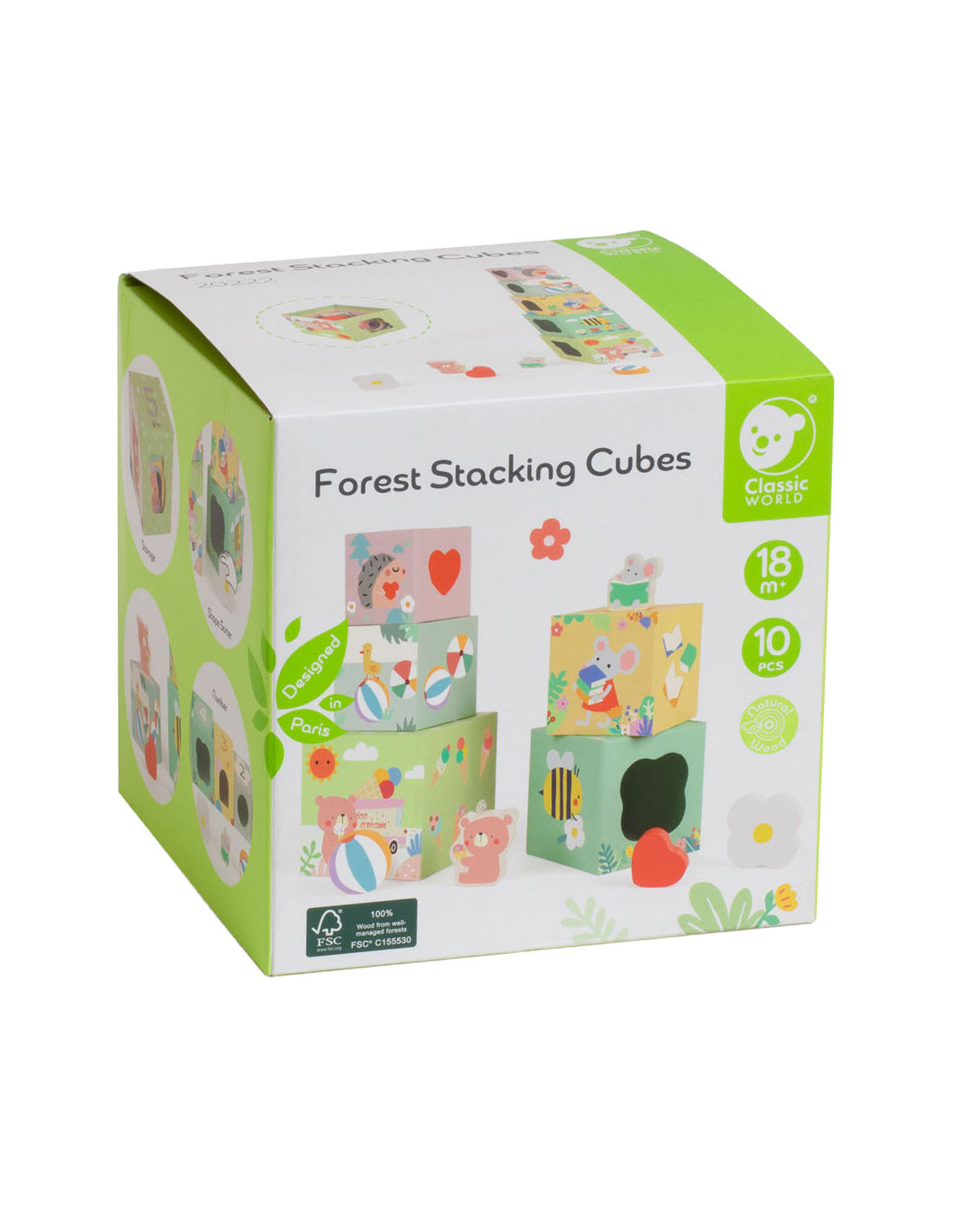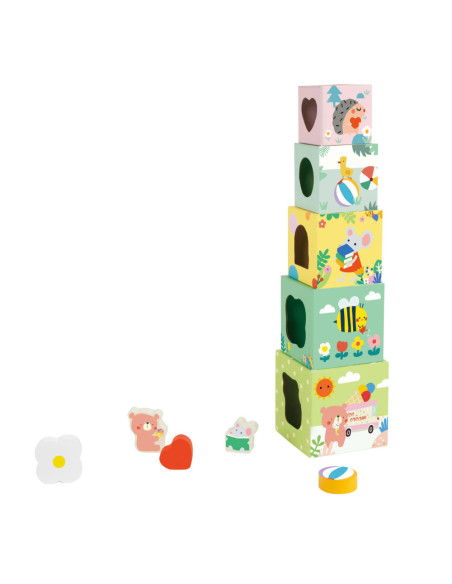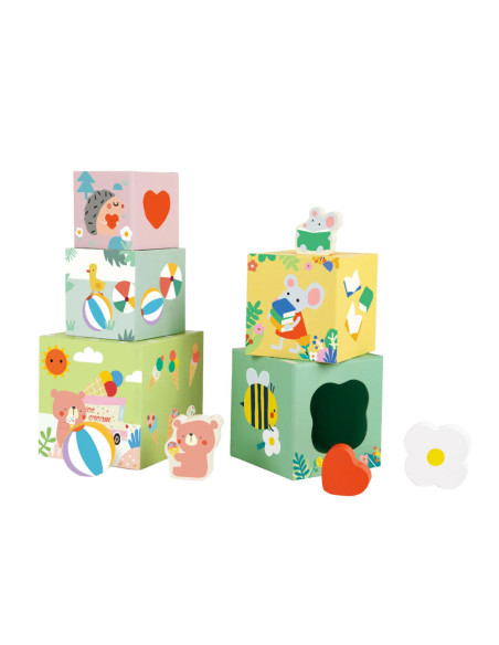 Stapelblokken met een bos-thema. De set bestaat uit 5 blokken van verschillende grote. Hiernaast zitten er ook 5 vormpjes bij die in het goede gat geplaatst moeten worden. De blokken stimuleren de motorische vaardigheden, hand-oogcoördinatie en het probleemoplossend vermogen. De blokken zijn geschikt voor kinderen vanaf 18 maanden.