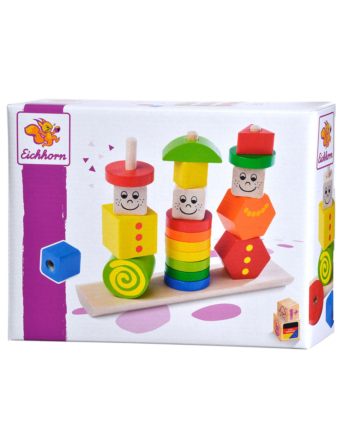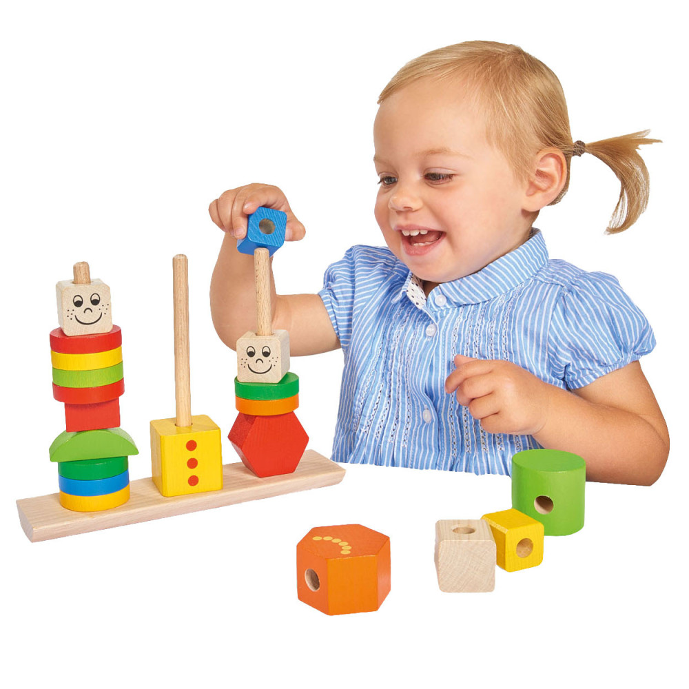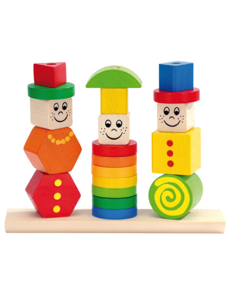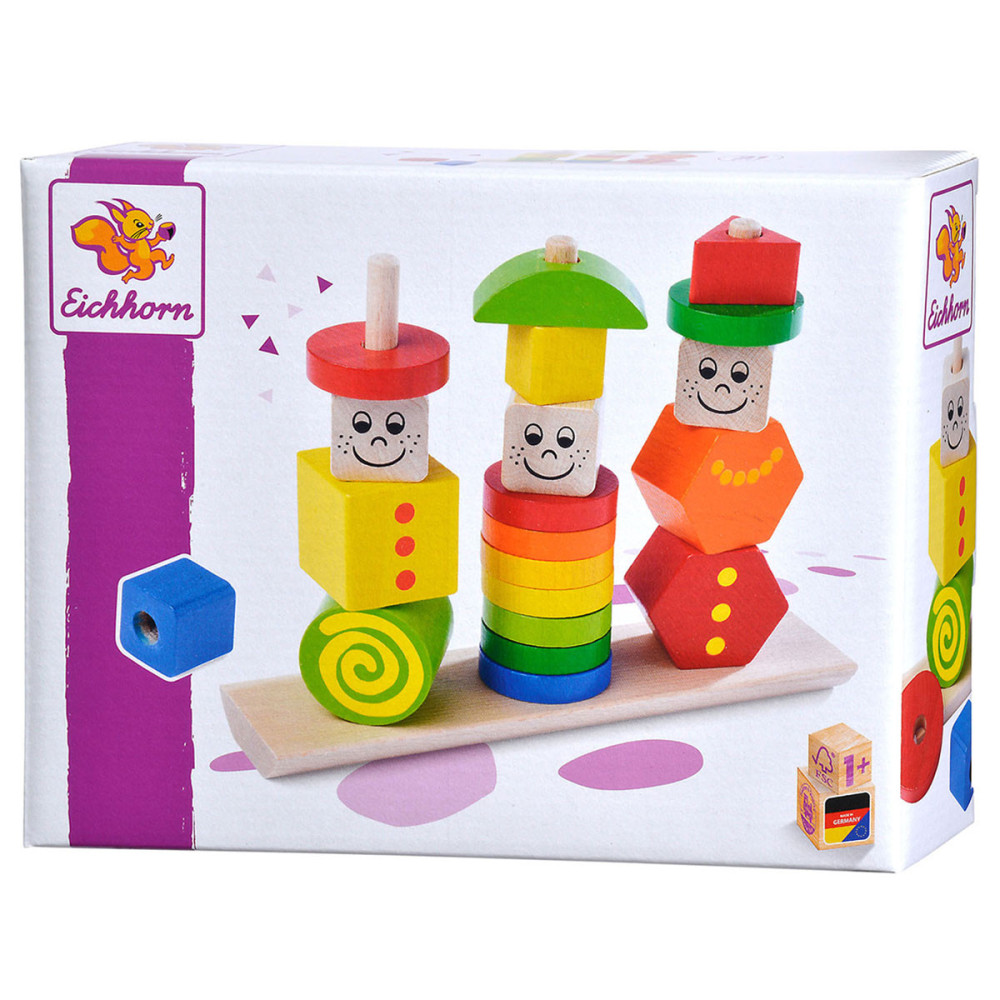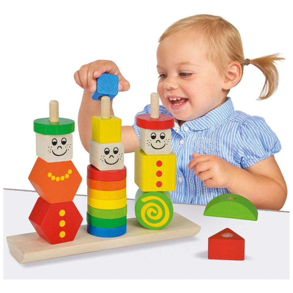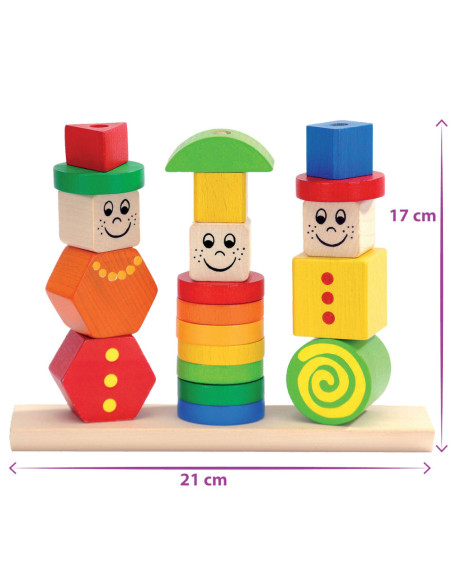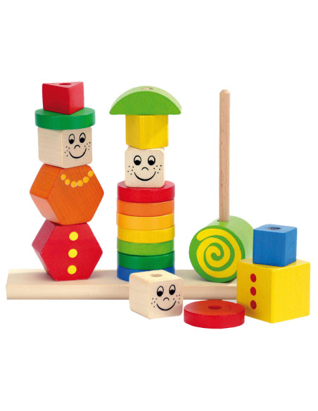 Stapel de kleurrijke figuren in verschillende vormen op de stokken en creëer grappige poppetjes met vrolijke gezichten! Deze puzzel stimuleert de fijne motoriek en oog-handcoördinatie. Geschikt vanaf 1 jaar. Gemaakt van 100% FSC®-hout.