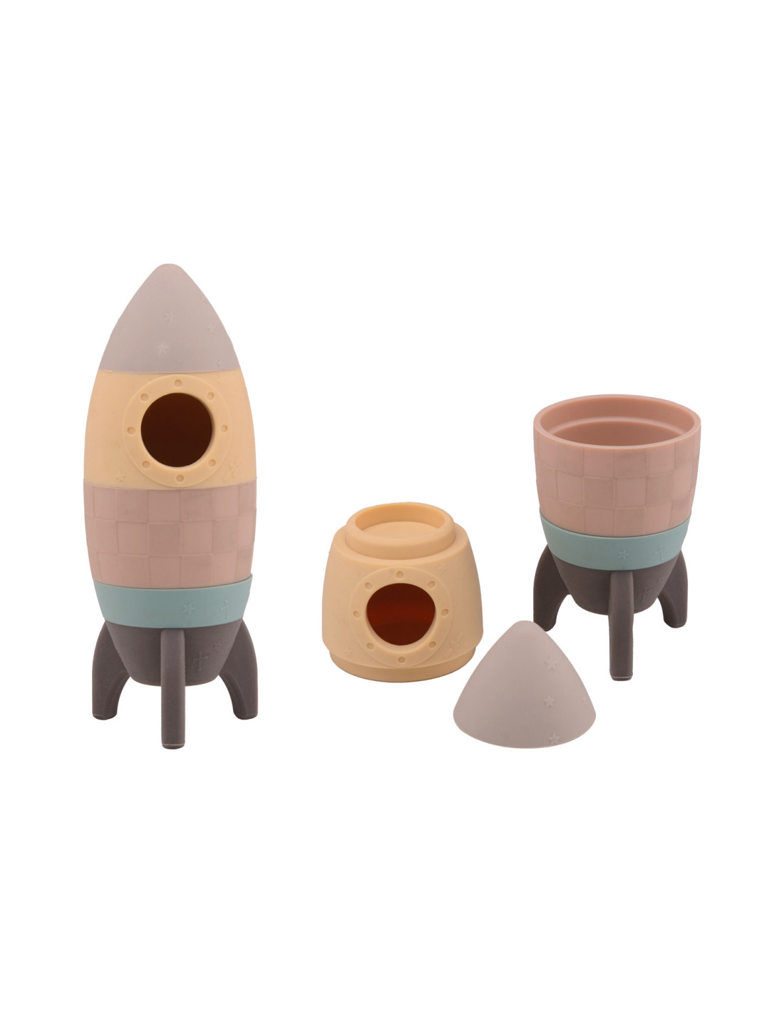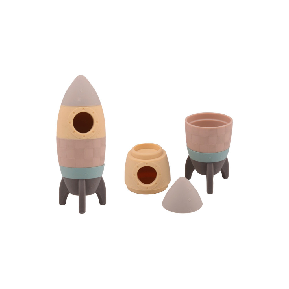 Pastelkleurige stapelraket die bestaat uit 6 delen. De onderdelen zijn gemaakt van 100% food graded siliconen en geschikt voor kinderen vanaf 0 jaar.