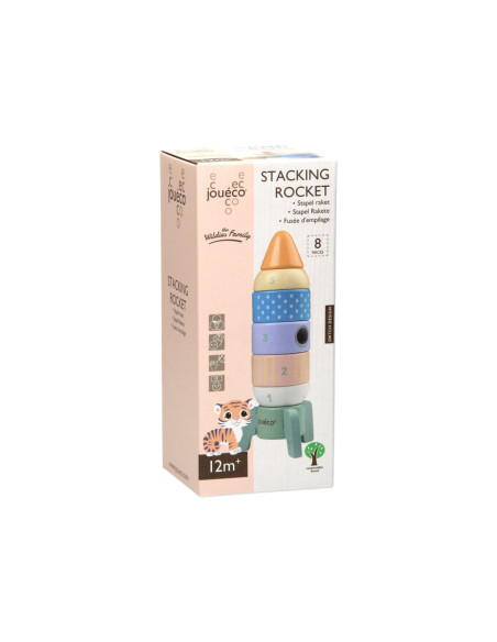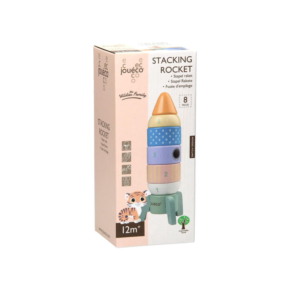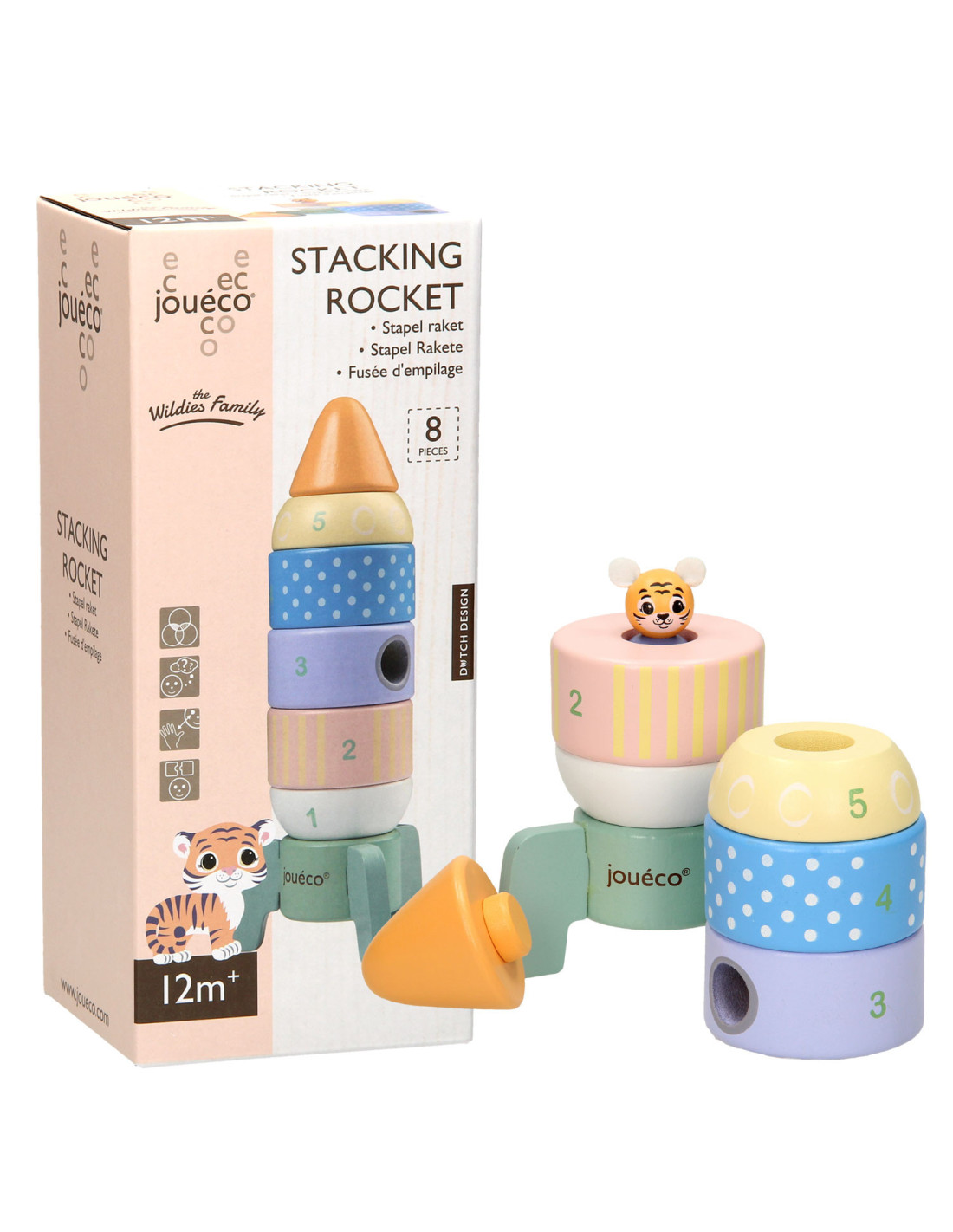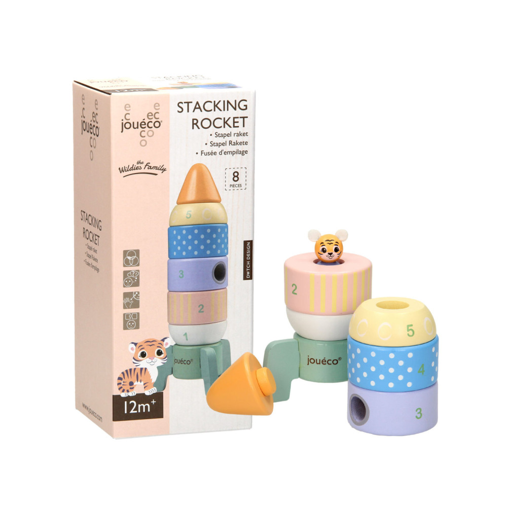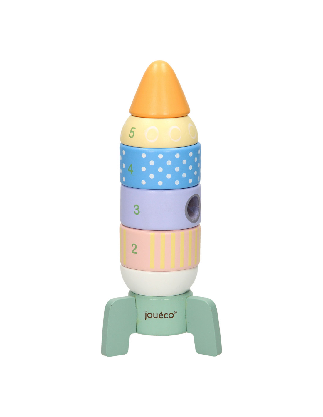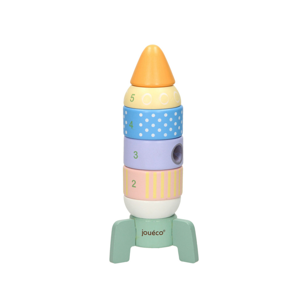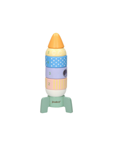 Stapel de juiste blokken en kleuren op elkaar met de Joueco Houten Stapel raket. De raket bestaat uit 8 delen met verschillende patronen en nummers. De raket heeft een hoogte van 22,7 cm. De raket is goed voor de ontwikkeling van de fijne motoriek, vorm- en kleurherkenning. Geschikt voor kinderen vanaf 3 jaar.