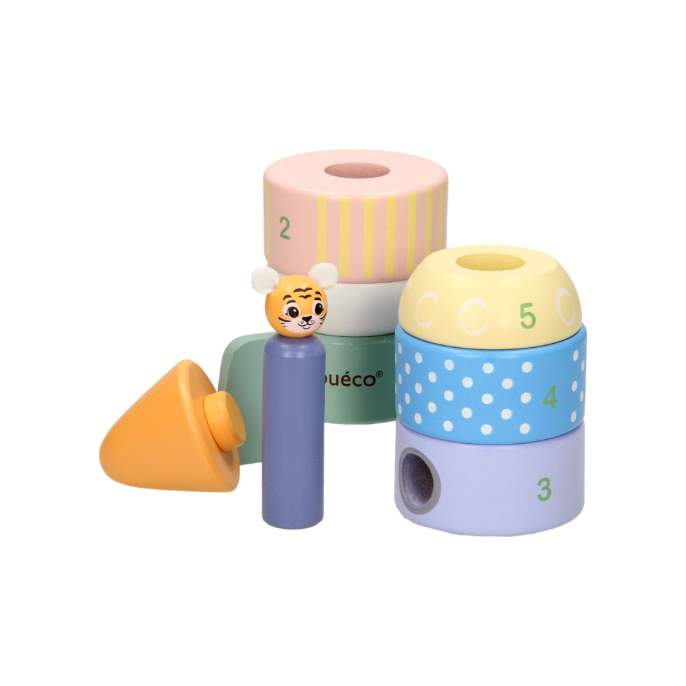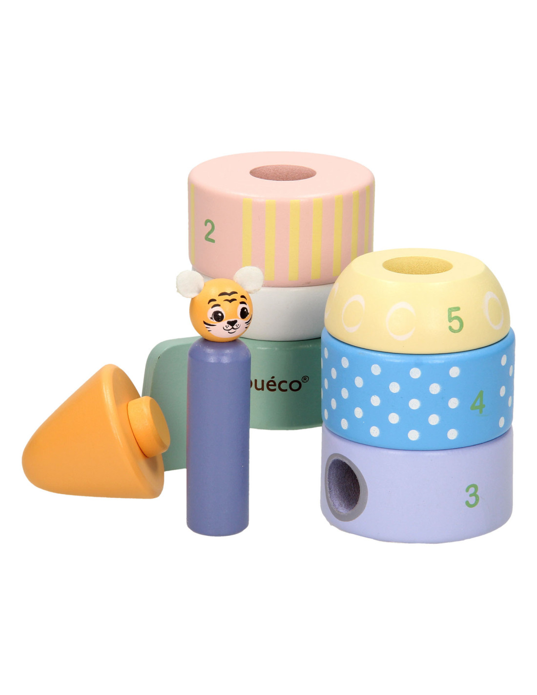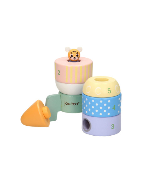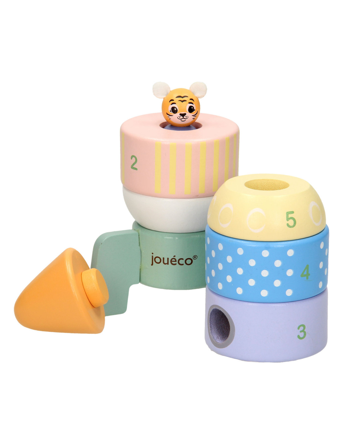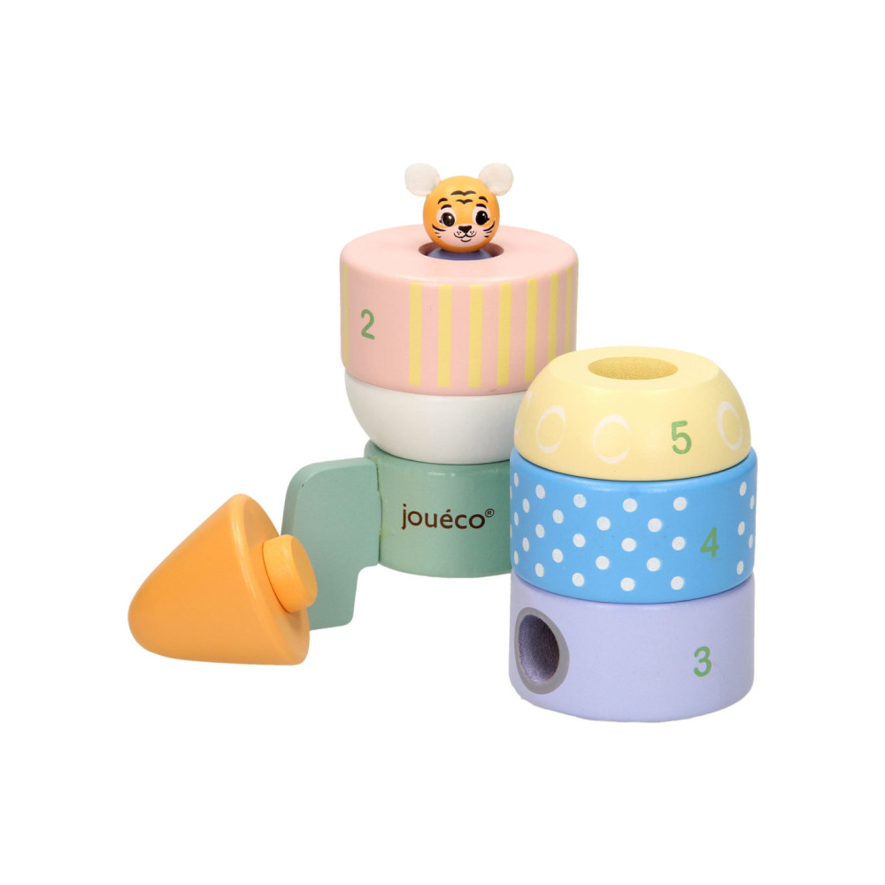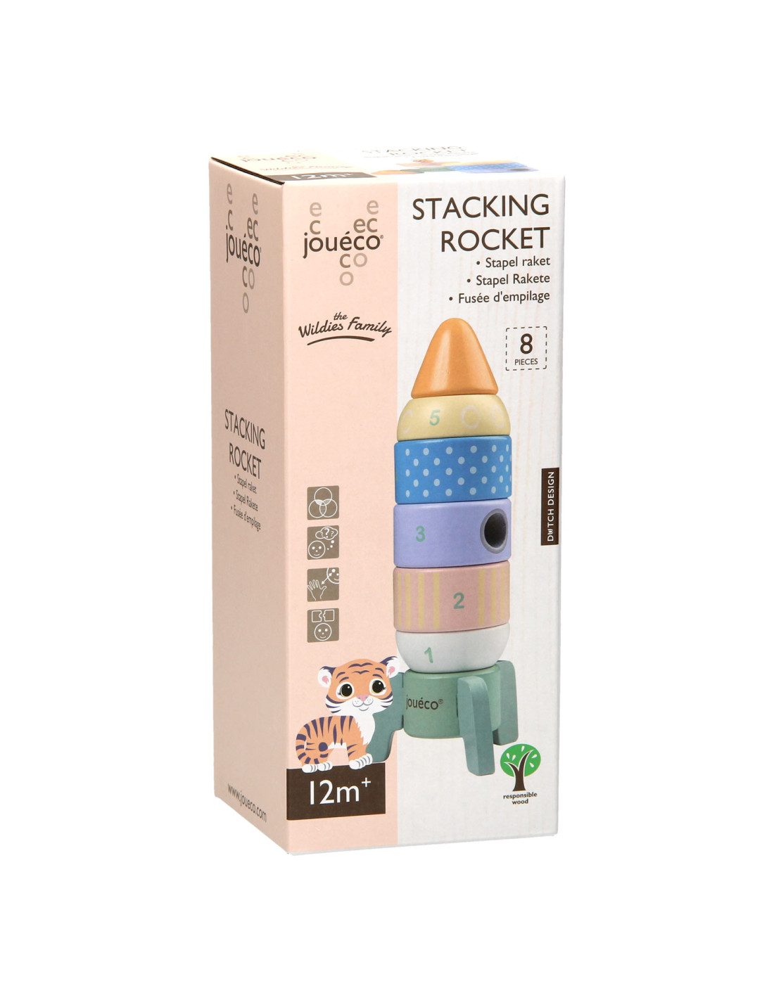 Stapel de juiste blokken en kleuren op elkaar met de Joueco Houten Stapel raket. De raket bestaat uit 8 delen met verschillende patronen en nummers. De raket heeft een hoogte van 22,7 cm. De raket is goed voor de ontwikkeling van de fijne motoriek, vorm- en kleurherkenning. Geschikt voor kinderen vanaf 3 jaar.