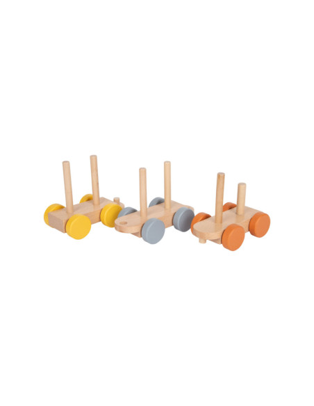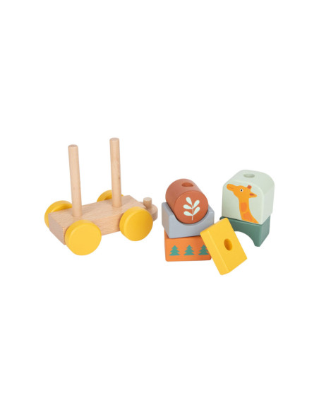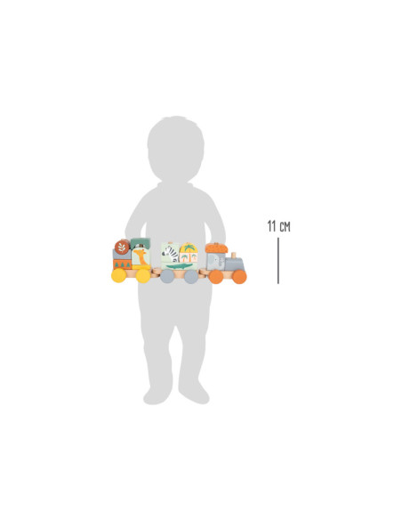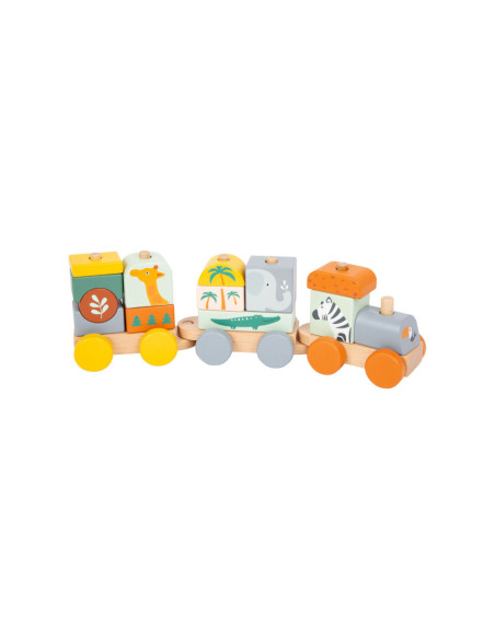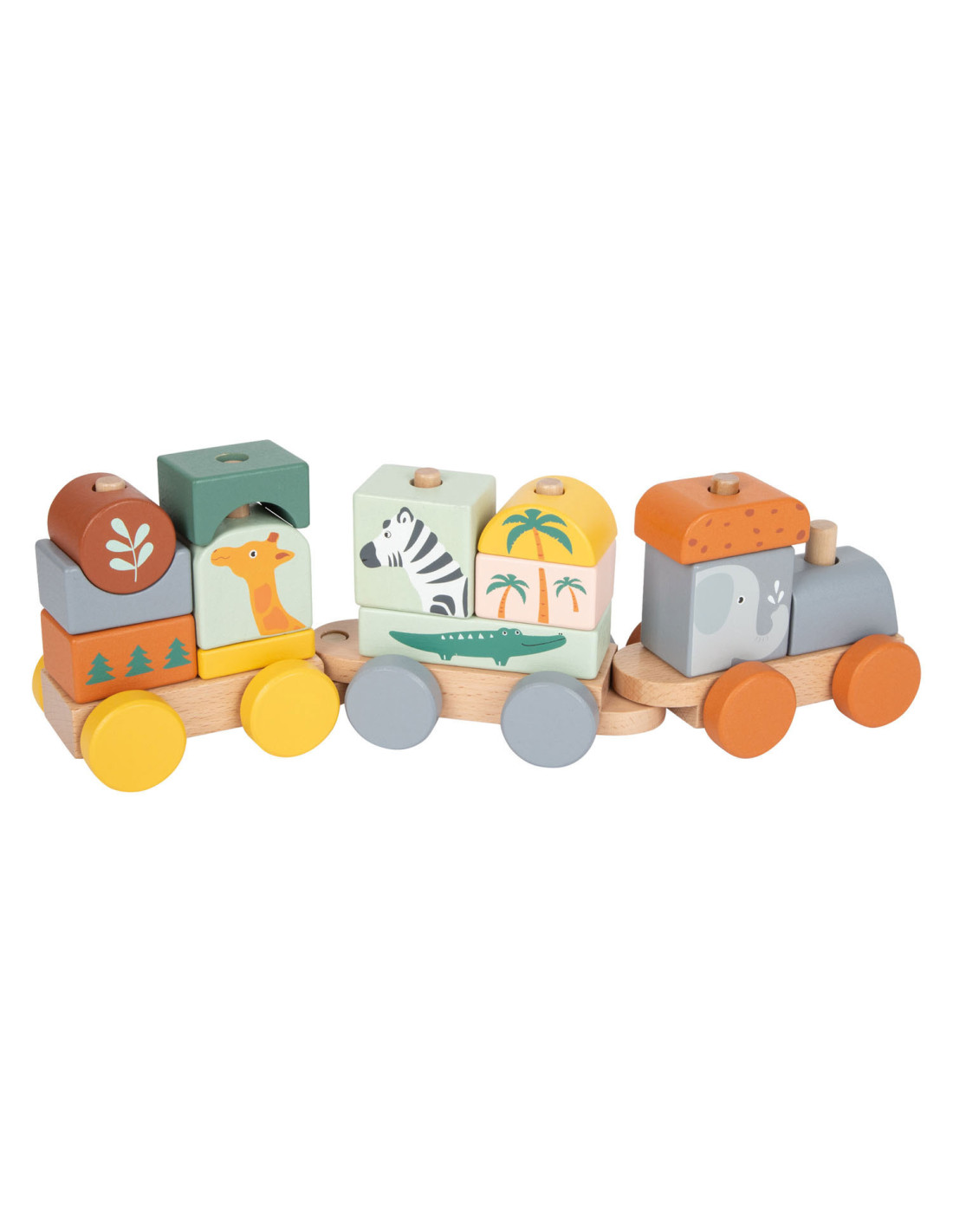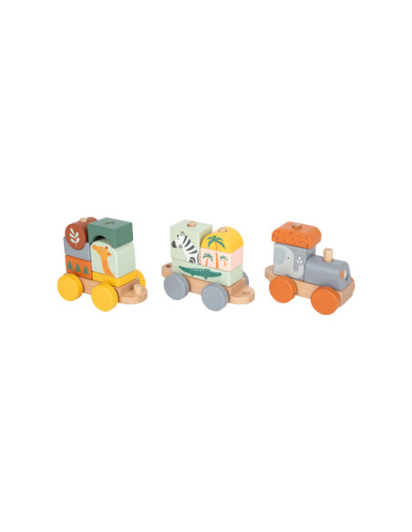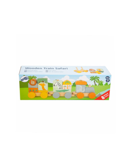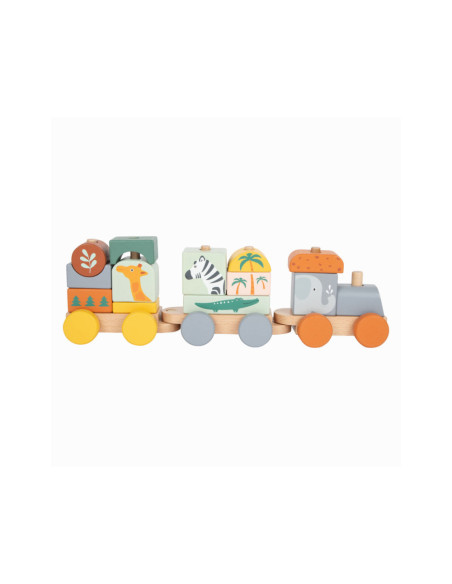 Zet de trein in elkaar en verlaat het station! Deze houten trein in trendy kleuren gaat pas op grote reis door de kinderkamer als de olifant, giraf, zebra en hun vriendjes zijn ingestapt! De rijk gedetailleerde trein die ook een vorm- en stapelspel is, biedt kinderen de mogelijkheid om naar eigen idee te bouwen. De insteekblokken zijn ook los te gebruiken als bouwstenen. Volgende stop: Safari! Door te spelen en de afzonderlijke insteekelementen in elkaar te zetten, wordt ook de motoriek getraind. Voor langdurig en afwisselend speelplezier in de kinderkamer!