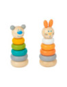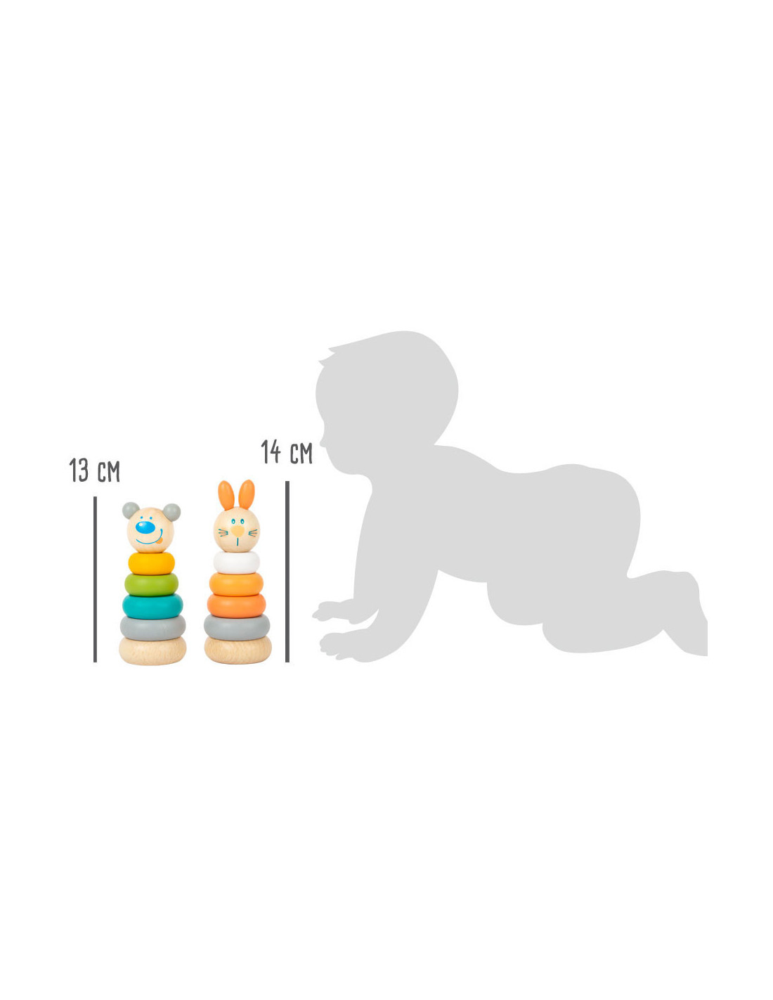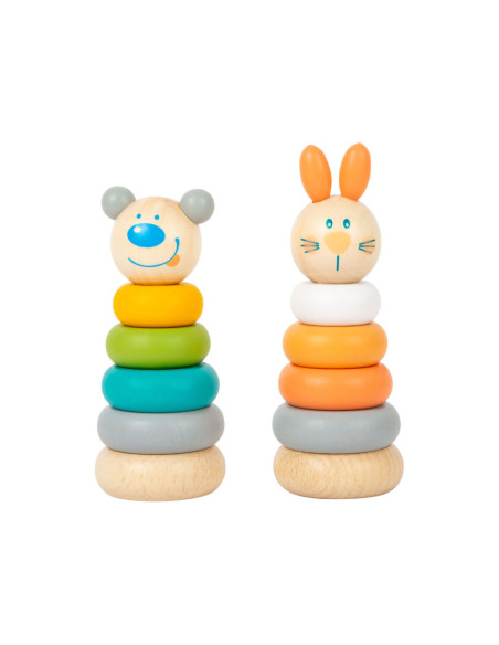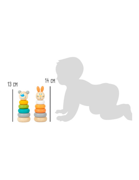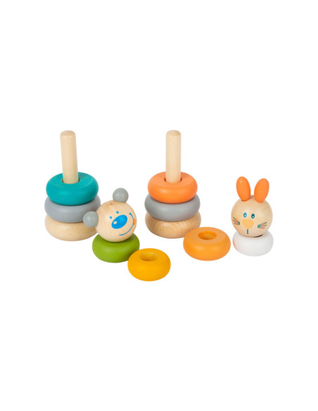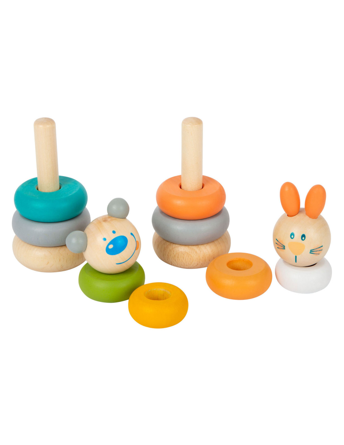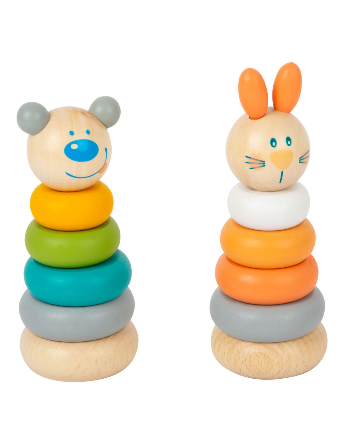 Veel speelplezier voor kleine handjes! De stapelbare haas en zijn vriend de beer met hun gemakkelijk aan te raken houten materiaal inspireren de jonge kinderen om de verschillend gekleurde ringen op maat te sorteren en ze in de juiste volgorde op elkaar te stapelen. Dit traint motorische vaardigheden, oog-handcoördinatie en begrip van vormen en maten. De pastelkleuren geven deze motorische klassieker een moderne uitstraling. Stapelspellen ontworpen voor kinderen en gemaakt van robuust hout garanderen langdurig speelplezier en zijn dankzij de compacte bouwvorm ook ideaal voor onderweg. De jongere kids zullen zich hier niet snel mee vervelen! Kinderen trainen hun motoriek, oog-handcoördinatie en begrip van vormen en maten.