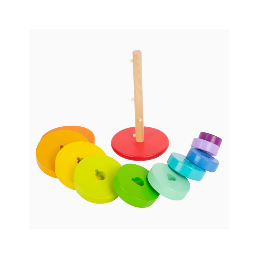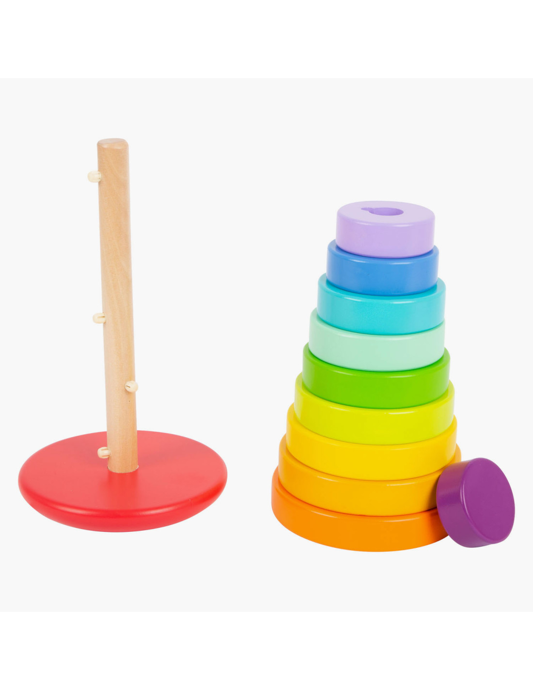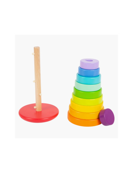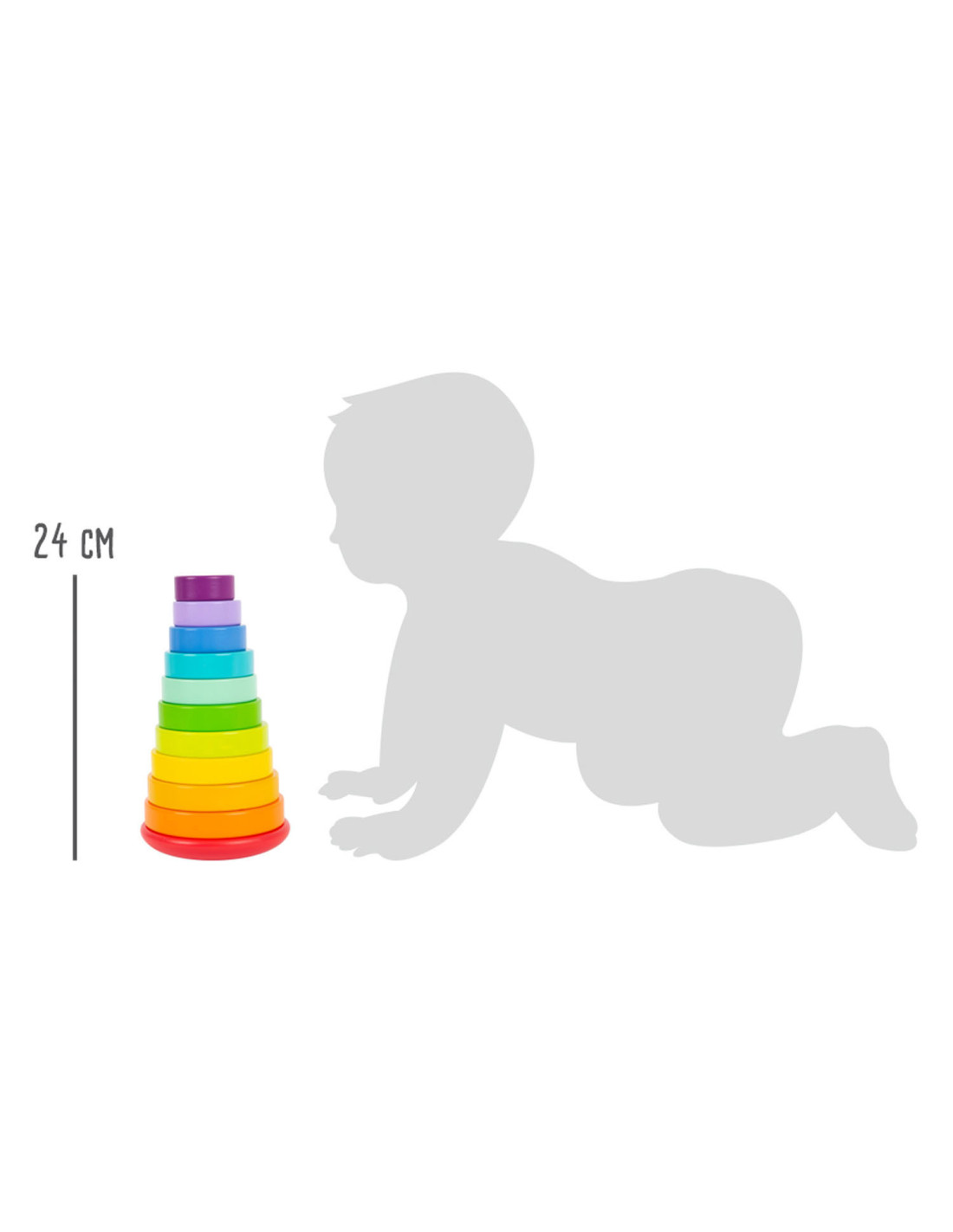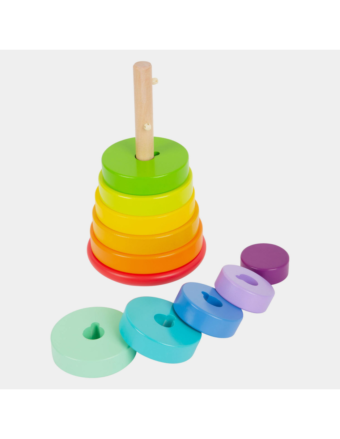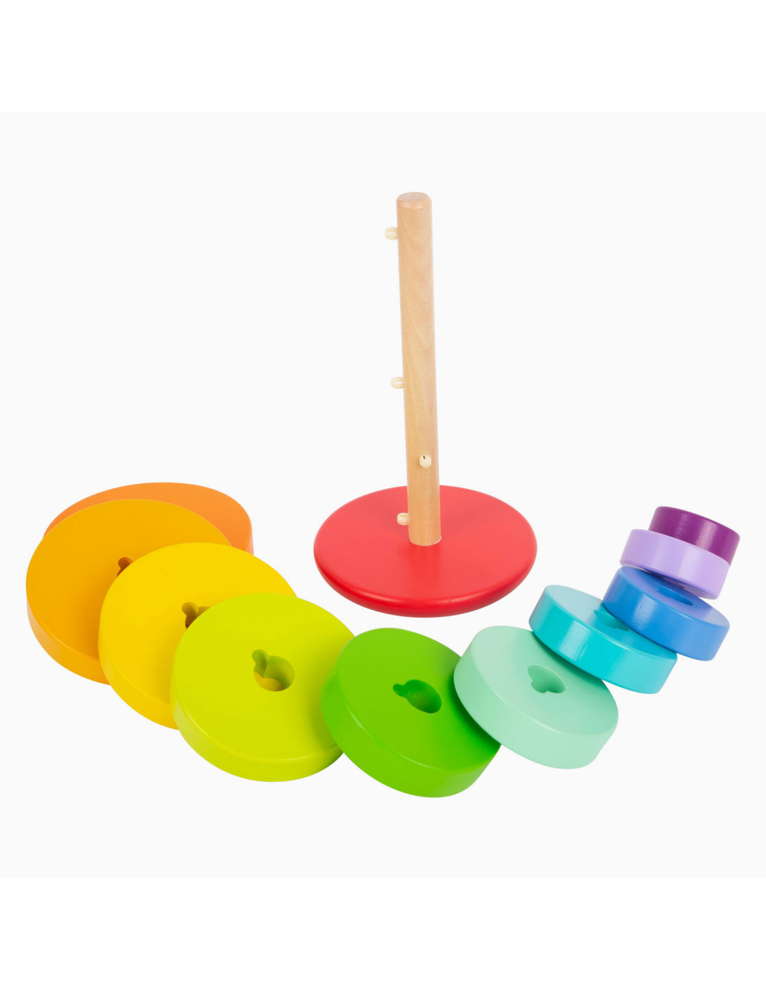 Stapelen maar! Deze grote houten stapeltoren in regenboogkleuren maakt indruk met een extra taak: de houten schijven van verschillende grootte moeten niet alleen in de juiste volgorde op de paal worden geschoven, maar ook in de juiste positie worden gedraaid zodat de openingen in de schijven op elkaar aansluiten met de positie van de kleine pinnen op de paal. Het is een lastige taak die fijne motoriek en probleemoplossend vermogen traint! Door de afgeronde basis kan de voltooide stapeltoren wiebelen als leuke beloning.