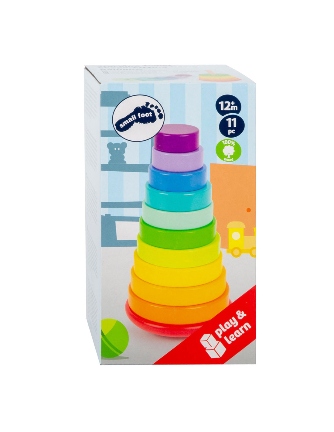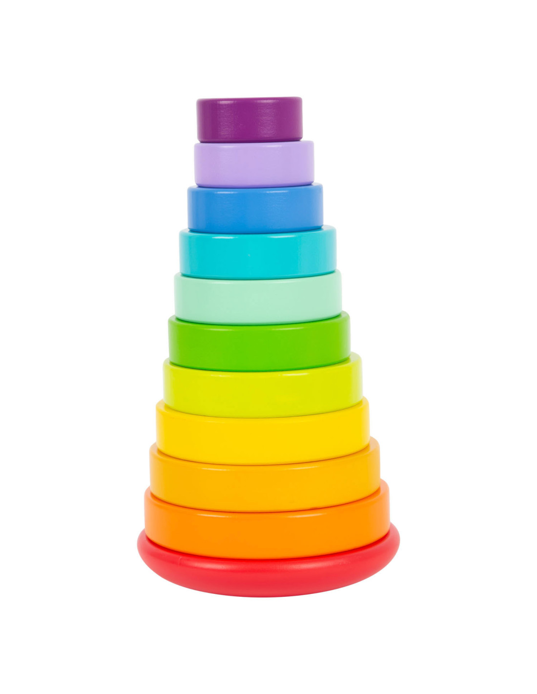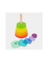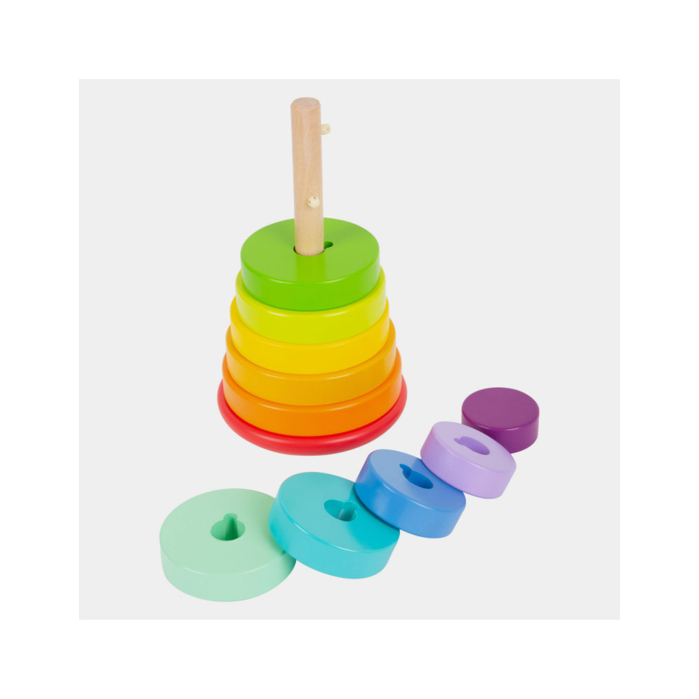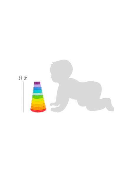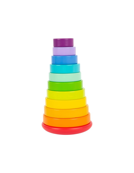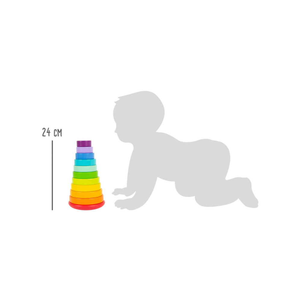 Stapelen maar! Deze grote houten stapeltoren in regenboogkleuren maakt indruk met een extra taak: de houten schijven van verschillende grootte moeten niet alleen in de juiste volgorde op de paal worden geschoven, maar ook in de juiste positie worden gedraaid zodat de openingen in de schijven op elkaar aansluiten met de positie van de kleine pinnen op de paal. Het is een lastige taak die fijne motoriek en probleemoplossend vermogen traint! Door de afgeronde basis kan de voltooide stapeltoren wiebelen als leuke beloning.