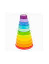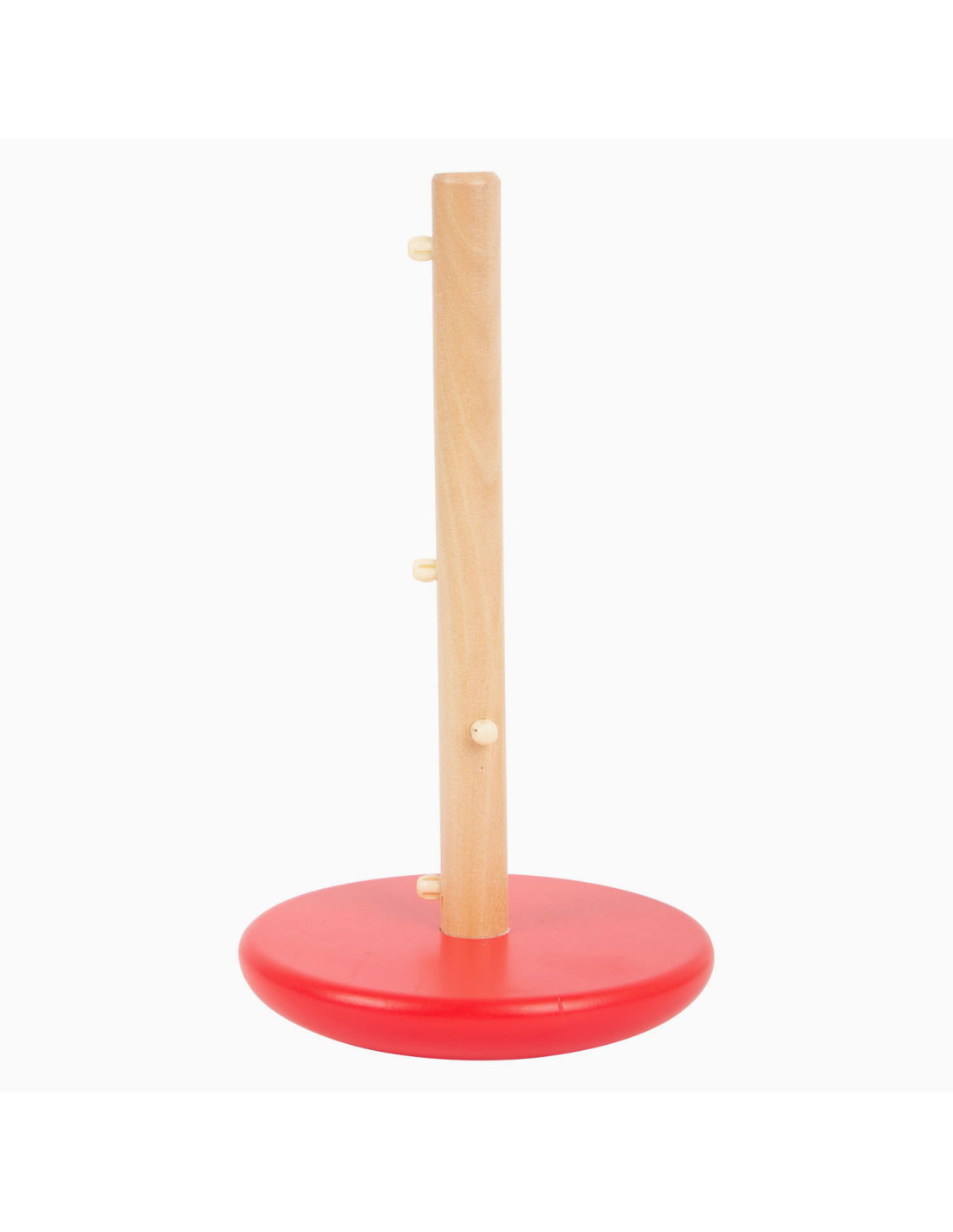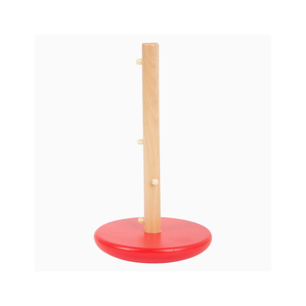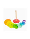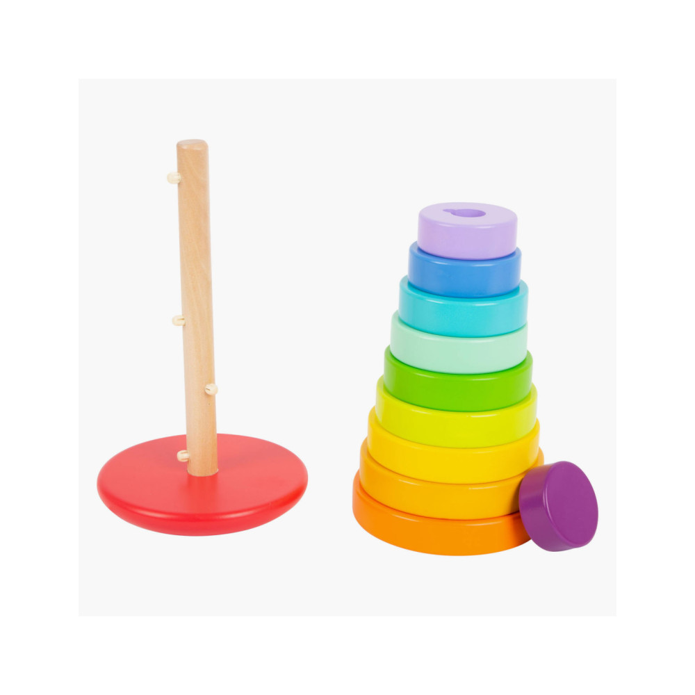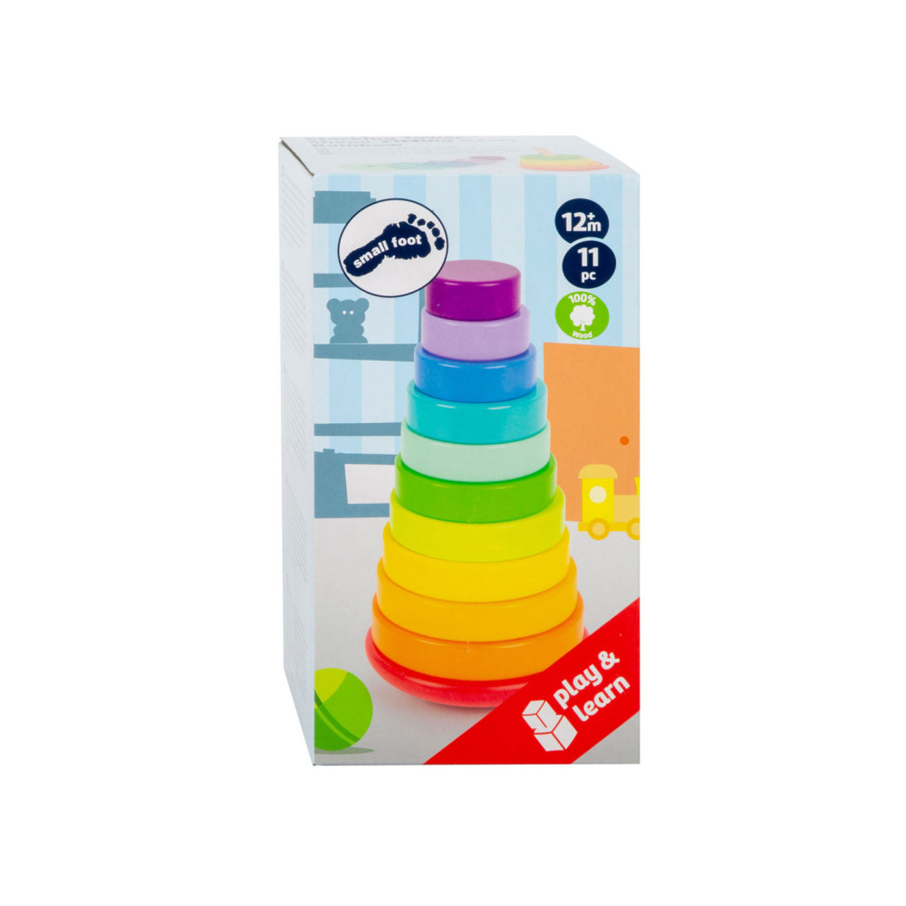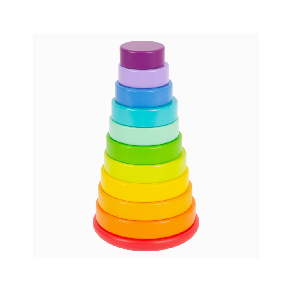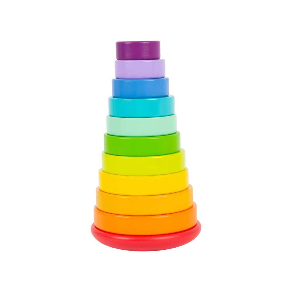 Stapelen maar! Deze grote houten stapeltoren in regenboogkleuren maakt indruk met een extra taak: de houten schijven van verschillende grootte moeten niet alleen in de juiste volgorde op de paal worden geschoven, maar ook in de juiste positie worden gedraaid zodat de openingen in de schijven op elkaar aansluiten met de positie van de kleine pinnen op de paal. Het is een lastige taak die fijne motoriek en probleemoplossend vermogen traint! Door de afgeronde basis kan de voltooide stapeltoren wiebelen als leuke beloning.