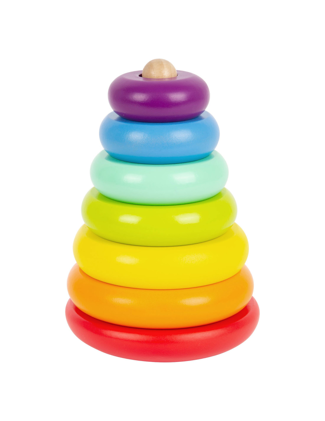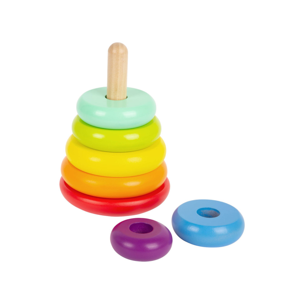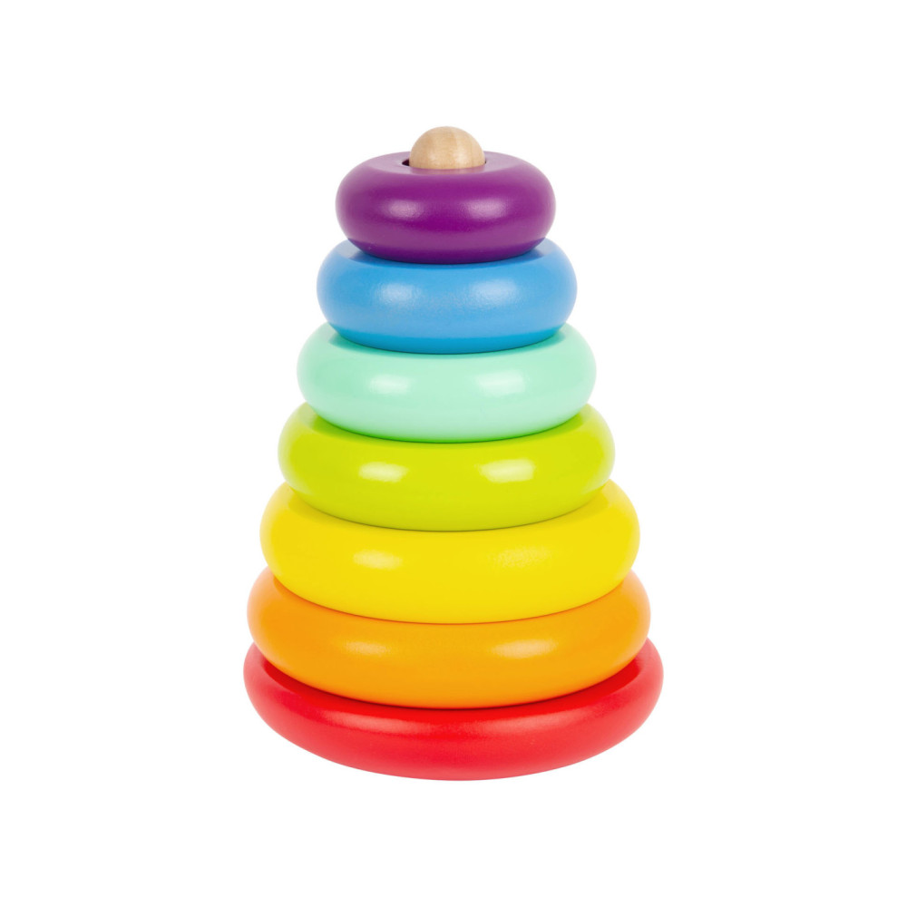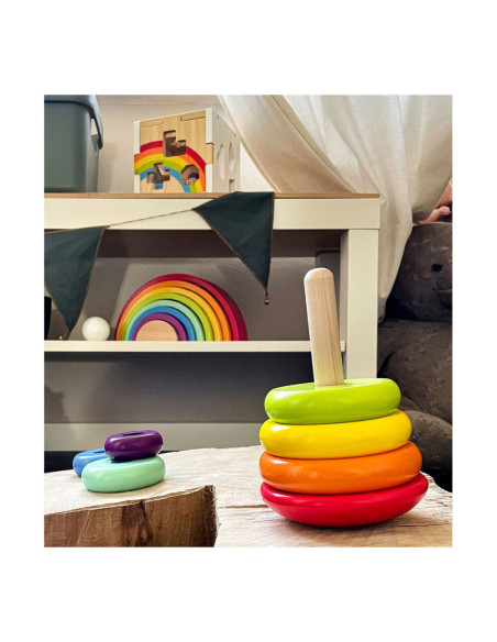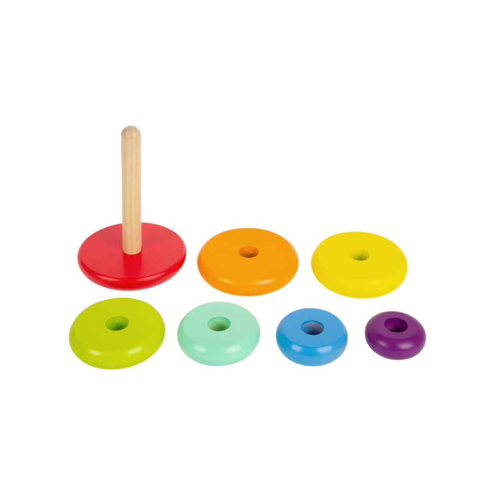 Een regenboog om te stapelen en in te steken! Deze stapeltoren schittert met felle regenboogkleuren en het houten materiaal dat gemakkelijk vast te houden is, moedigt zelfs de jongste kinderen aan om de verschillend gekleurde ringen te sorteren op grootte en kleur. Dit traint motoriek, oog-handcoördinatie en begrip van vormen en maten. De afgeronde voet die de stapeltoren heen en weer laat zwaaien zorgt voor extra speelplezier.