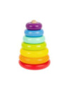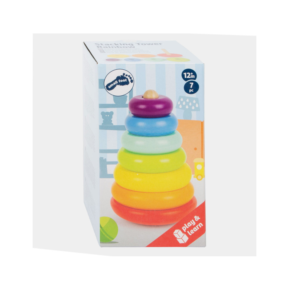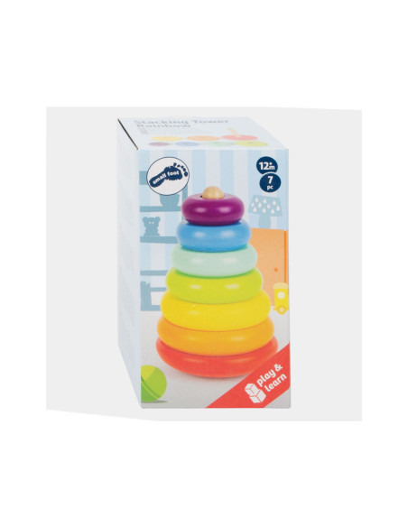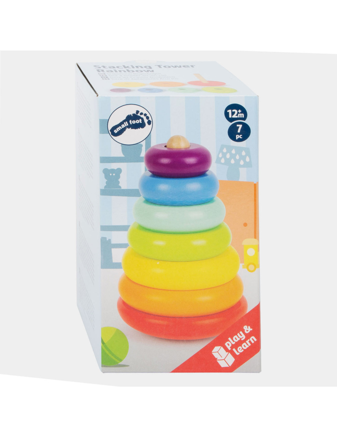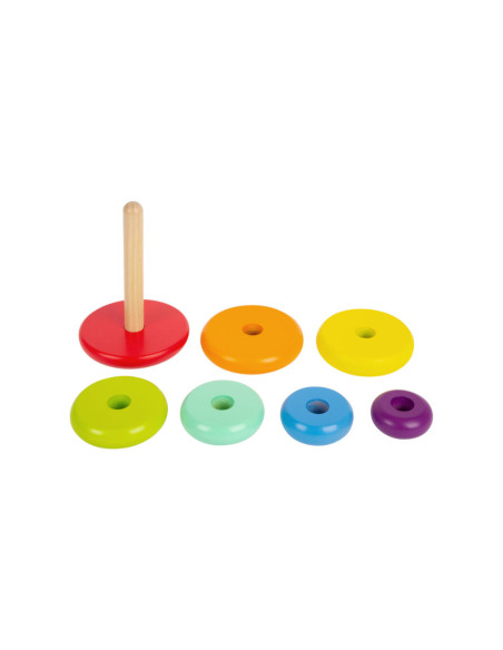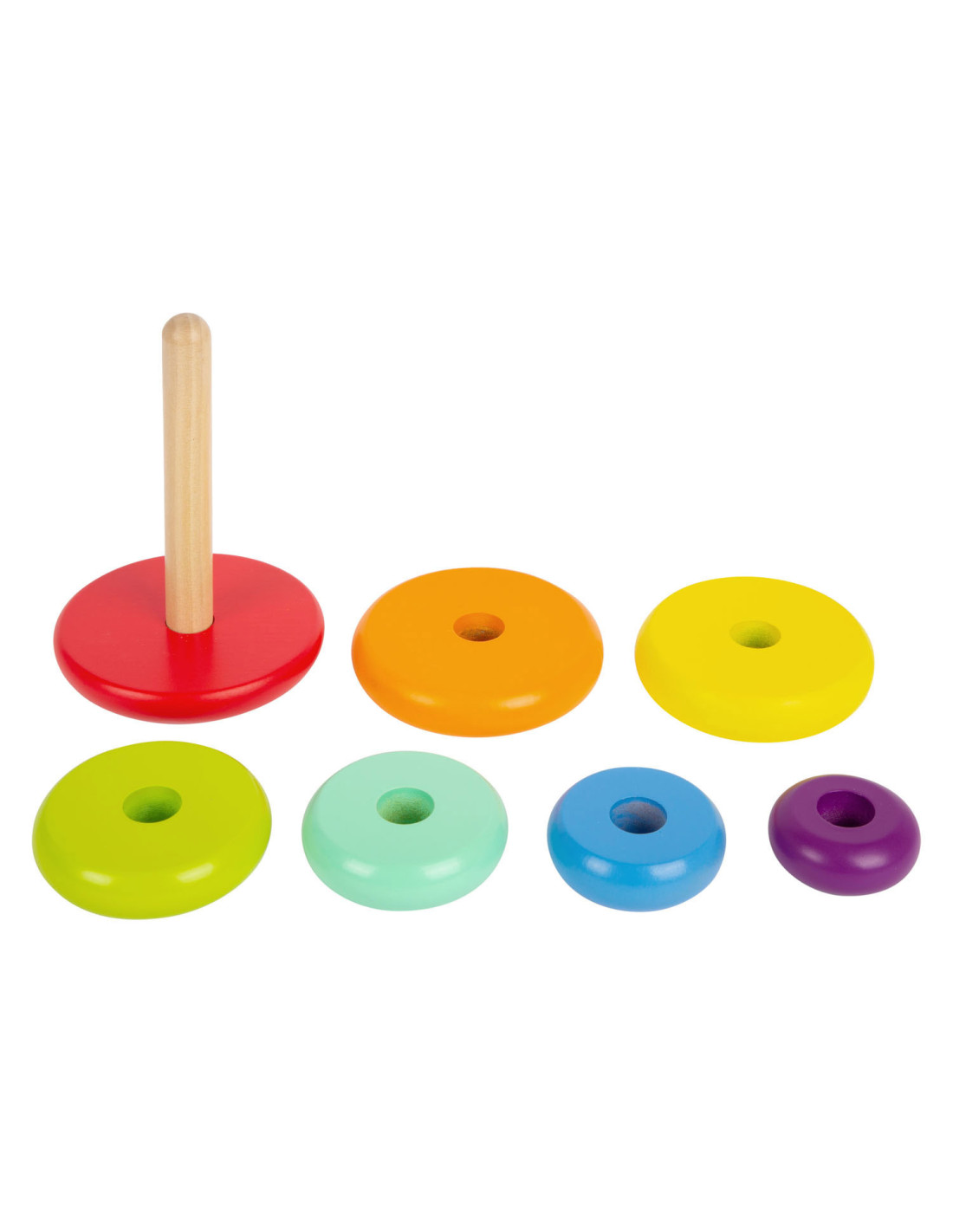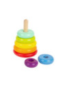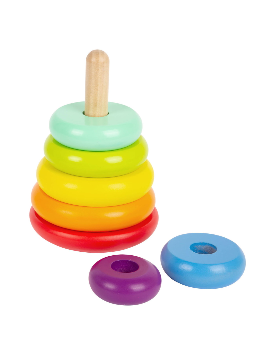 Een regenboog om te stapelen en in te steken! Deze stapeltoren schittert met felle regenboogkleuren en het houten materiaal dat gemakkelijk vast te houden is, moedigt zelfs de jongste kinderen aan om de verschillend gekleurde ringen te sorteren op grootte en kleur. Dit traint motoriek, oog-handcoördinatie en begrip van vormen en maten. De afgeronde voet die de stapeltoren heen en weer laat zwaaien zorgt voor extra speelplezier.